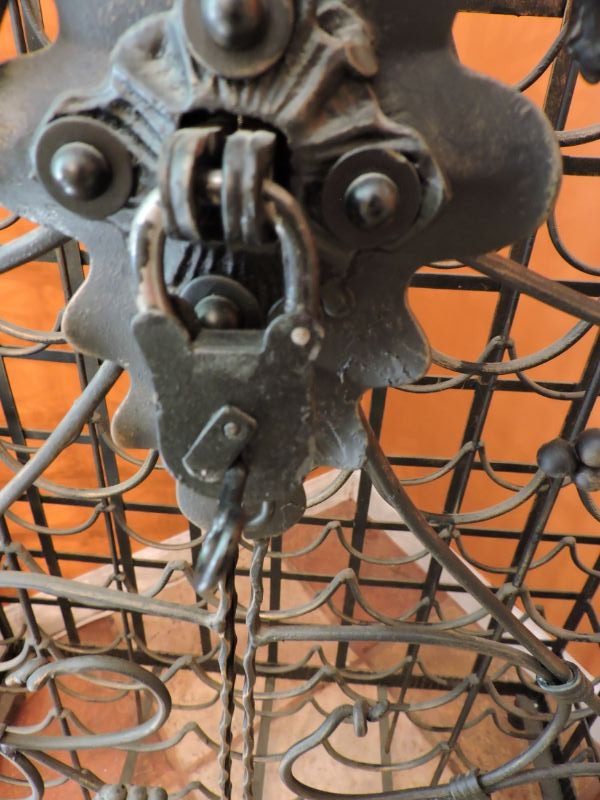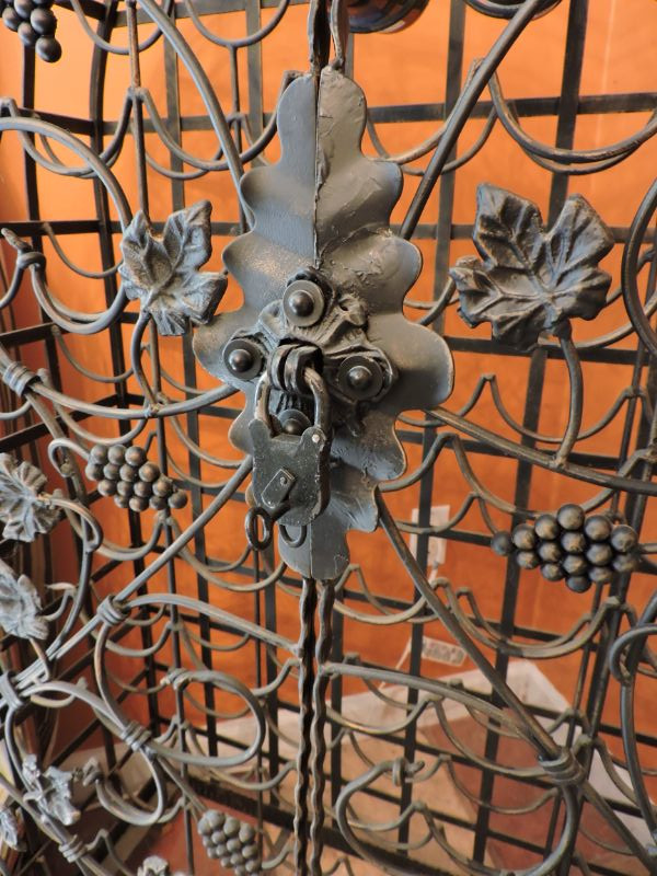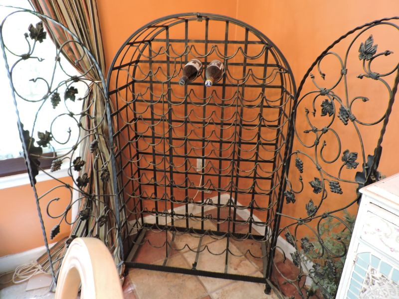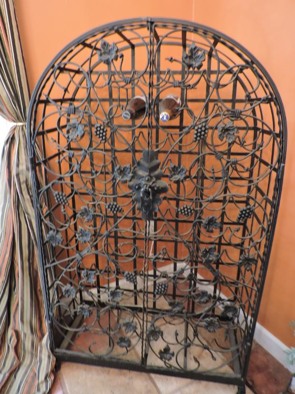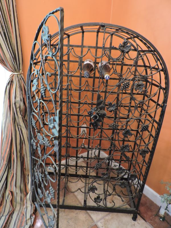 "This black metal wine rack features a vine pattern and holds 72 bottles of wine It is free standing and comes with a lock and key. Bottles cannot be removed while locked. 32”w x54”h x 14”d