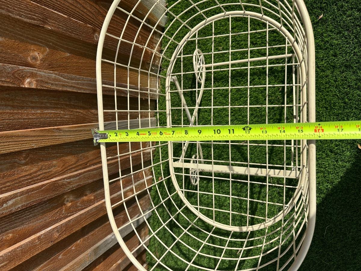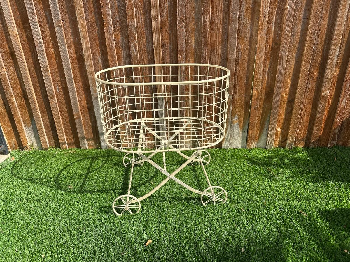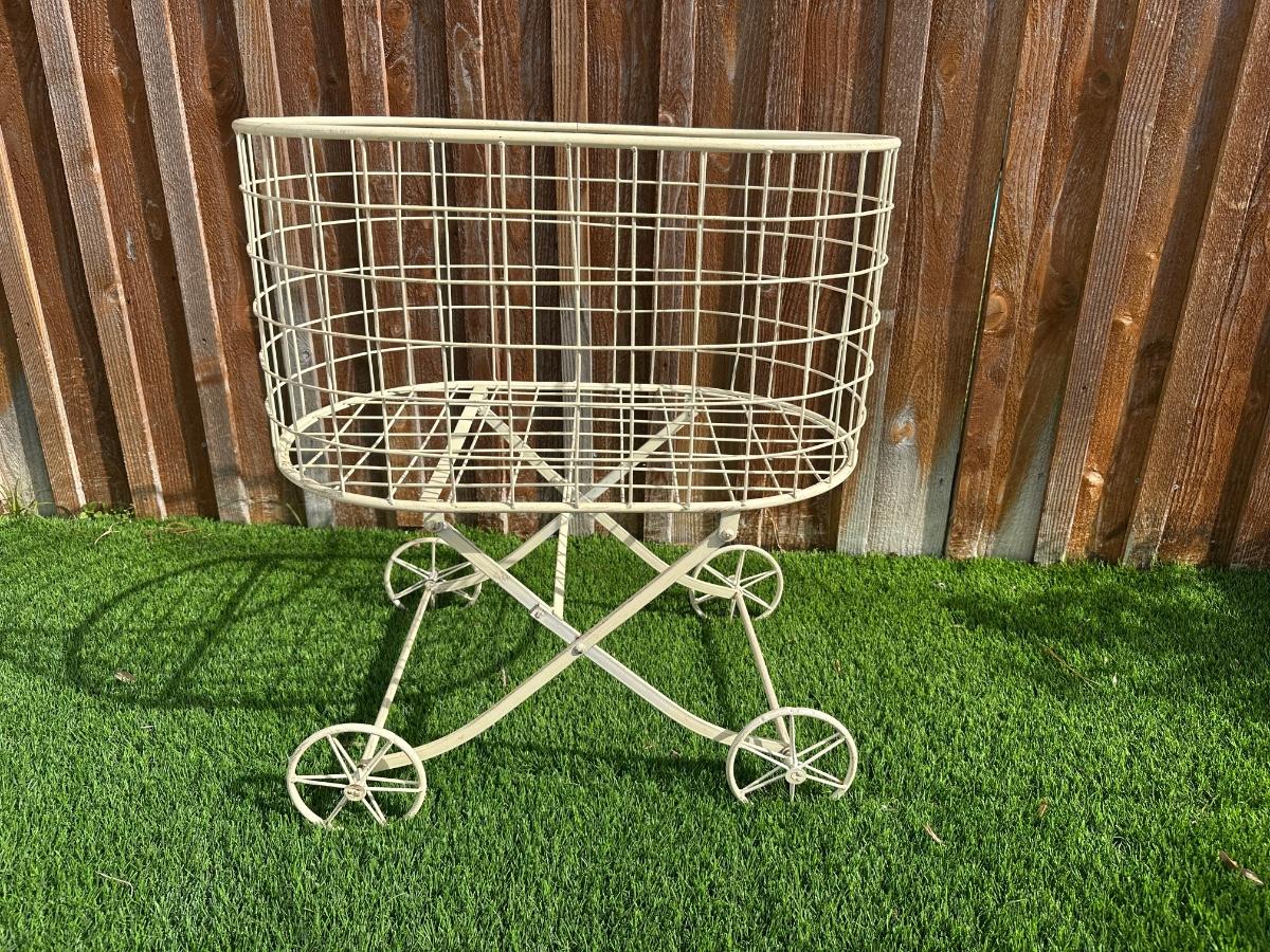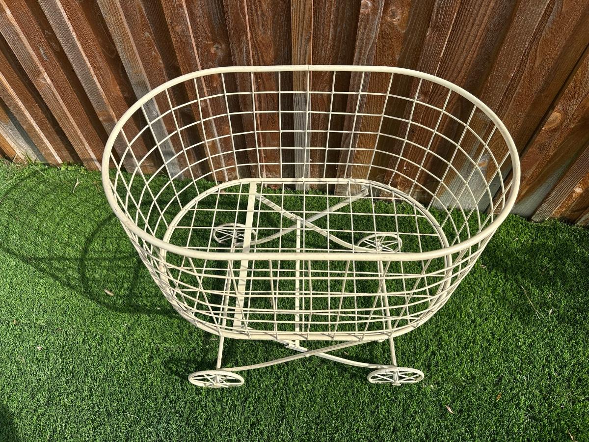 Metal wire basket cart with four spoked wheels and crossed base.