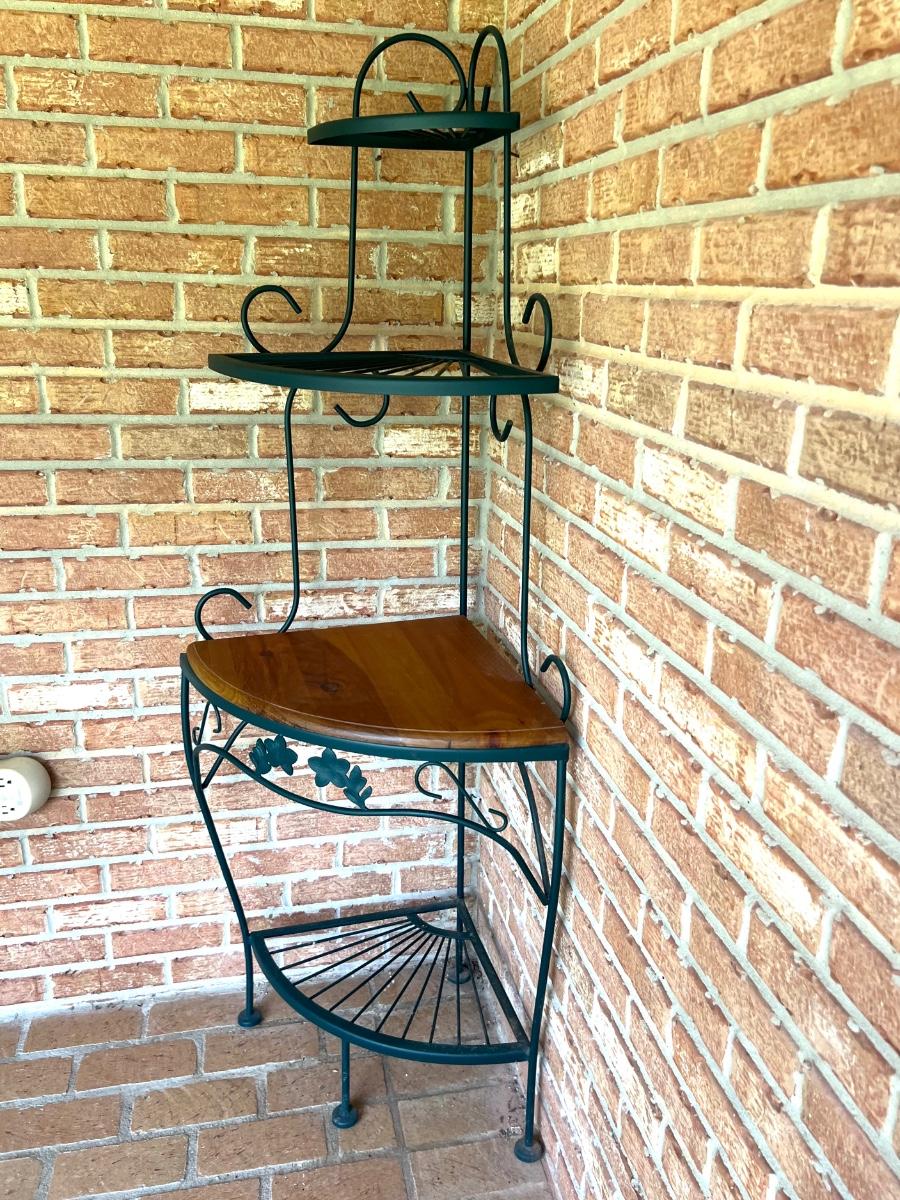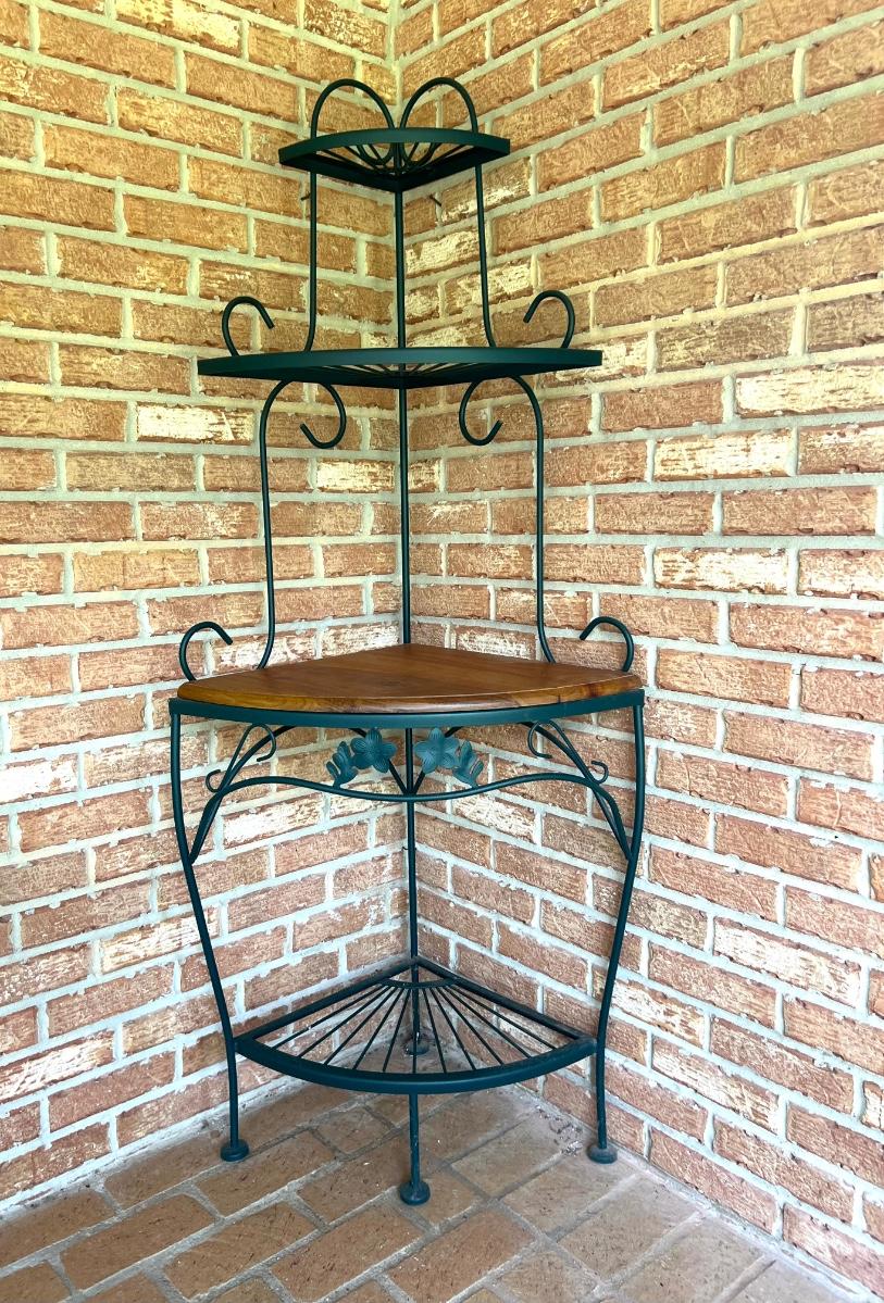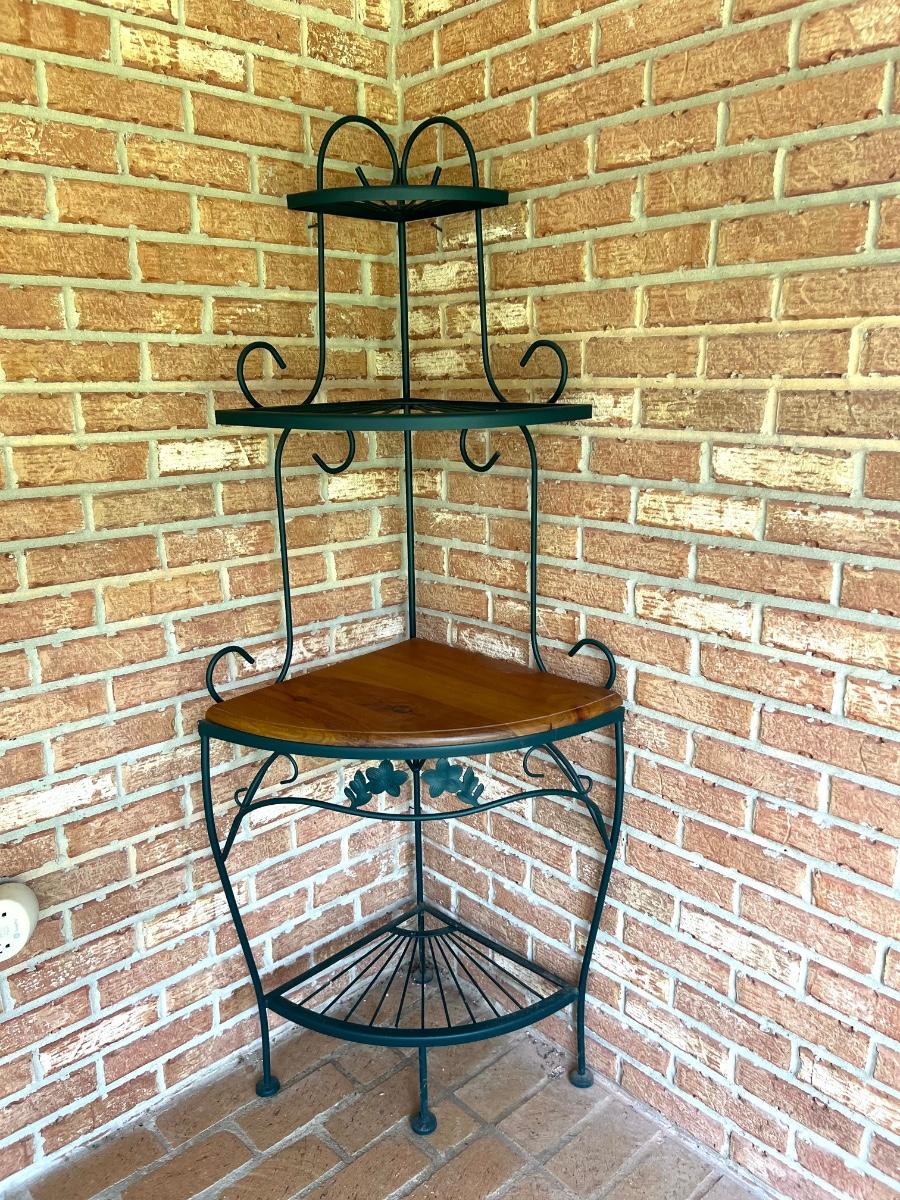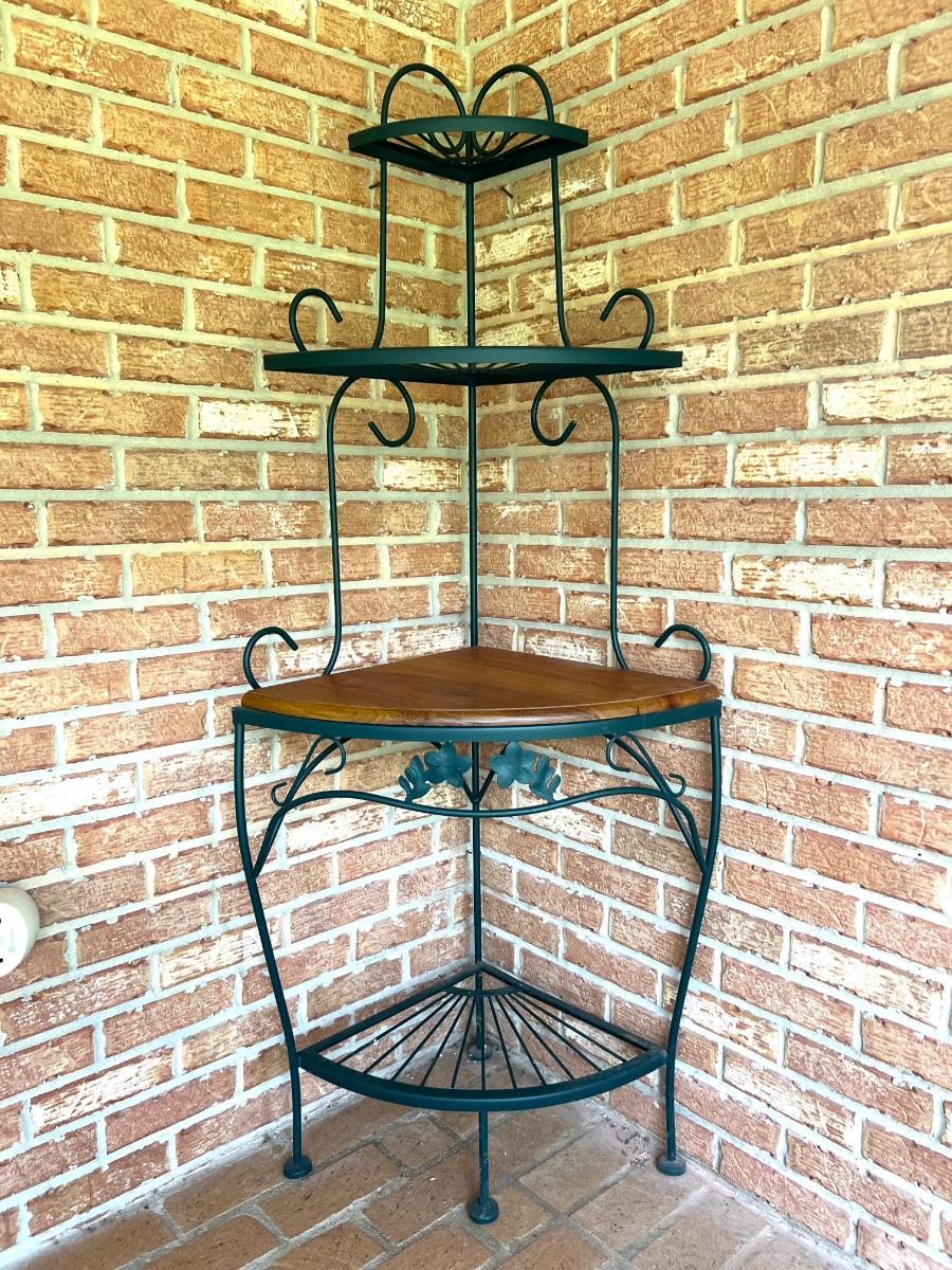Metal & Wood Corner Shelf with wood shelf. Metal is green in color. Has 4 shelves. Measure 63 inches tall and 25 inches wide.
