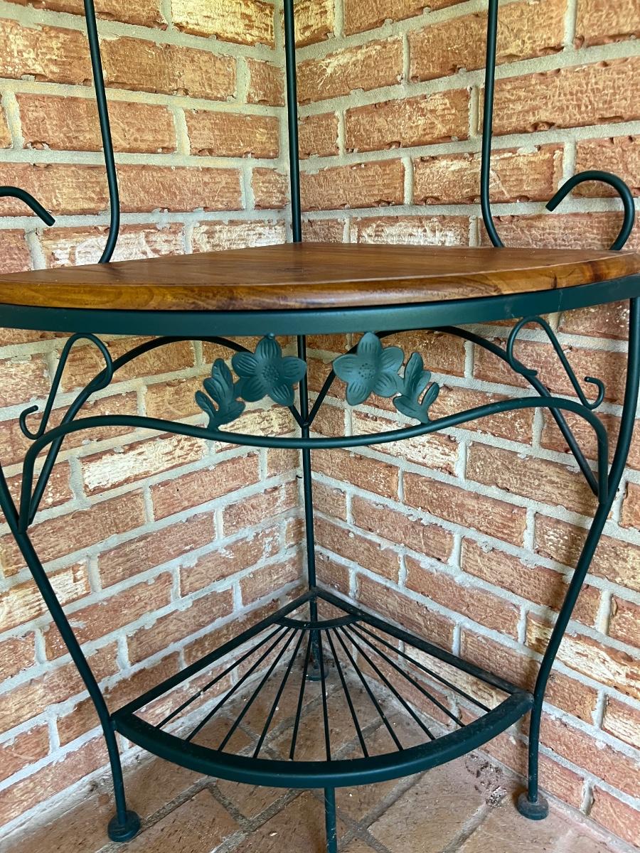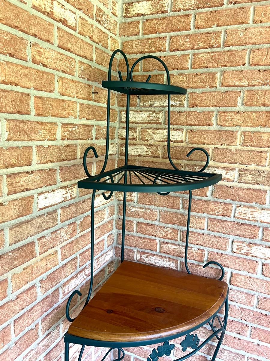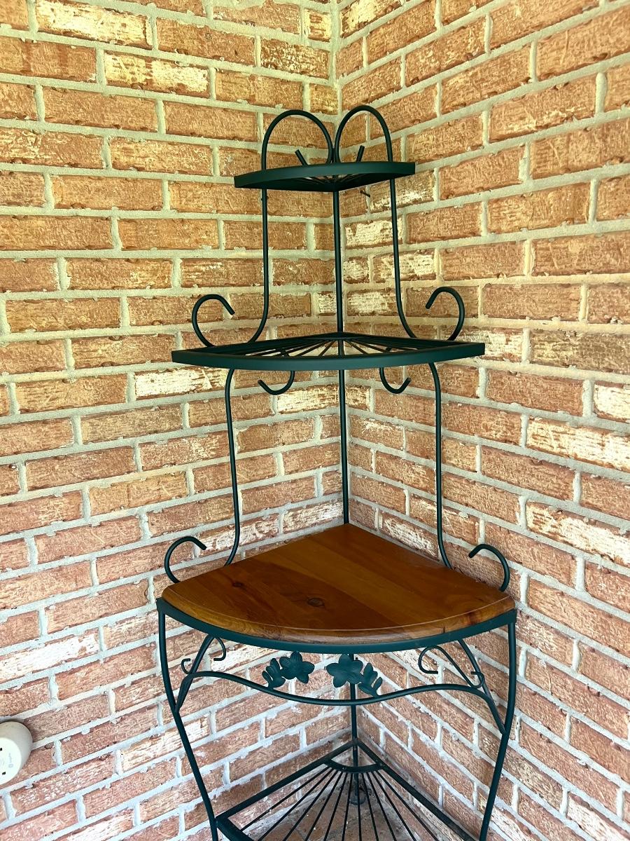 Metal & Wood Corner Shelf with wood shelf. Metal is green in color. Has 4 shelves. Measure 63 inches tall and 25 inches wide.