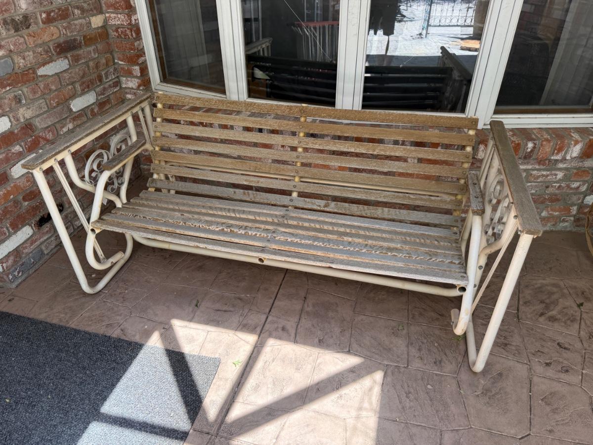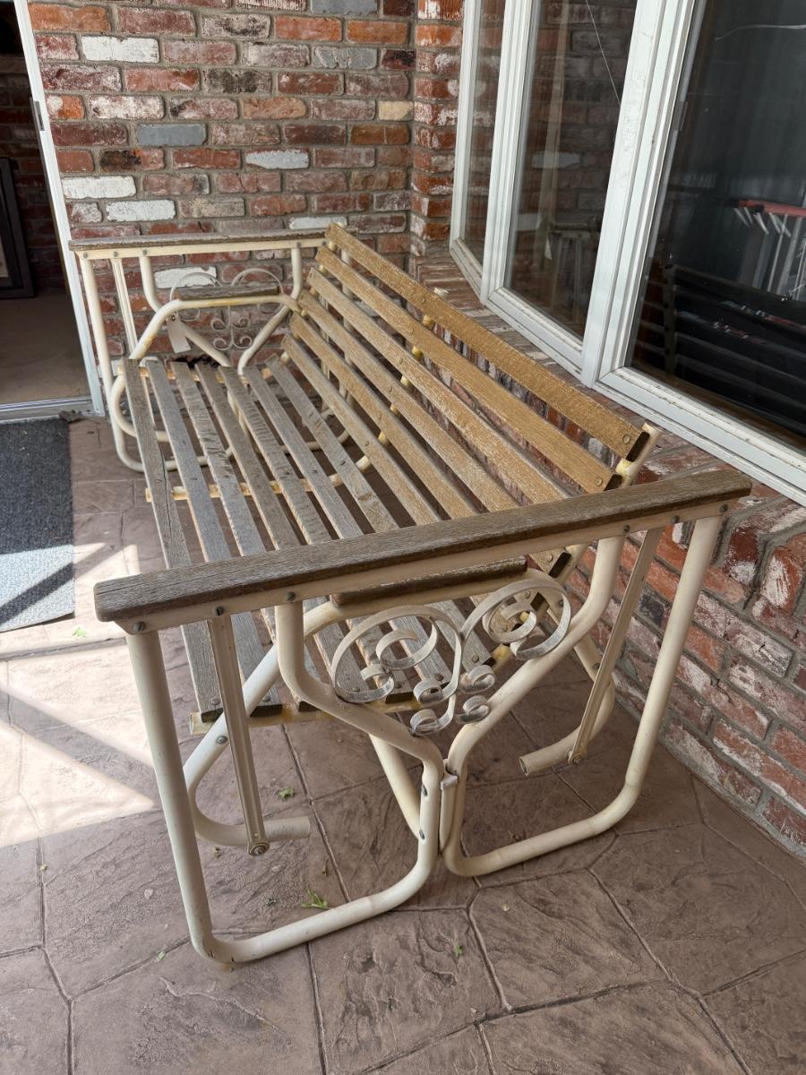 Metal & Wood outdoor rocking/swinging Chair. Could use good sanding and to be restained