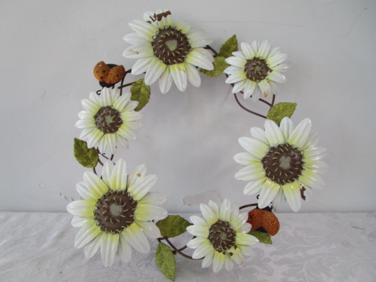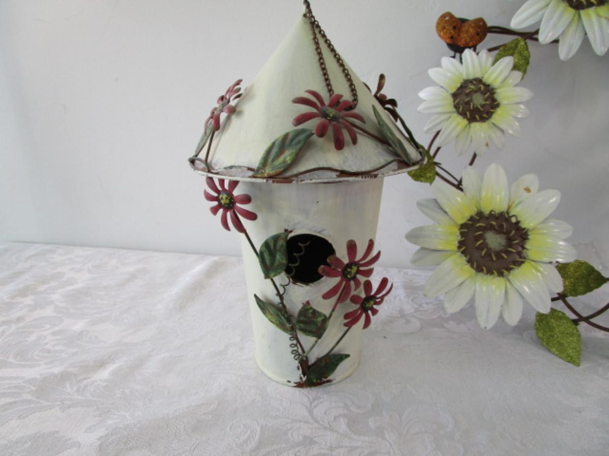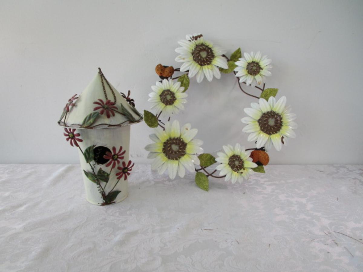 Wreath is 15-1/2" across, birdhouse is 10" tall See pictures