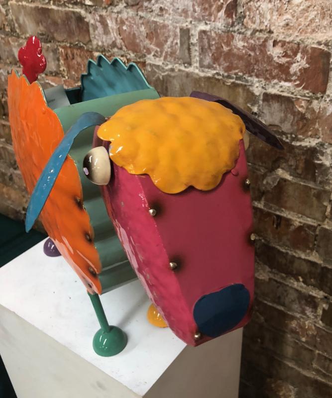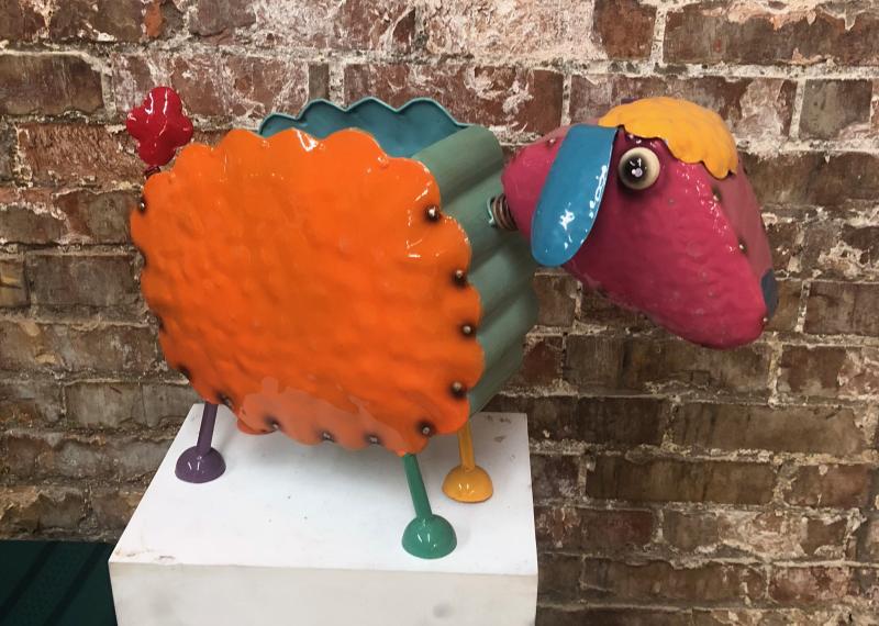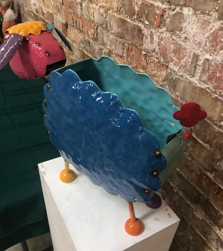 Here is a colorful metal art Sheep Planter in new condition with tags....14" high...