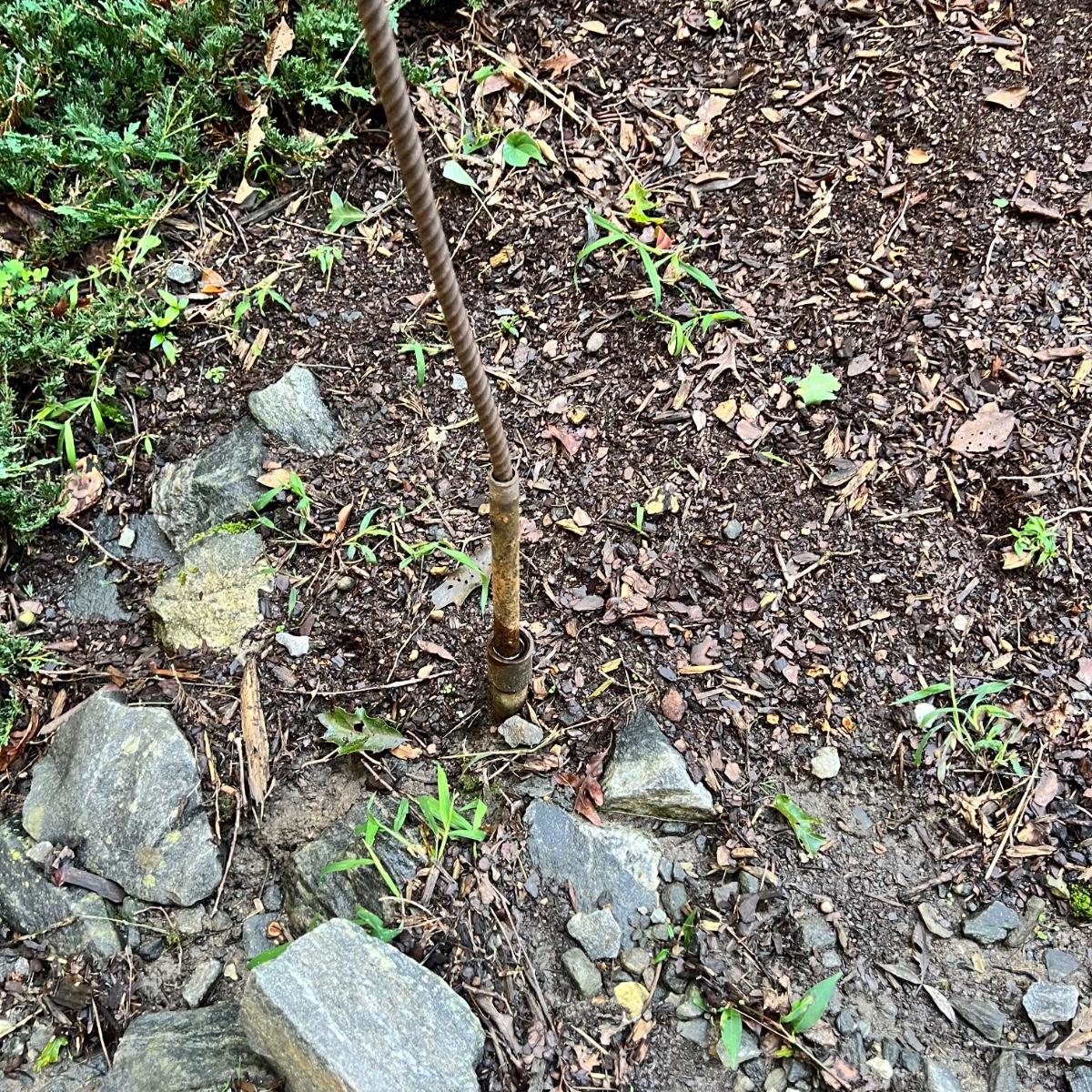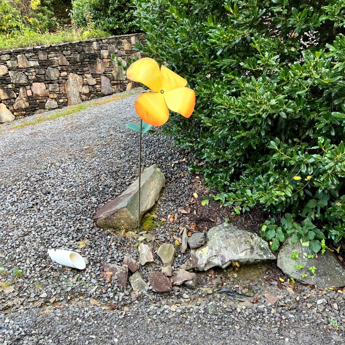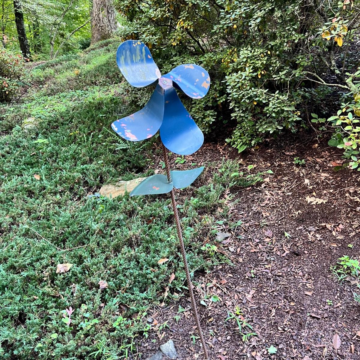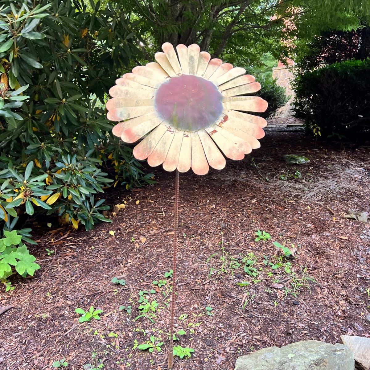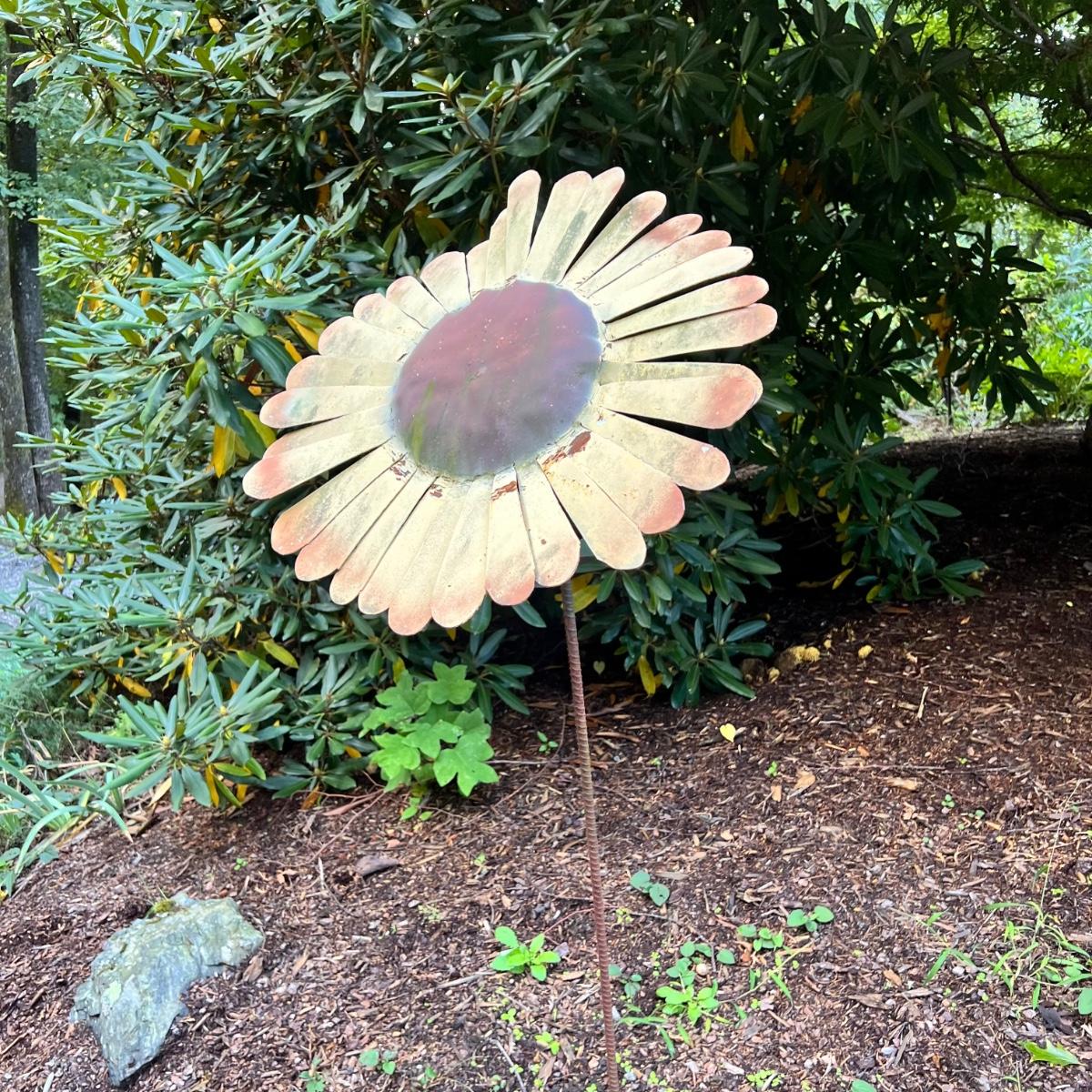 Five tall metal flowers with rebar stems. Each flower is approximately 64”H x 17”D. Any in-ground bases seen in the photos are not included. All flowers have been removed from the ground. Some rust and best metal parts.