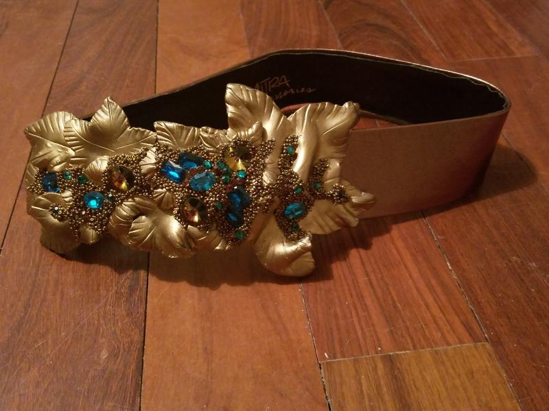 Amazing work of wearable Art in a leather belt that is heavily embellished with crystal stones copper statue and beads.