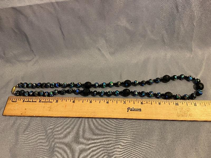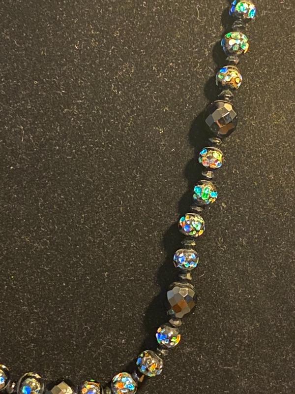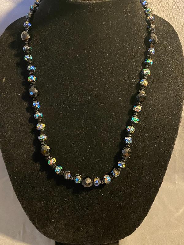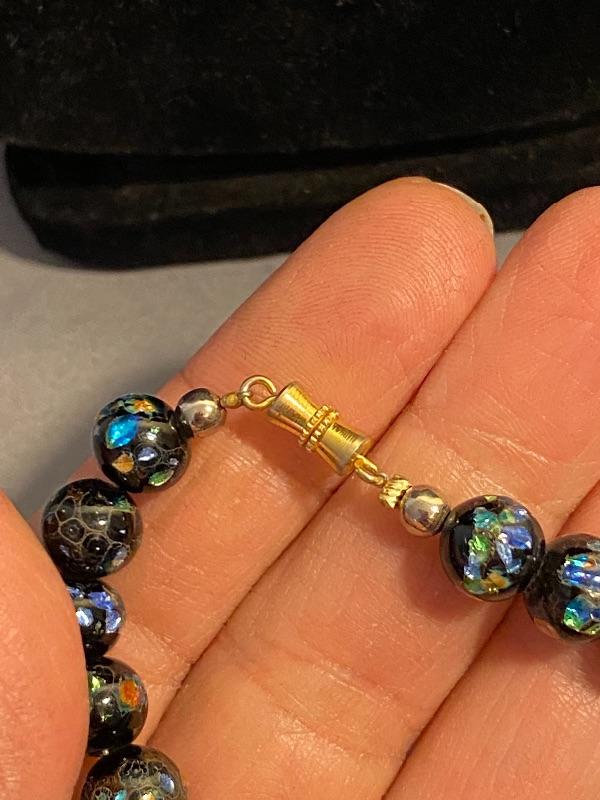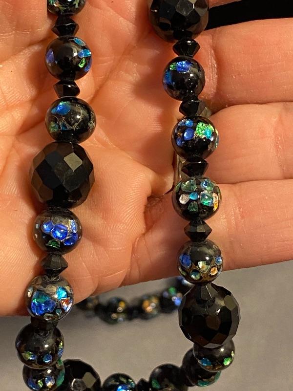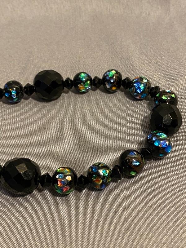Black art glass beaded necklace. Beads have metallic flecks in them, shining all sorts of colors, almost like black opals. Larger faceted black glass beads space throughout. Screw together clasp. Measures about 11".