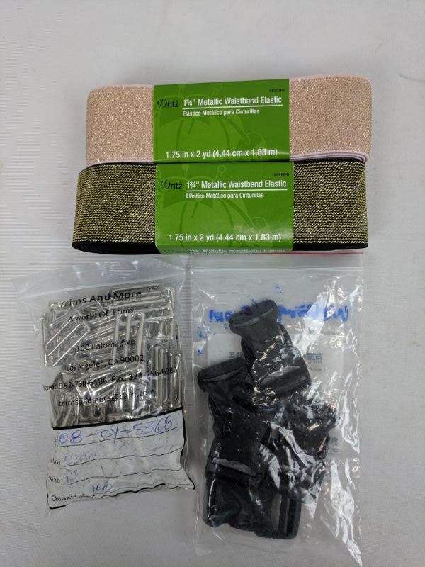 Metallic 1 3/4" Waistband Elastic: 1 Pink, 1 Black/Gold, 100 Silver Clasps & 5 Black Buckles - New