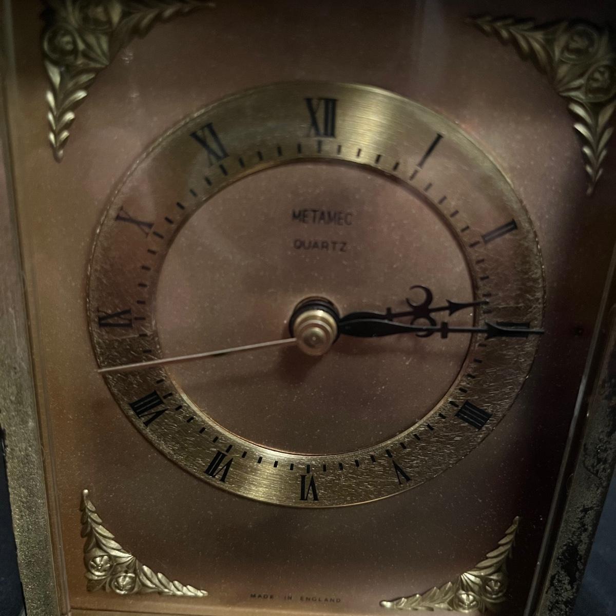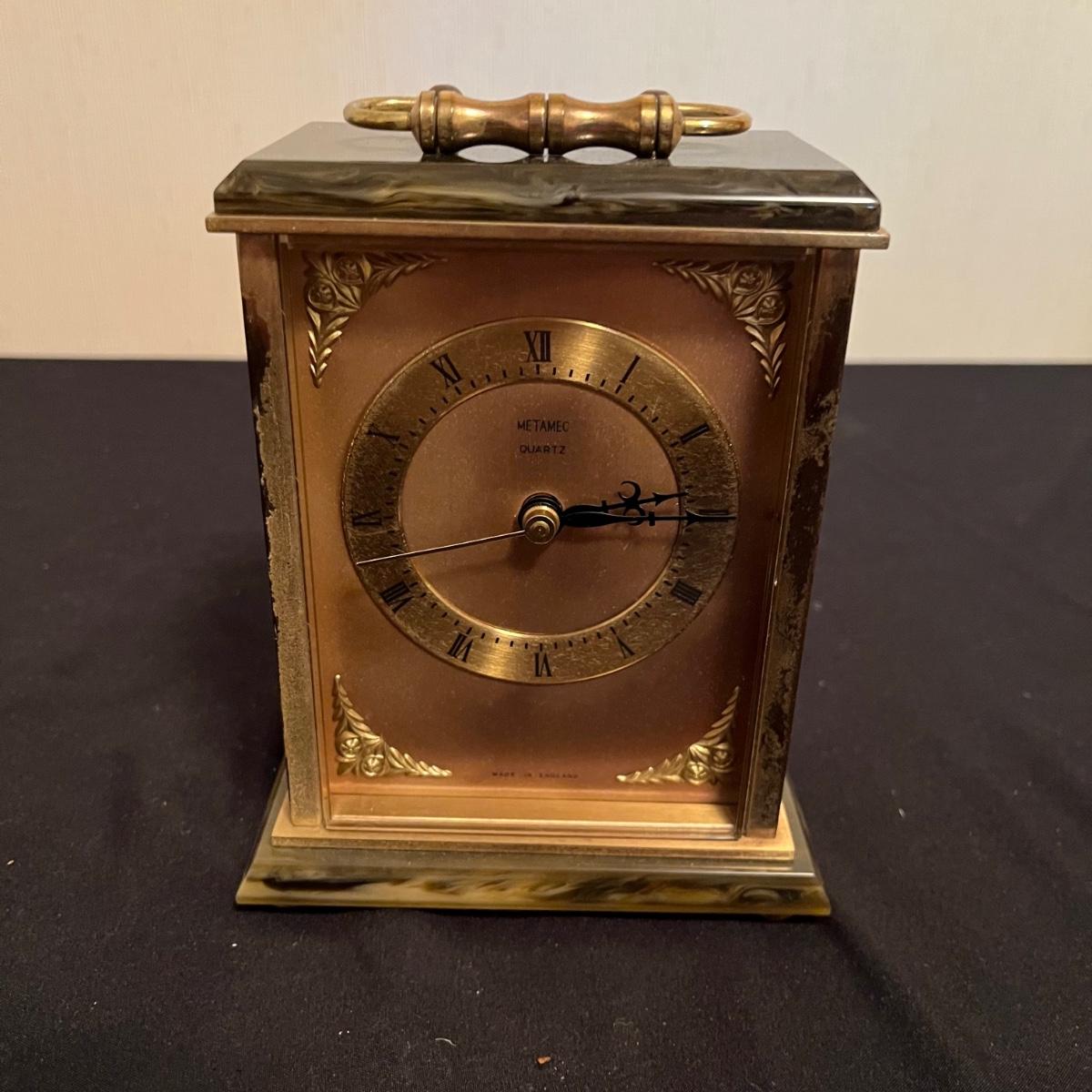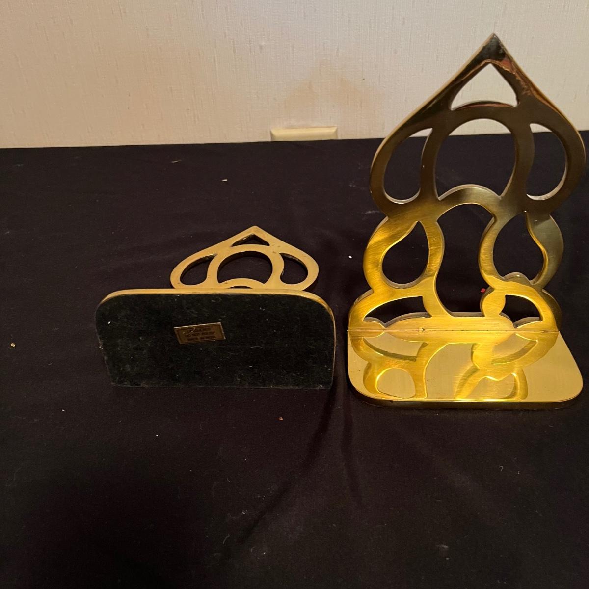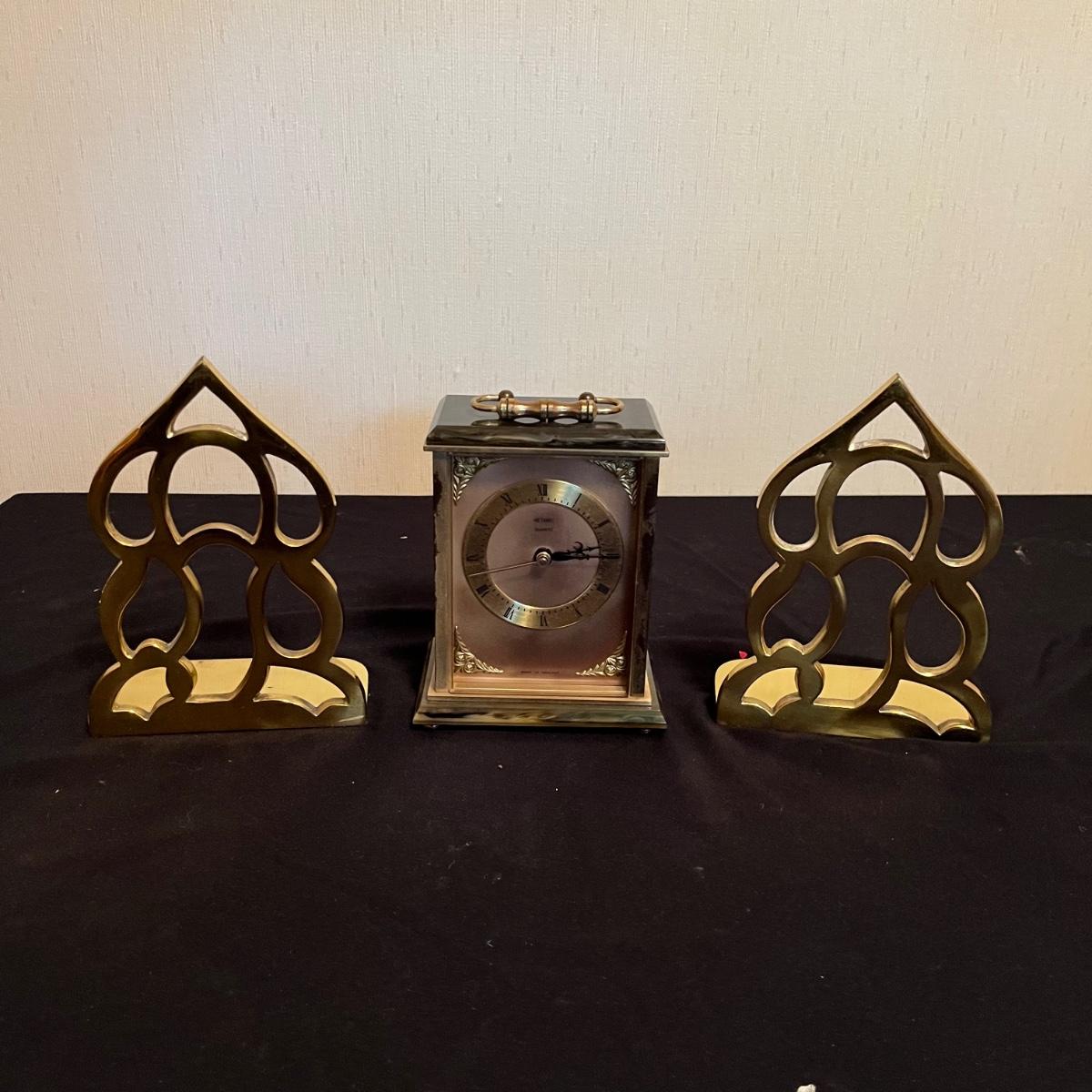 Lot includes a Made in England Quartz Metamec Clock with what appears to be stone top and base, clock was not tested as it needs new battery. Also includes two Indian brass bookends. Clock measures 3.25” x 4.75” x 6.5”.