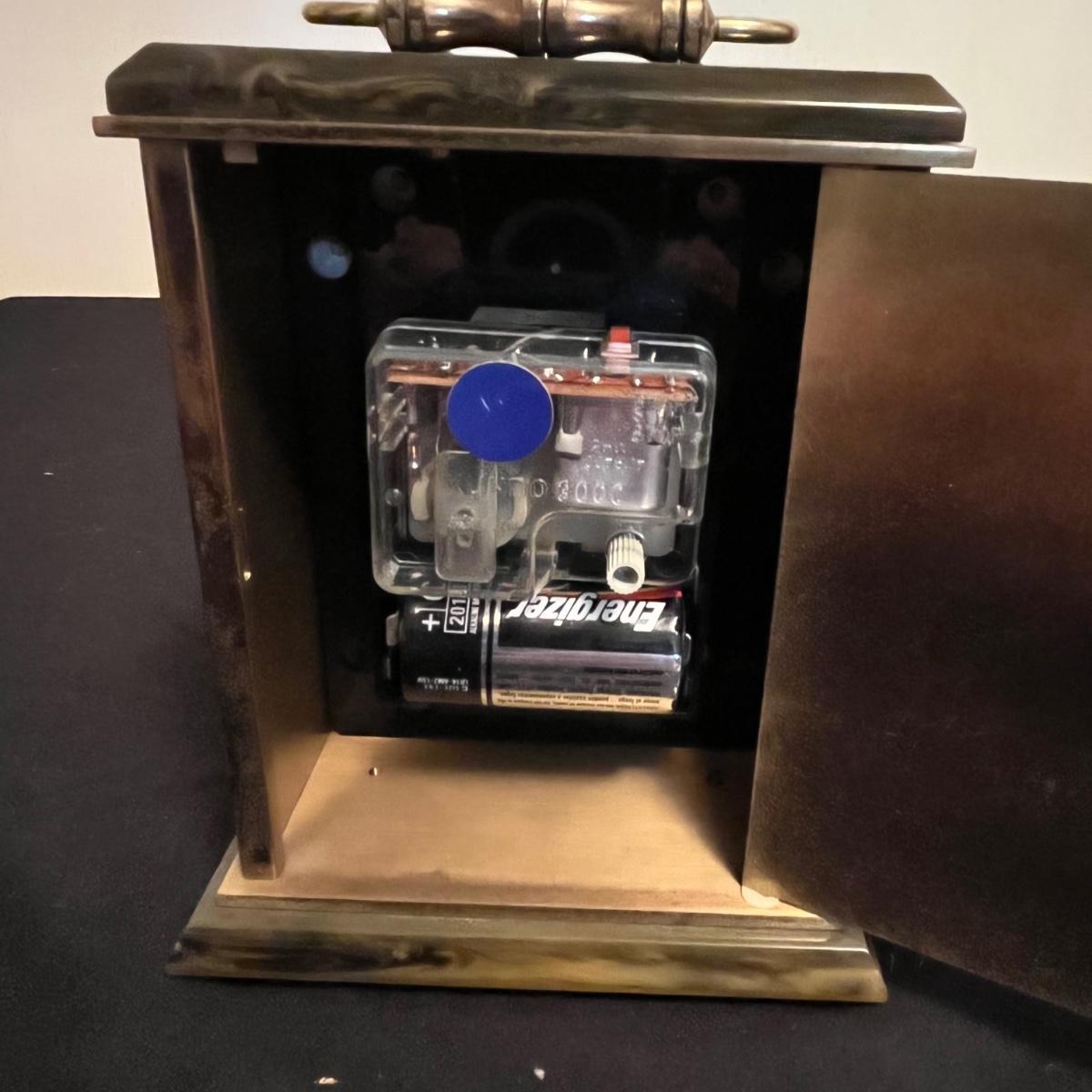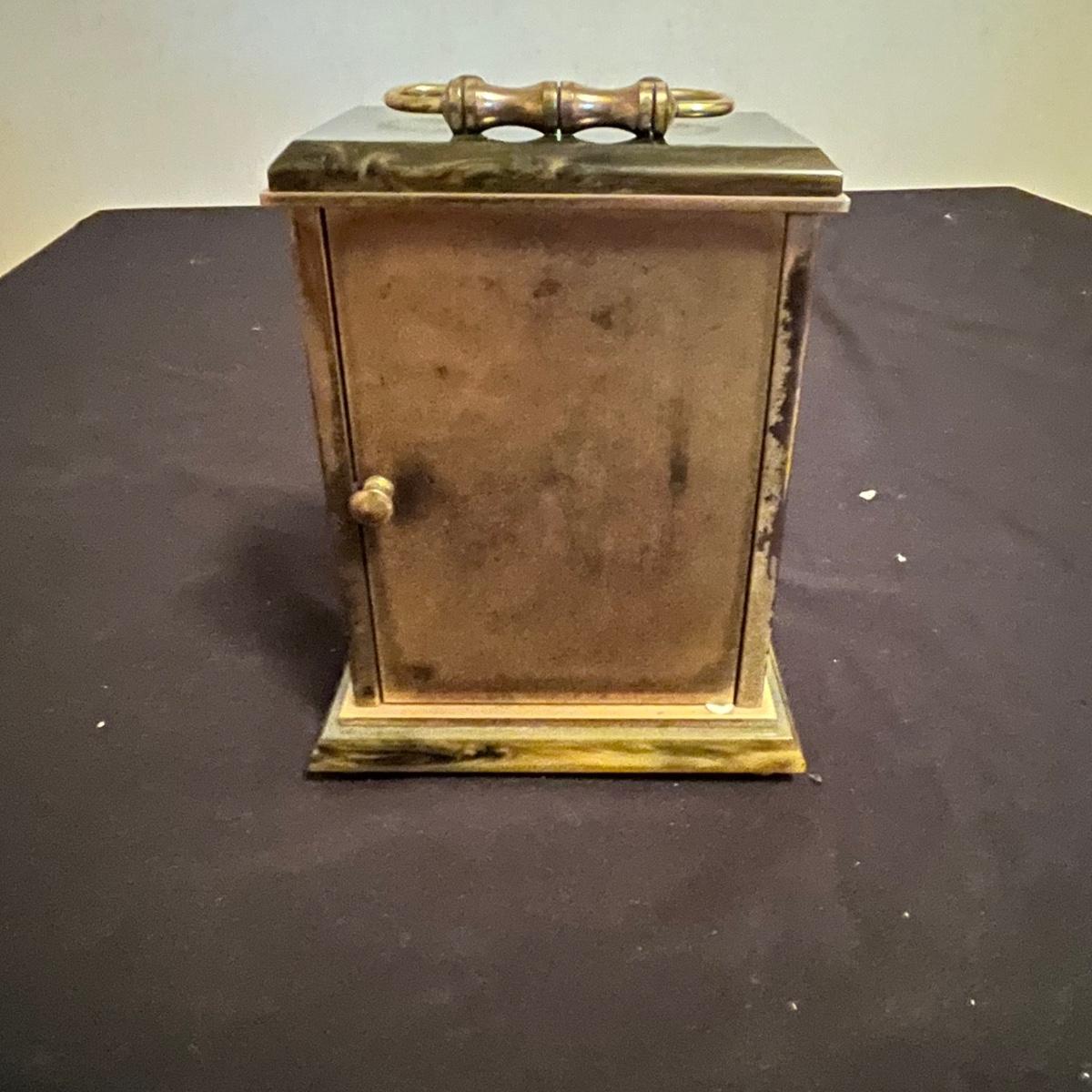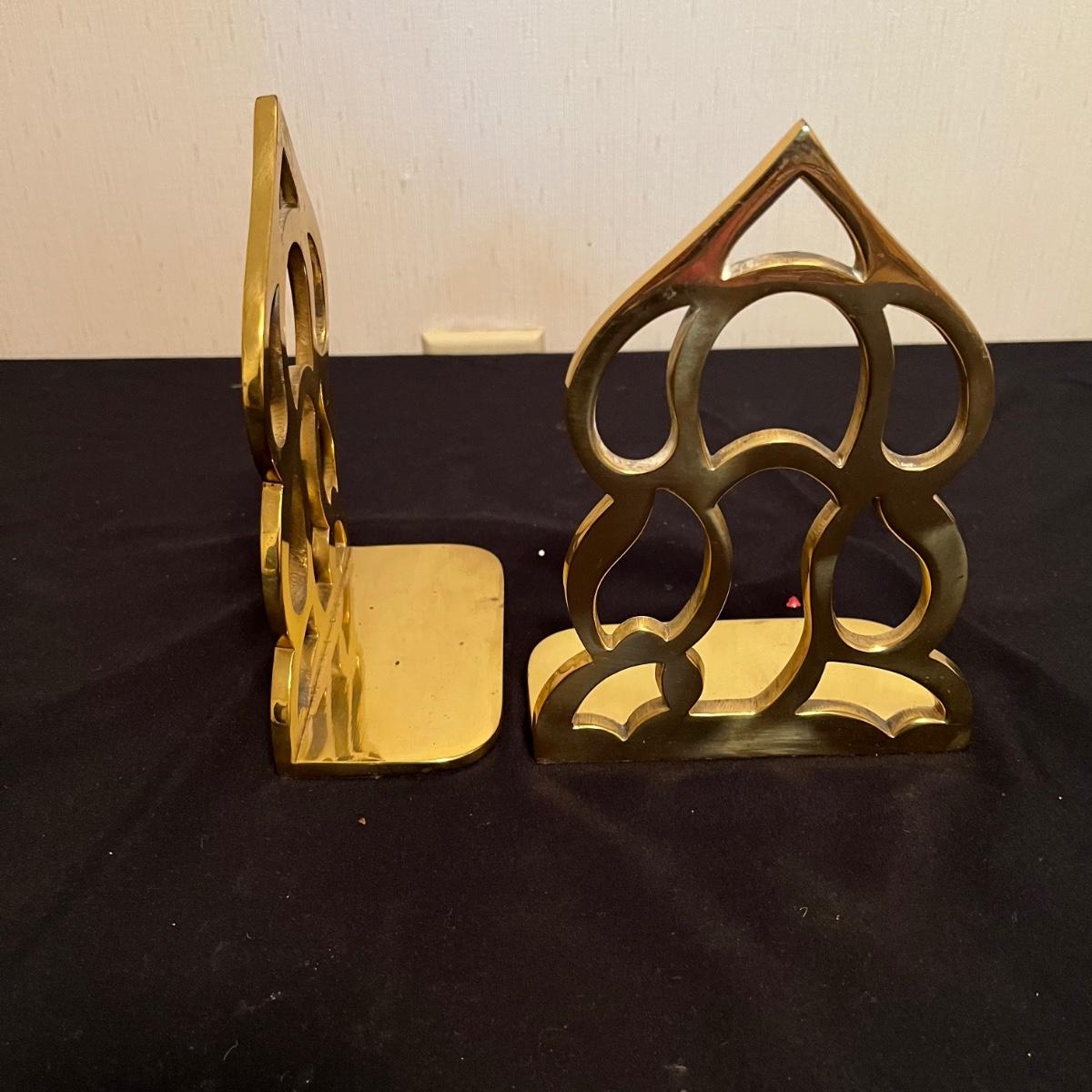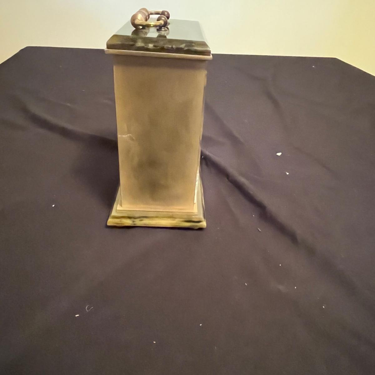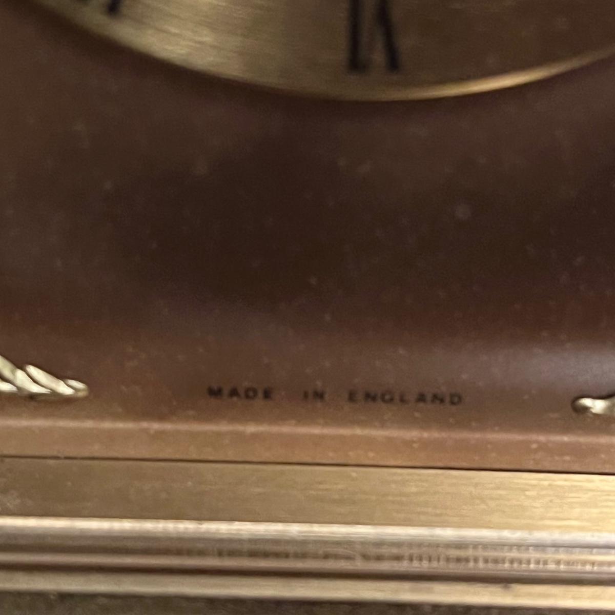 Lot includes a Made in England Quartz Metamec Clock with what appears to be stone top and base, clock was not tested as it needs new battery. Also includes two Indian brass bookends. Clock measures 3.25” x 4.75” x 6.5”.