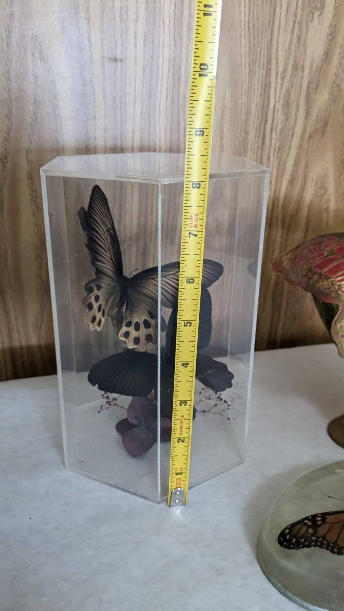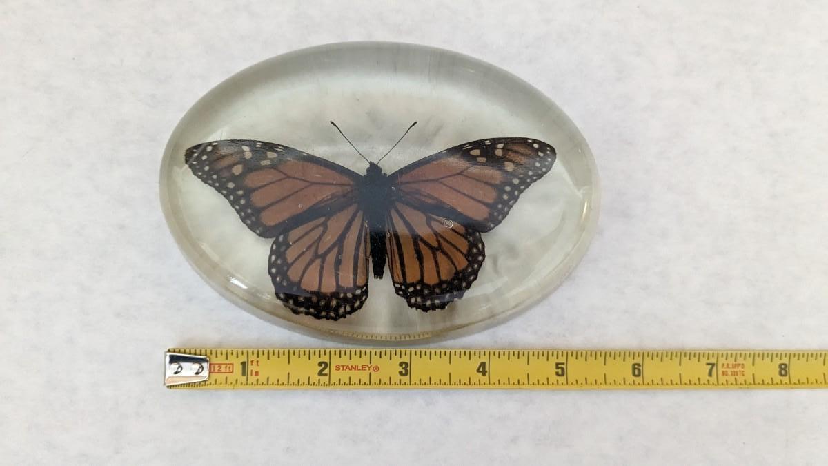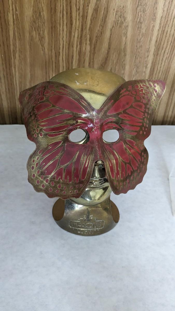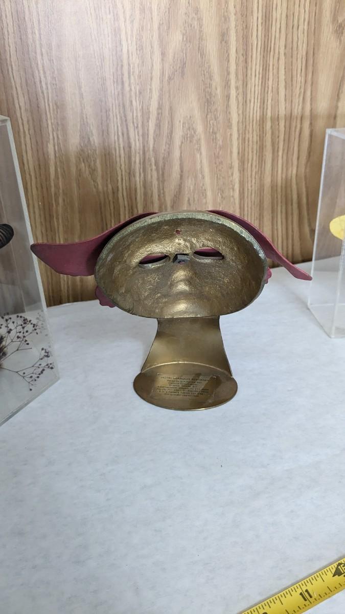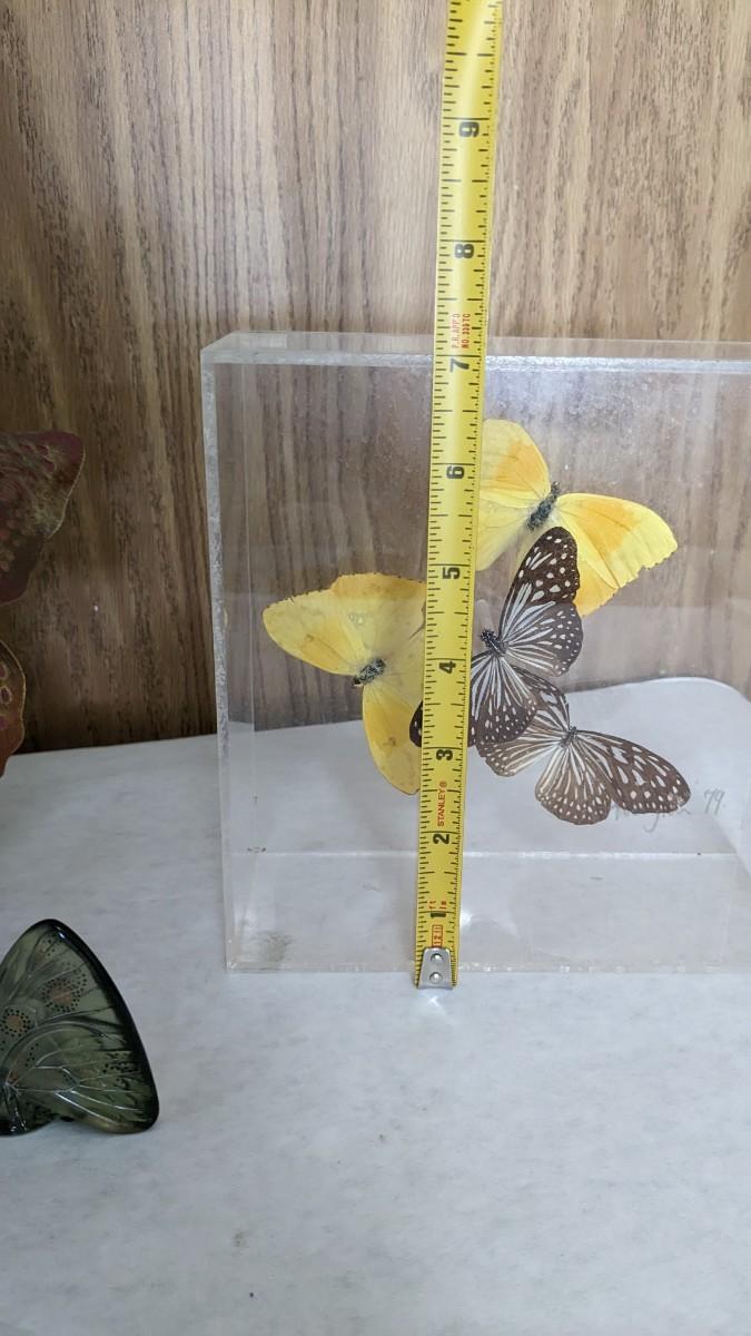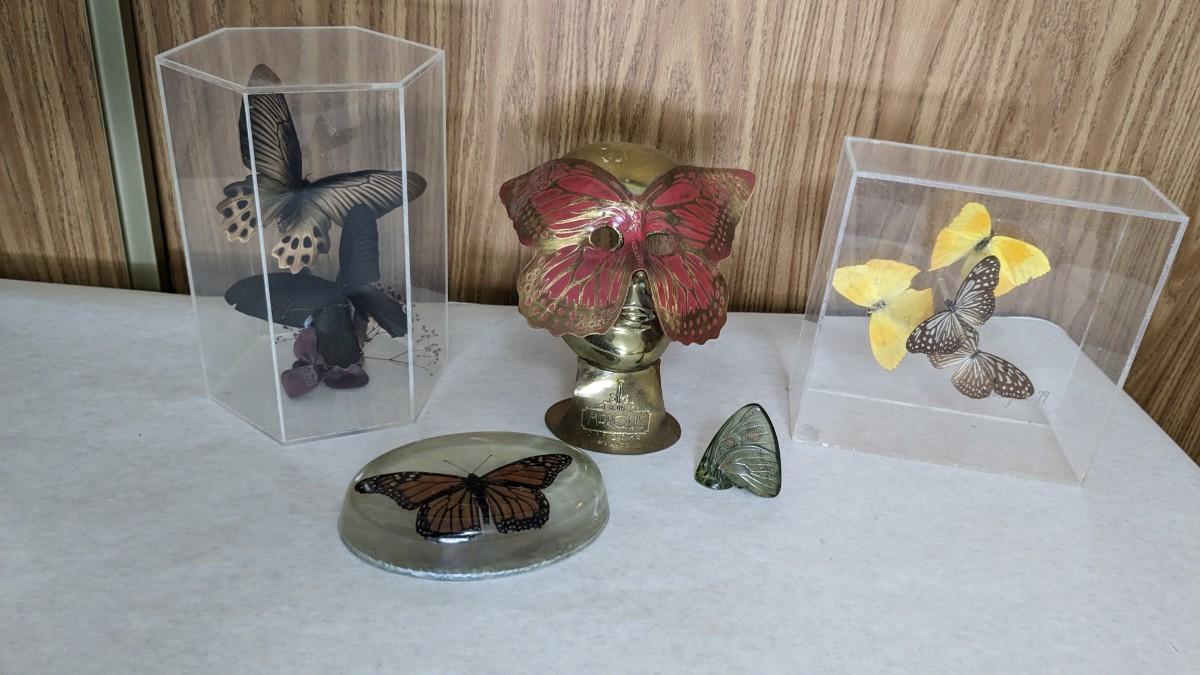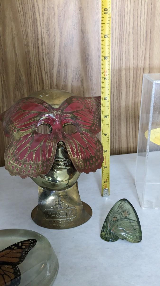 includes 2 acrylic cased taxidermy butterfly pieces, a beautiful lucite encased monarch, a beautiful green glass butterfly, and a very lovely solid brass butterfly maked face from Hotel Marquis Reforma-Mexico. Very lovely items in this one! No shipping. bdrm1