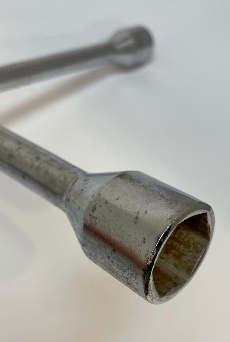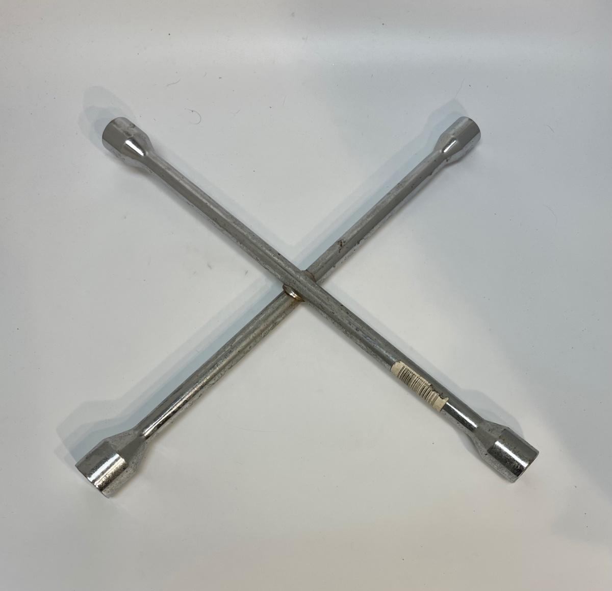 Chrome plated steel Cross spinner lug wrench. Can turn metric lug nuts, 17mm, 19mm, 21mm, and 23mm sizes. Approx. 16” x 16”.