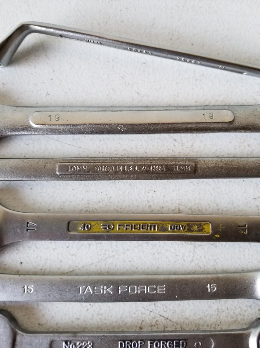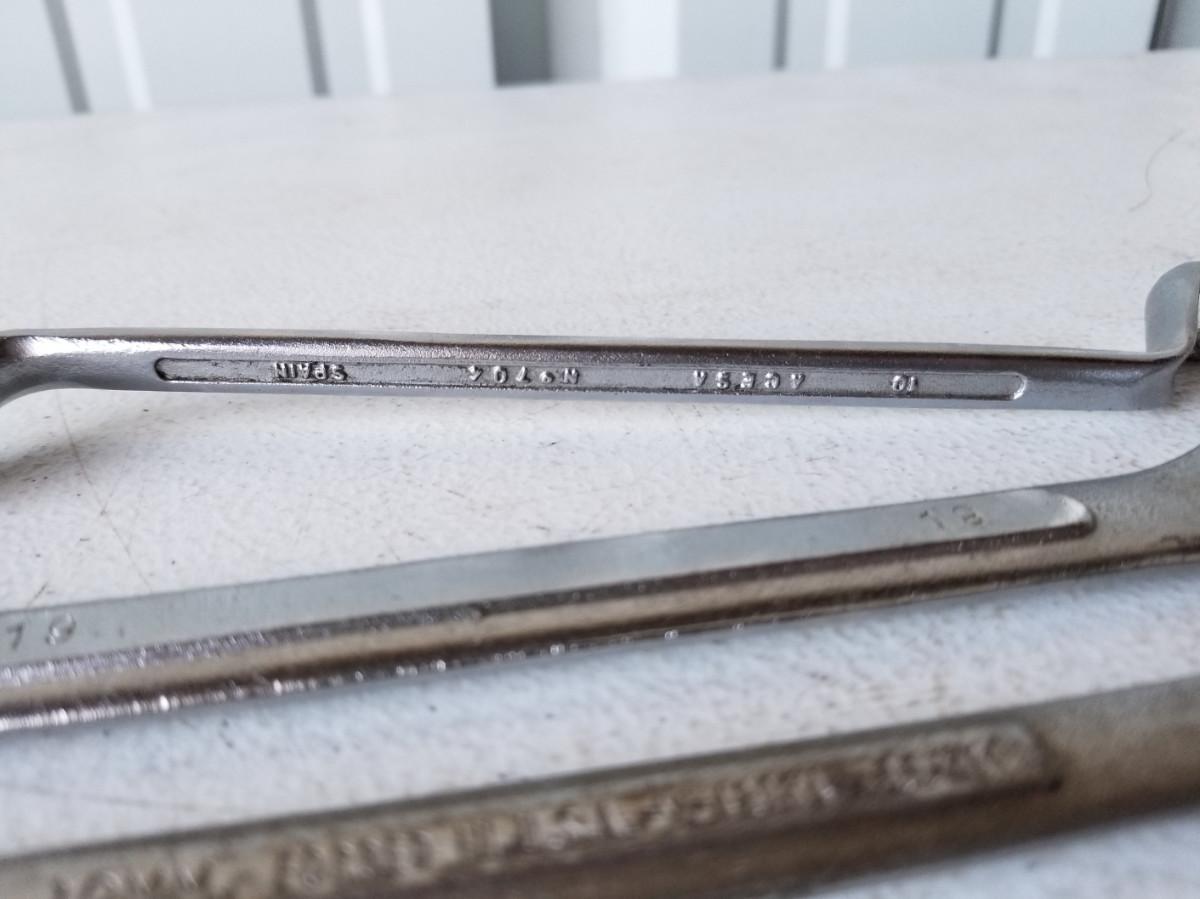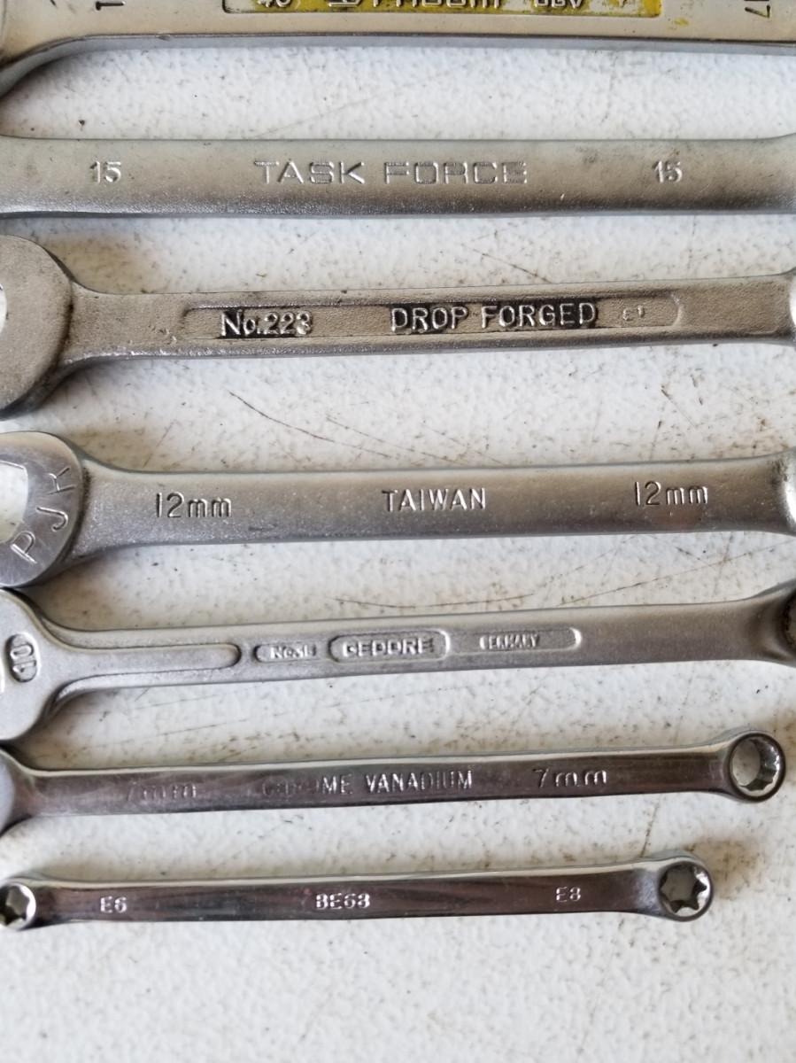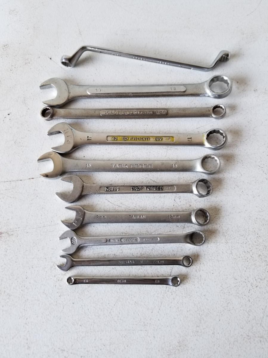 9 wrenches from a variety of manufacturers. The double offset box end wrench is 10mm and 11mm. The other double box wrenches are in sizes 10mm/11mm, and 6mm/8mm. The combo wrenches are in sizes 19mm, 17mm, 15mm, 12mm, 10mm, and 7mm. The other combo wrench, model 223, appears to be a 13/16" wrench.