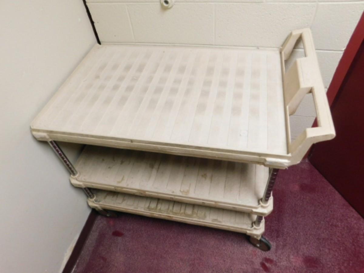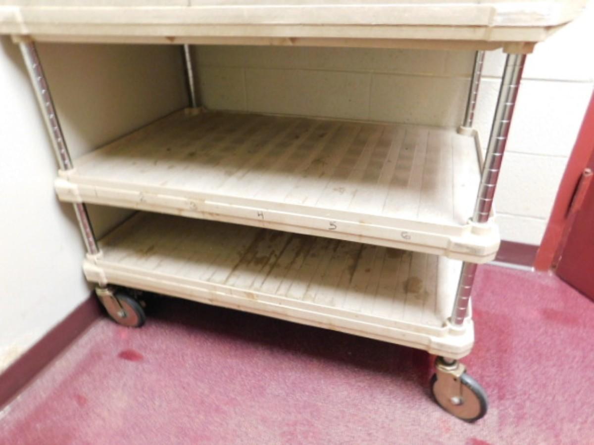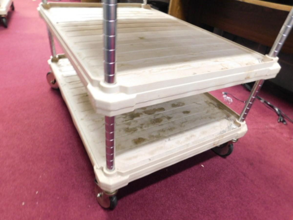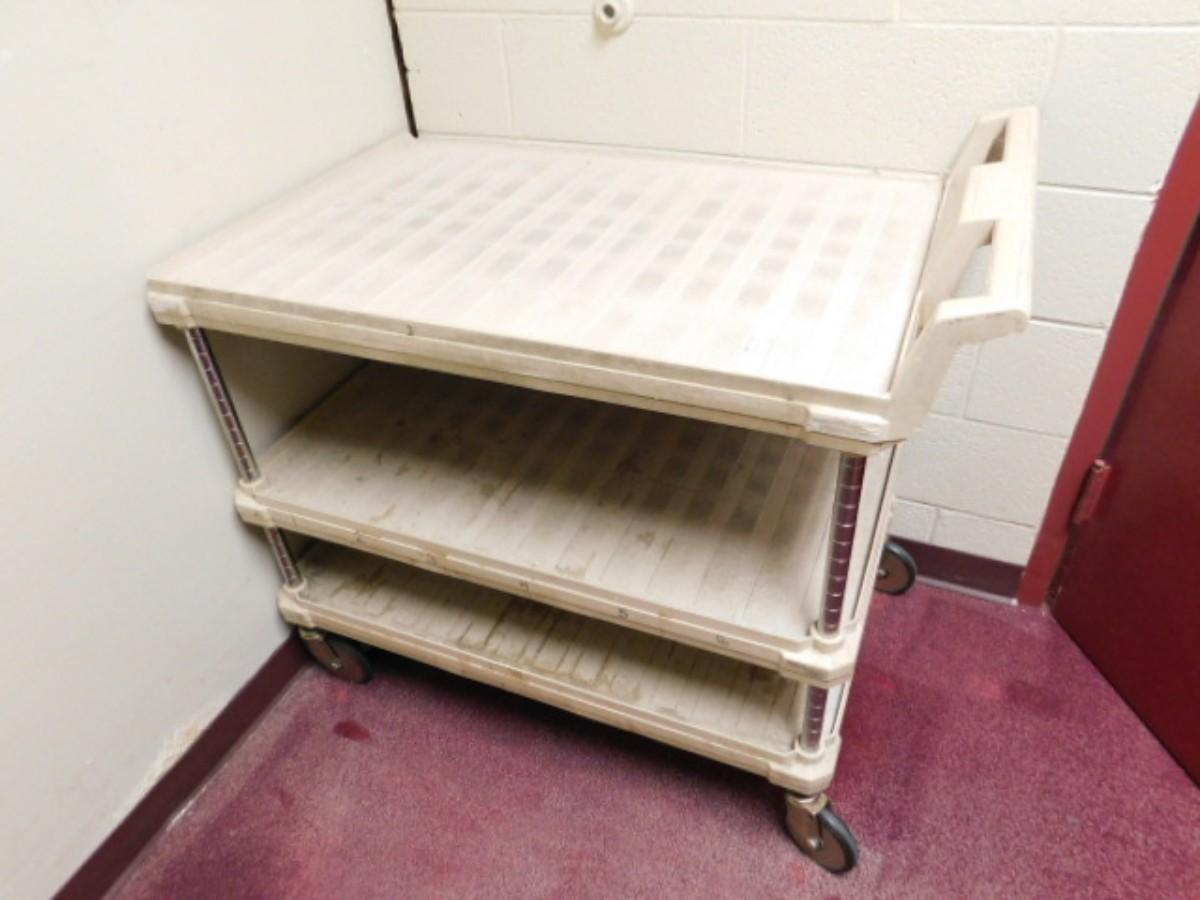 Metro Composite Three Tier Pushcart Choice C Expect some wear or scratches to finish. Shipping option available via freight or local mover at Buyer's expense. Buyer must have all shipping scheduled within the stated dates and times of pickup. Recommended local mover is Beaty Bros. Moving 828-201-2982