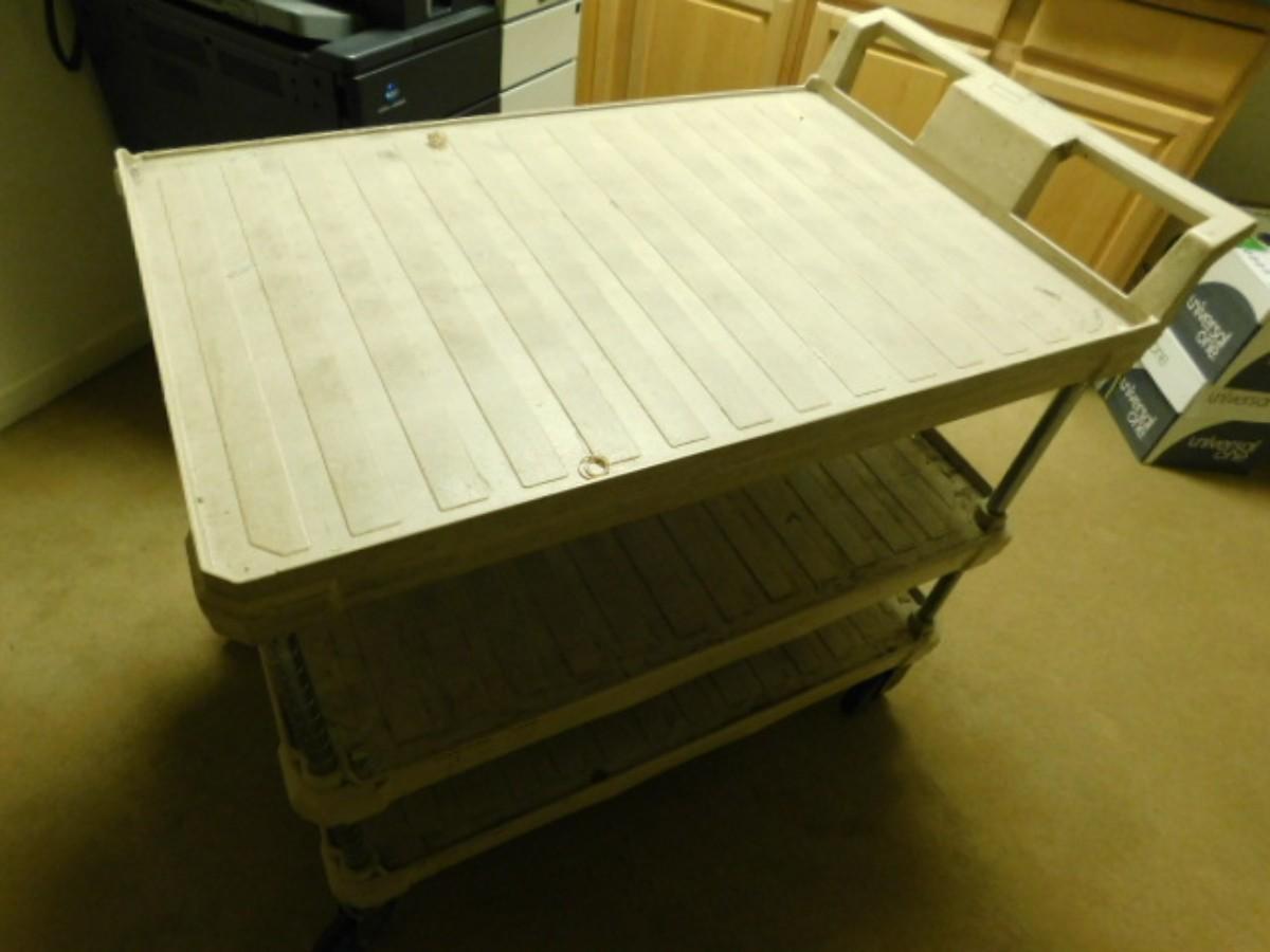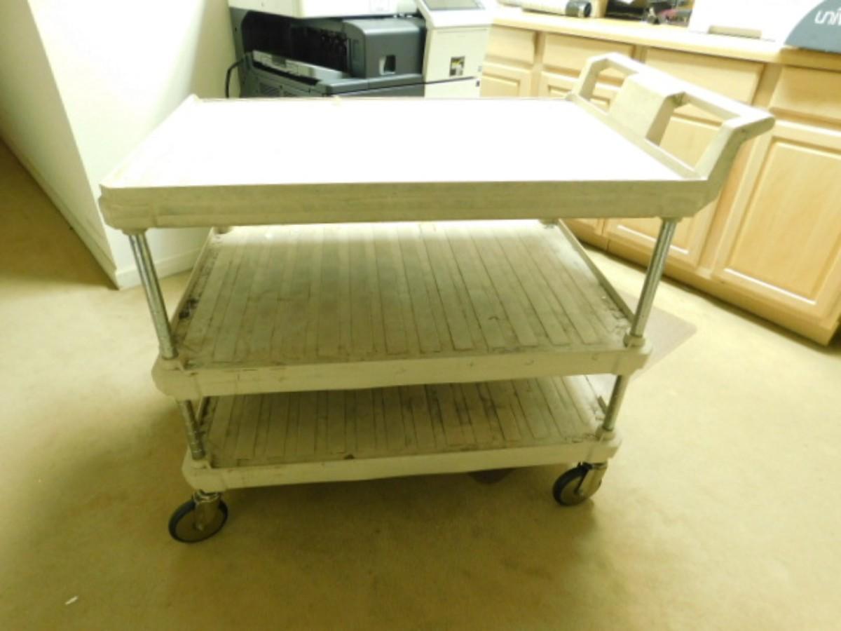 Metro Composite Three Tier Pushcart Choice D Expect some wear or scratches to finish. Shipping option available via freight or local mover at Buyer's expense. Buyer must have all shipping scheduled within the stated dates and times of pickup. Recommended local mover is Beaty Bros. Moving 828-201-2982