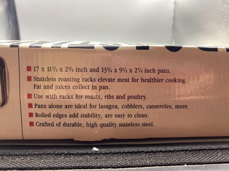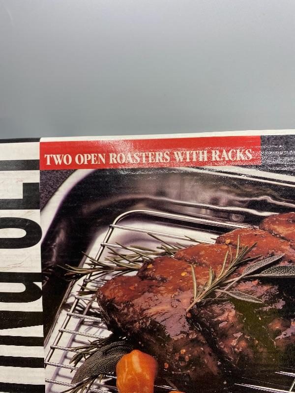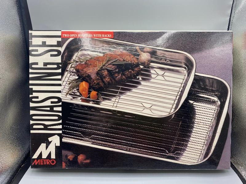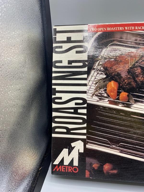 Metro roasting set. 2 roasting pans with racks. Measure approx 17"x11.5" and 13.75"x9.5". New in the box, still in plastic.