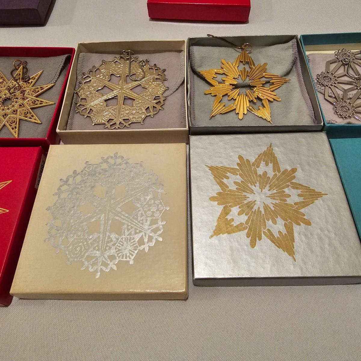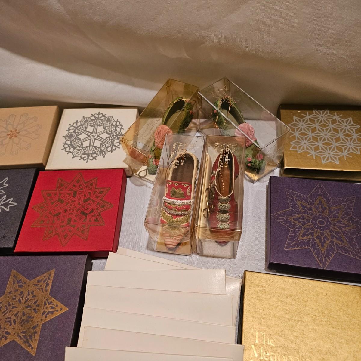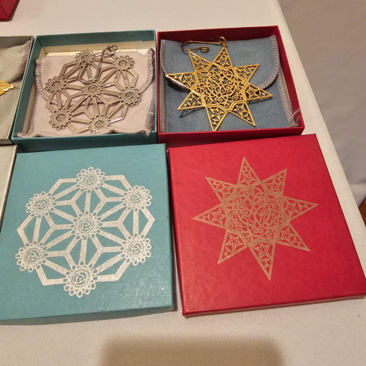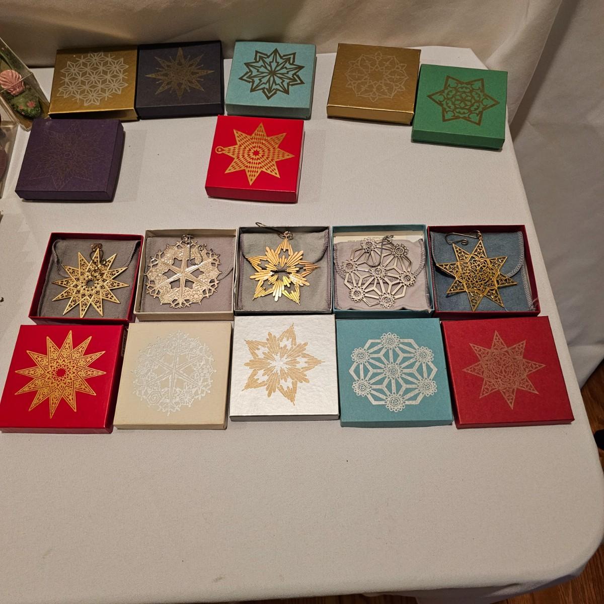A unique assortment of metal and enamel ornaments plus four shoe replicas. Fifty boxed ornaments in silver and gold, most depicting stars and snowflakes. Please note, the designs on the box tops represent the shapes inside. The four Victorian style shoes are ceramic and highly decorated. The white sleeves contain representations of quilt designs from the 1850's. There are some doubles of these items. See photos for details. Shipping available.