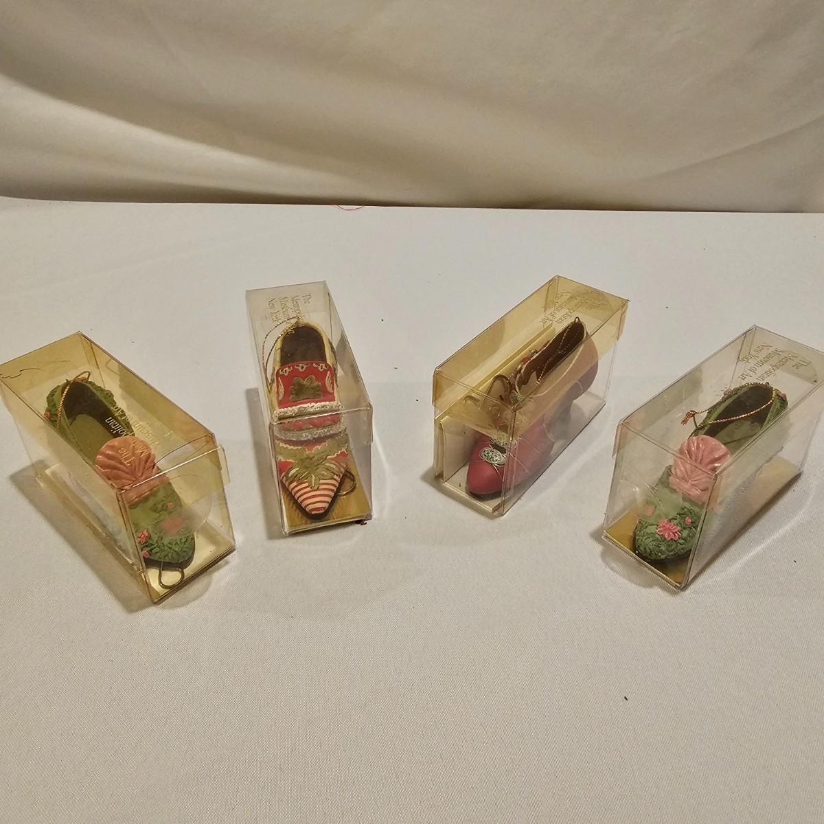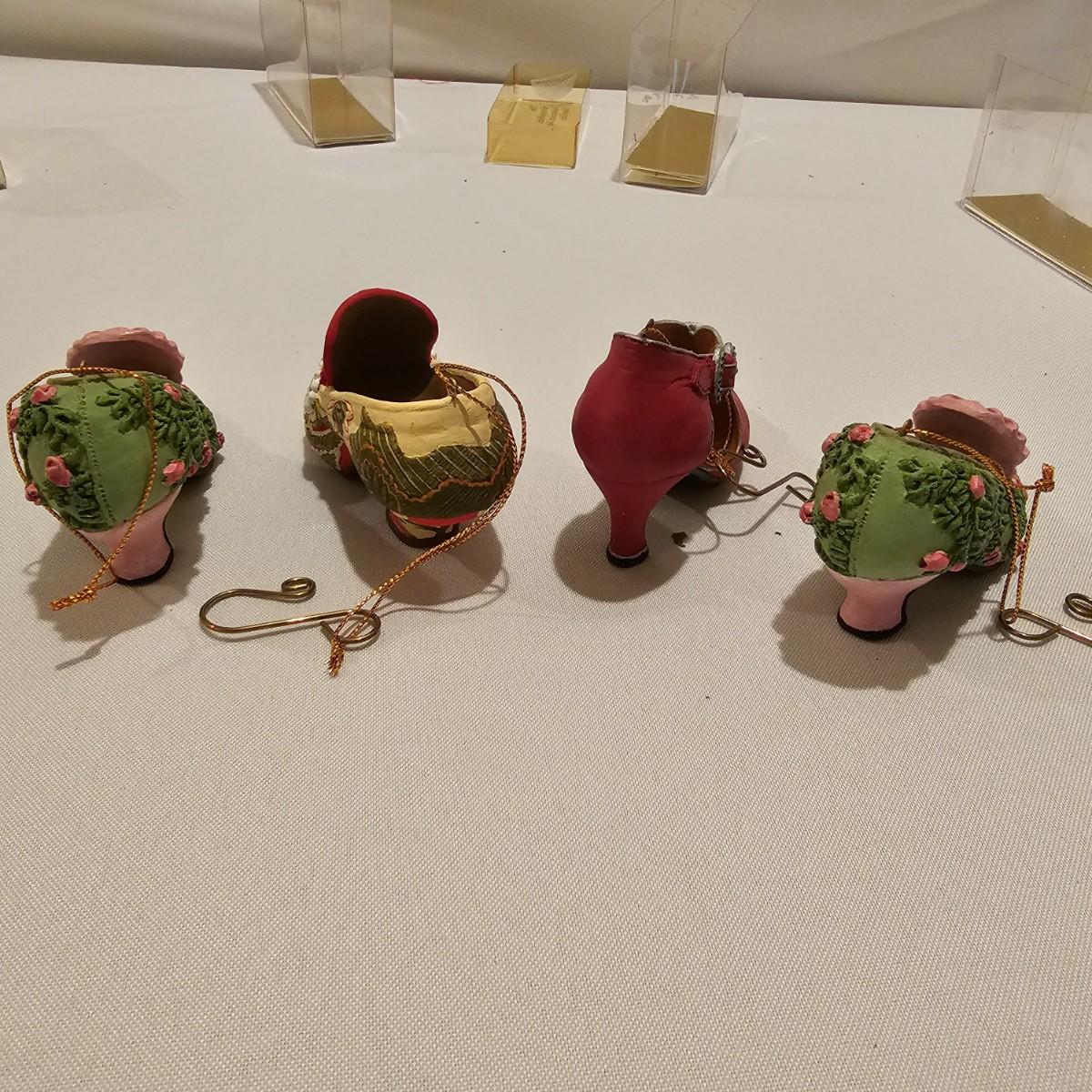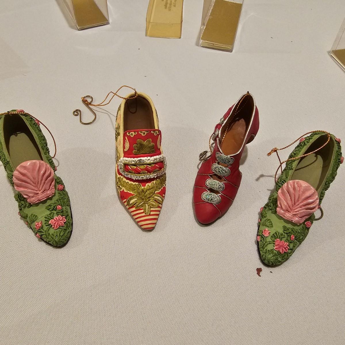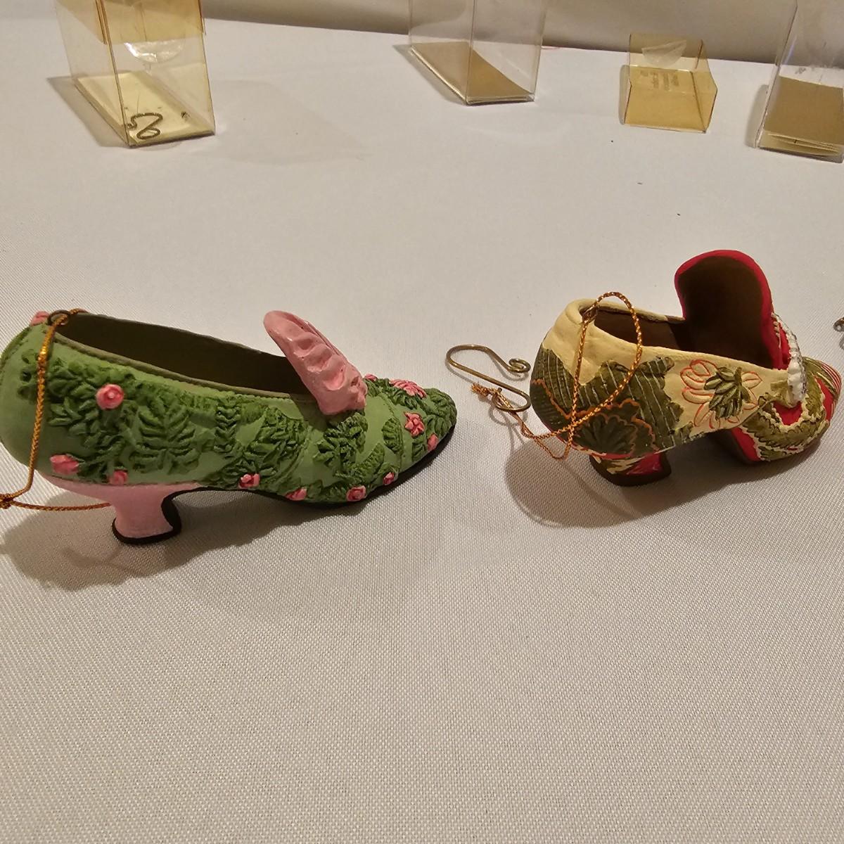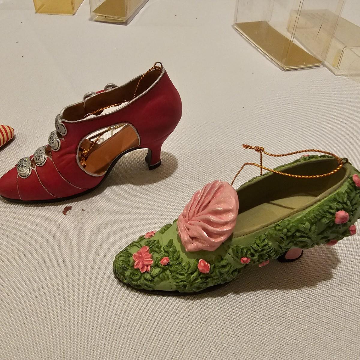 A unique assortment of metal and enamel ornaments plus four shoe replicas. Fifty boxed ornaments in silver and gold, most depicting stars and snowflakes. Please note, the designs on the box tops represent the shapes inside. The four Victorian style shoes are ceramic and highly decorated. The white sleeves contain representations of quilt designs from the 1850's. There are some doubles of these items. See photos for details. Shipping available.