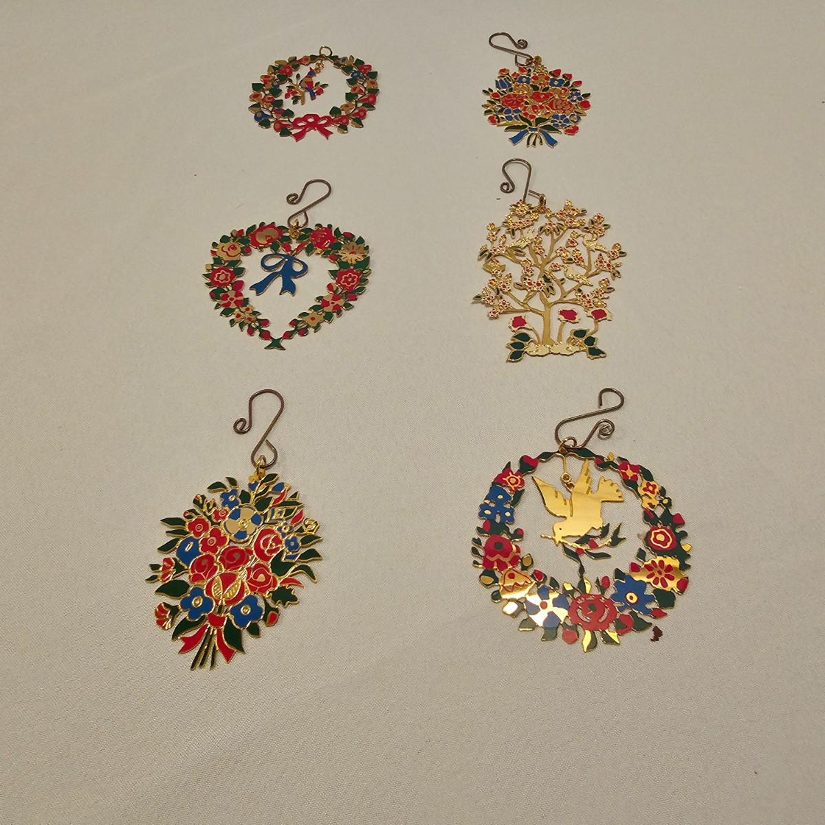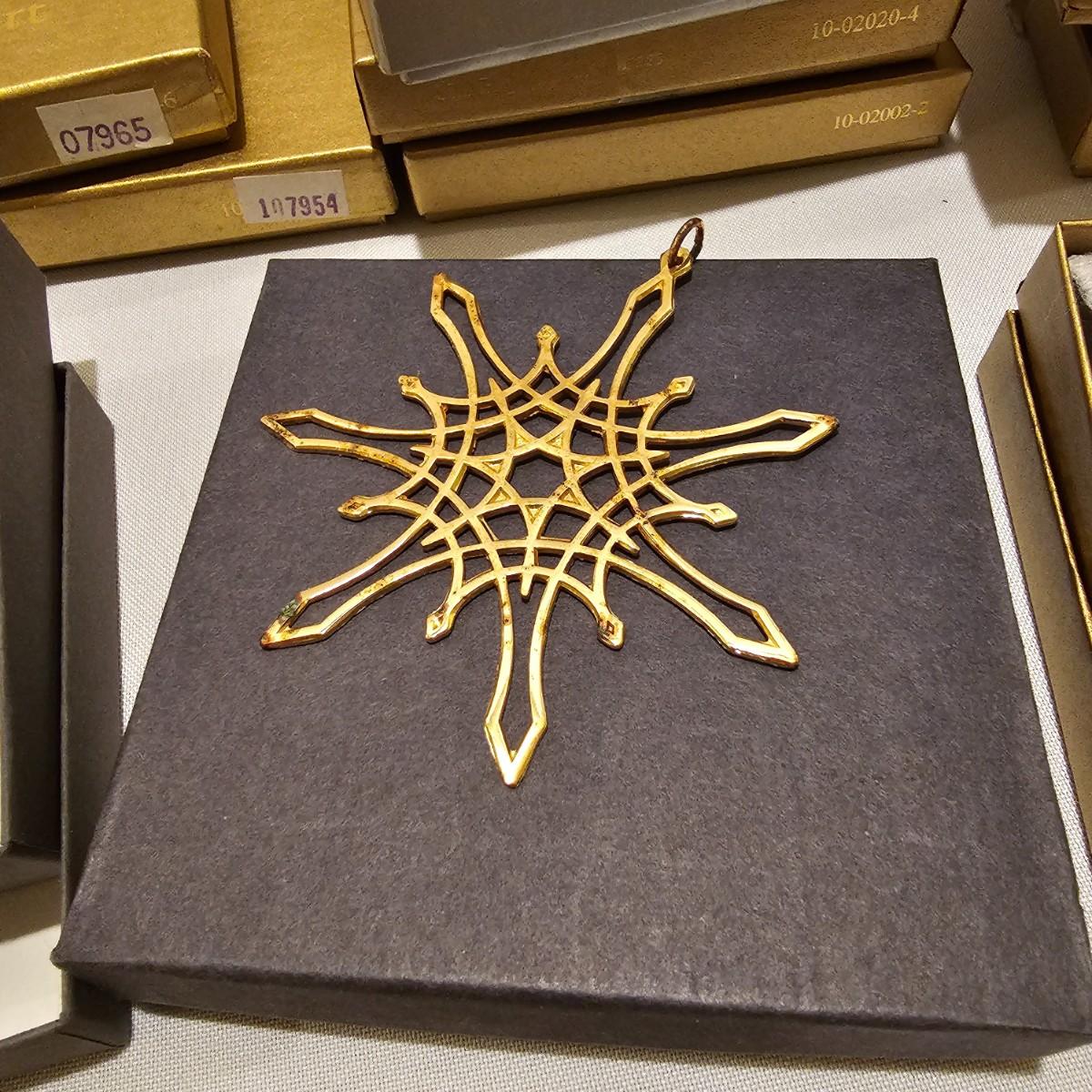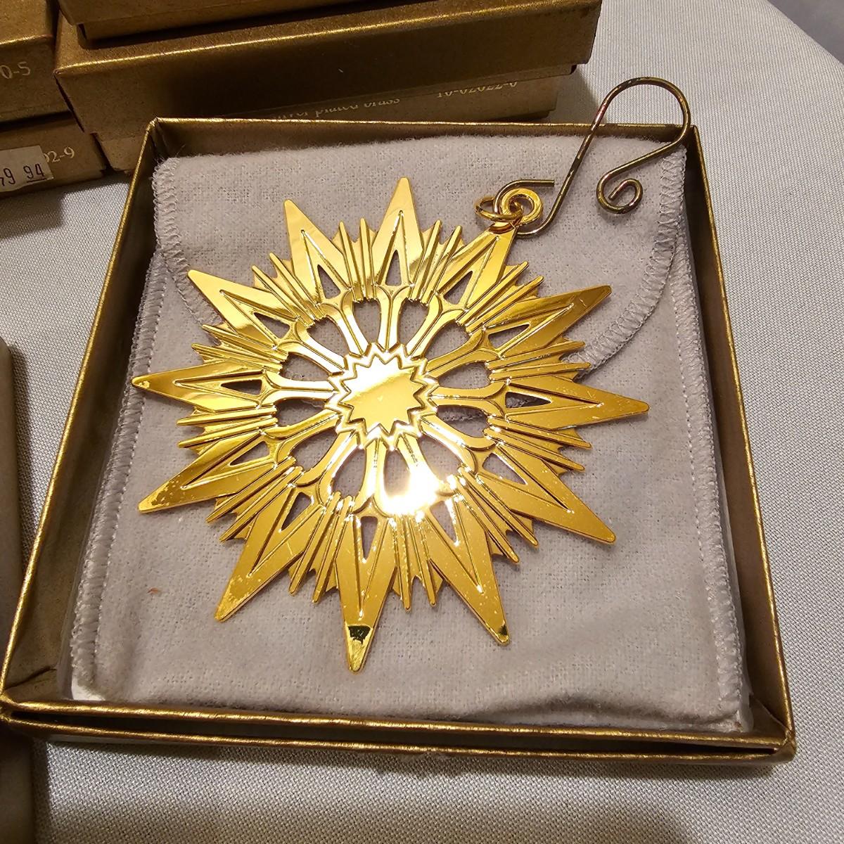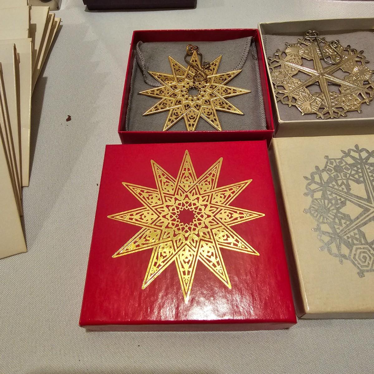A unique assortment of metal and enamel ornaments plus four shoe replicas. Fifty boxed ornaments in silver and gold, most depicting stars and snowflakes. Please note, the designs on the box tops represent the shapes inside. The four Victorian style shoes are ceramic and highly decorated. The white sleeves contain representations of quilt designs from the 1850's. There are some doubles of these items. See photos for details. Shipping available.