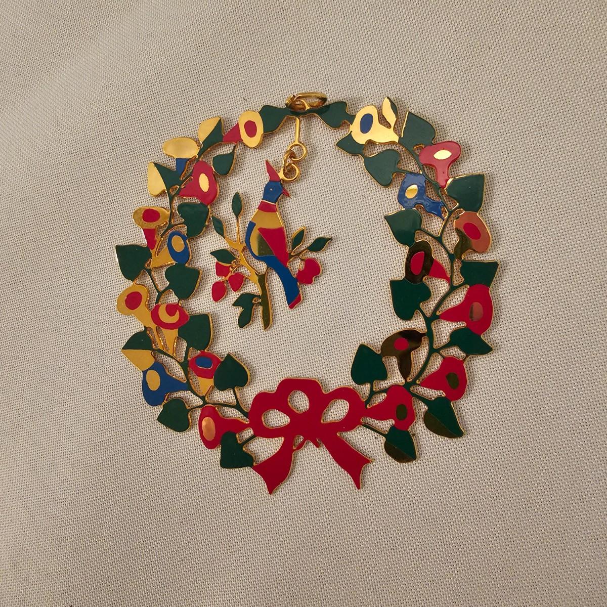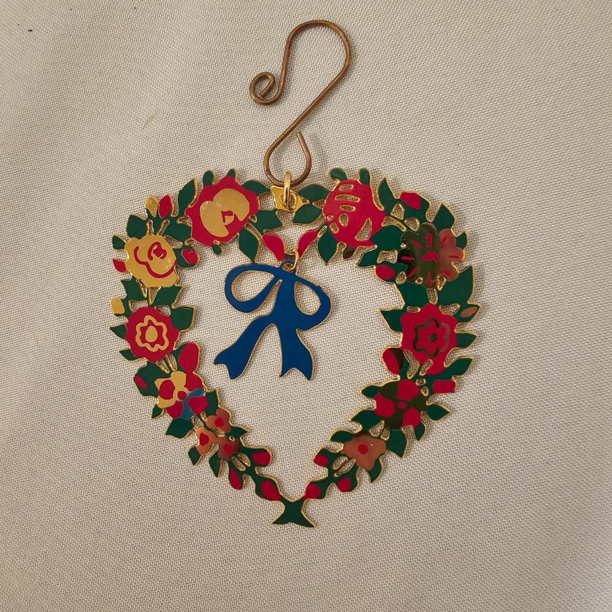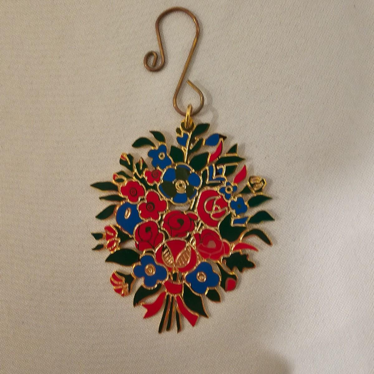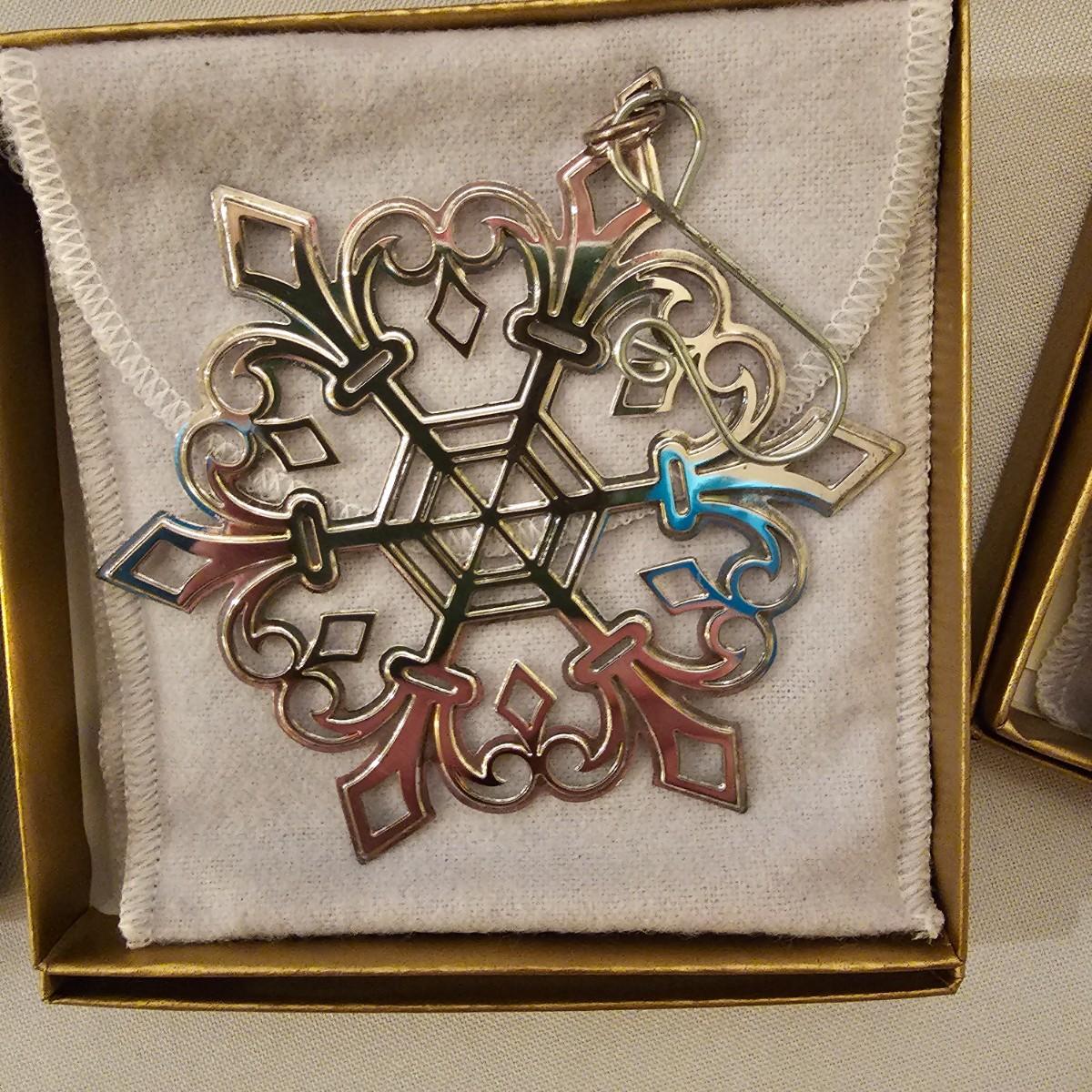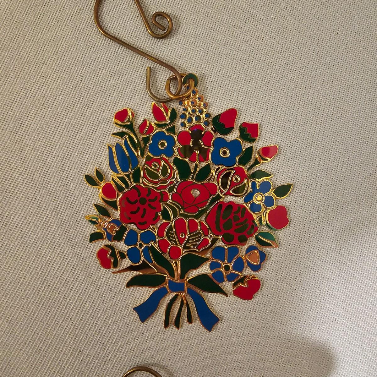 A unique assortment of metal and enamel ornaments plus four shoe replicas. Fifty boxed ornaments in silver and gold, most depicting stars and snowflakes. Please note, the designs on the box tops represent the shapes inside. The four Victorian style shoes are ceramic and highly decorated. The white sleeves contain representations of quilt designs from the 1850's. There are some doubles of these items. See photos for details. Shipping available.
