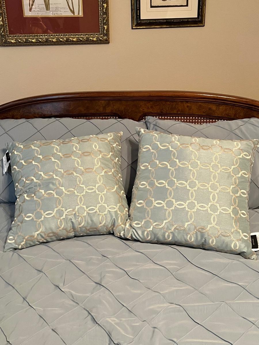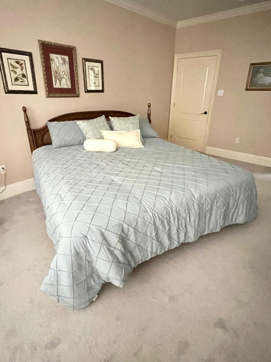 Set includes: 1 oversized king comforter ~ 2 king shams ~ 1 bed skirt ~ 4 throw pillows. Color is like a seafoam type of color. See pics for more information.