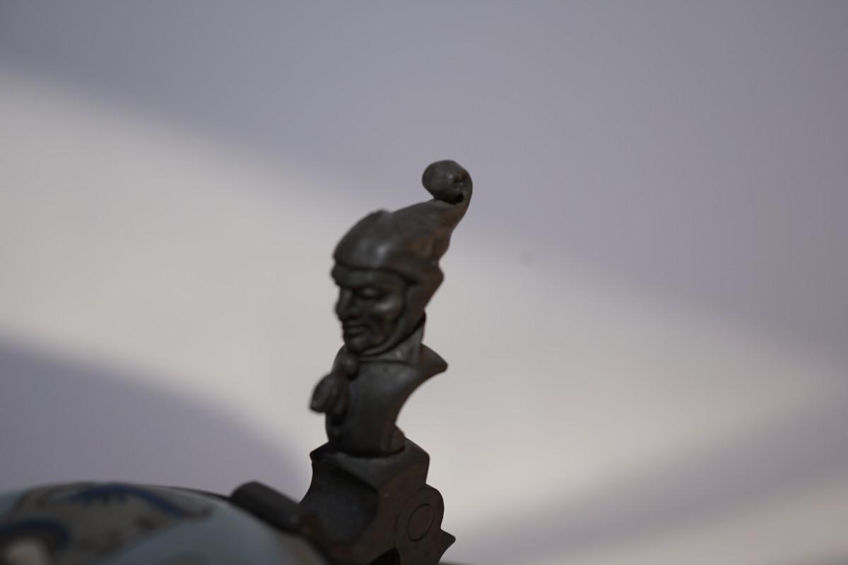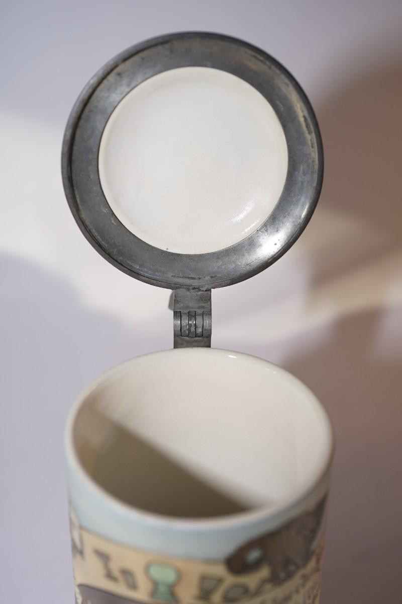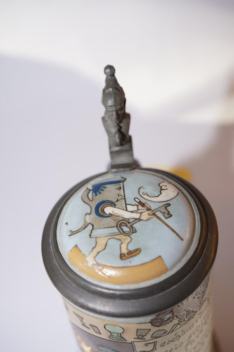 inset lid with porcelain ceramic lid with faced stein holding key.