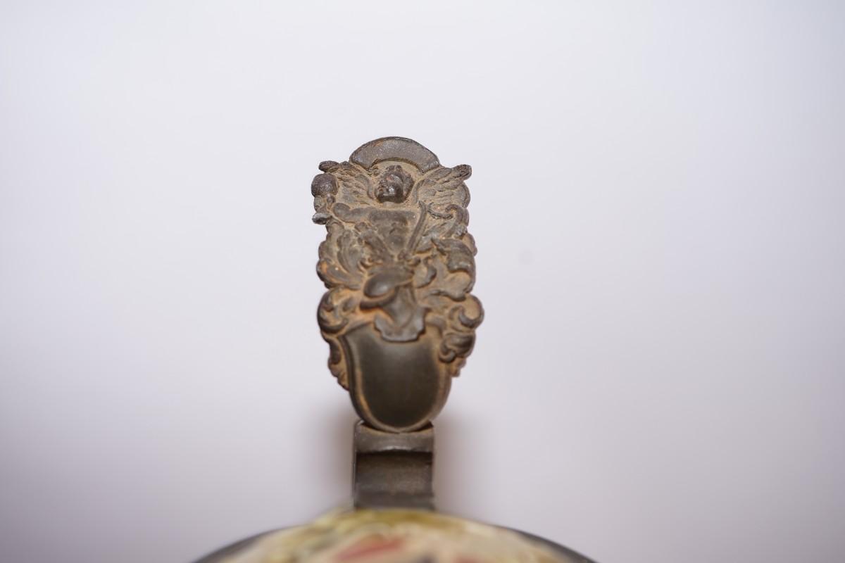 Condition: the strap is loose. ( see photos for small hairline on pewter strap. ) also interior is soiled very slight areas of staining? soiling