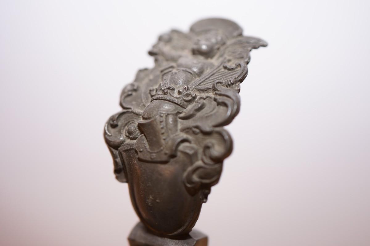 inlay lid with a wooden keg. The pewter thumb lift has a cherub with a chalice and harp