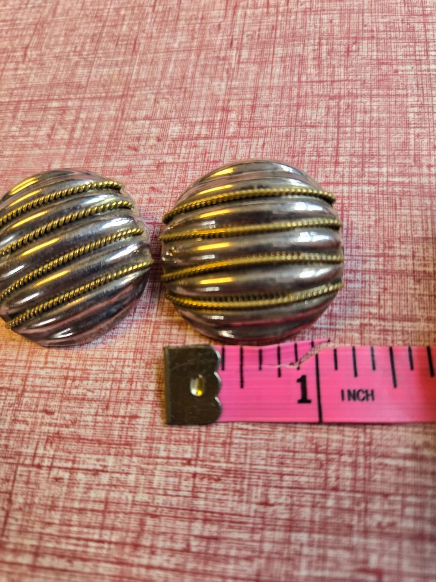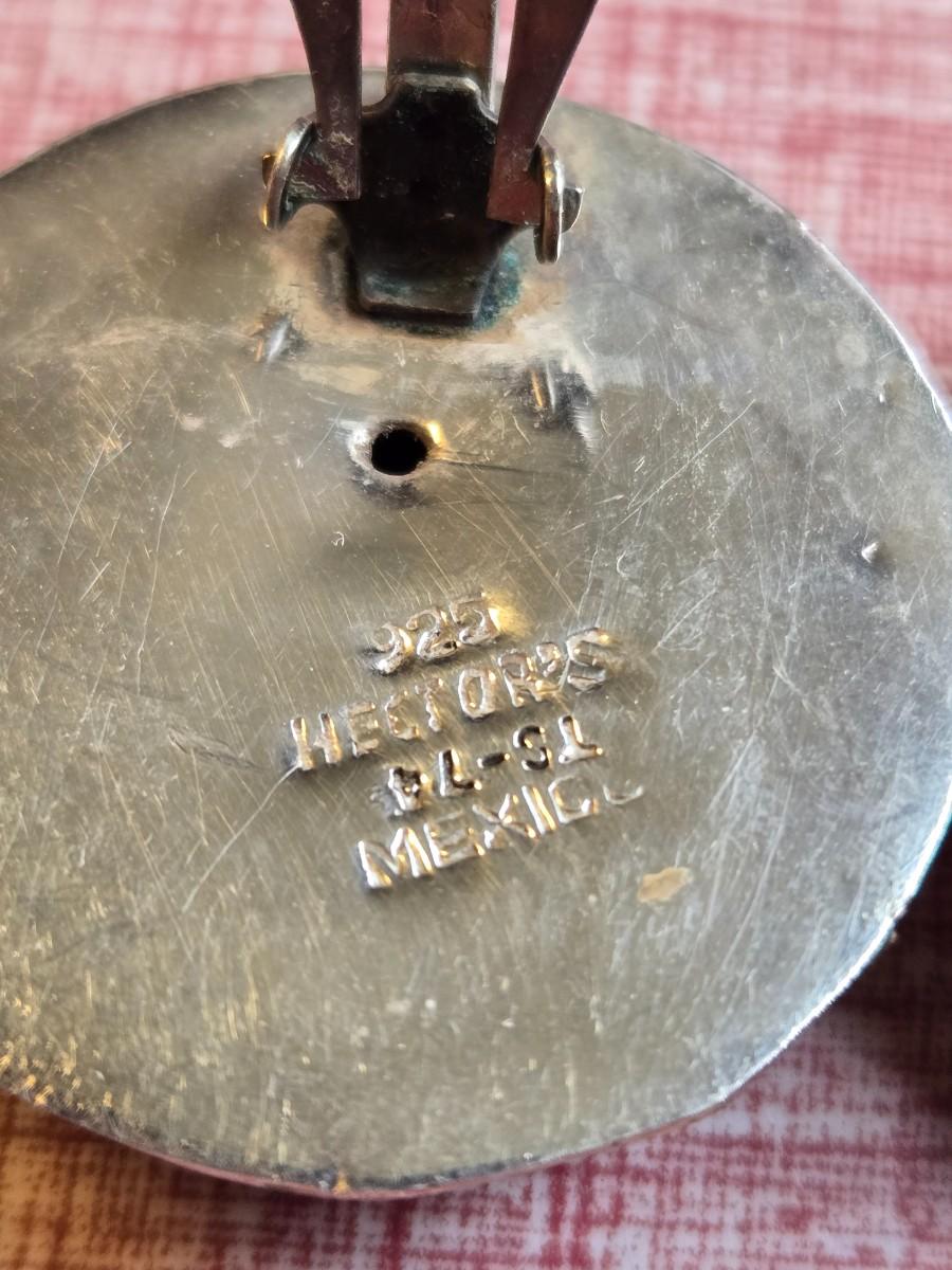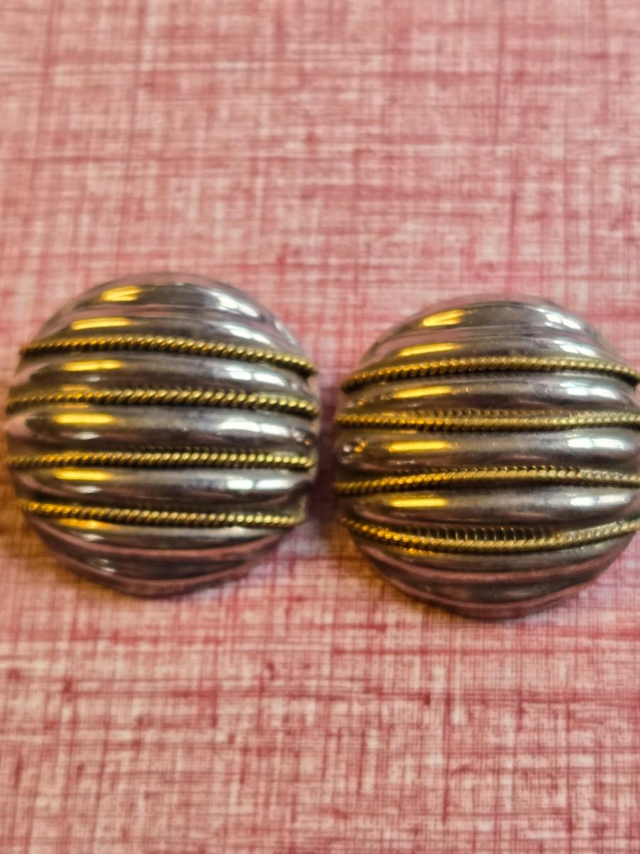 Large 1" circular silver with gold braid trim. Clip on earrings. Marked 925 Hector's TS-74 Mexico