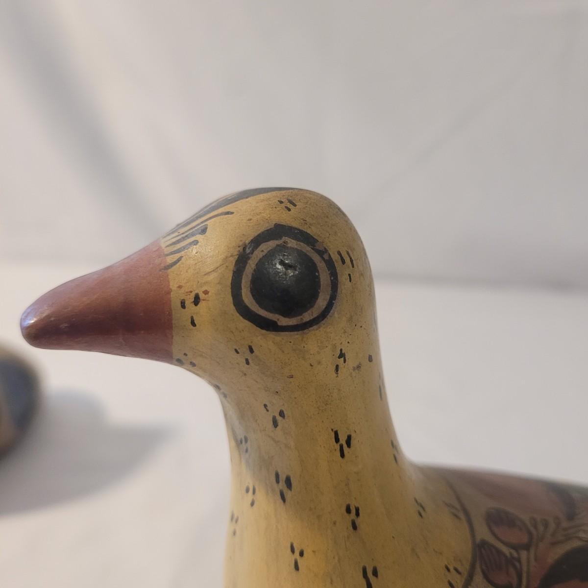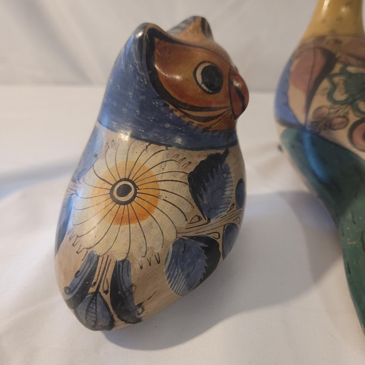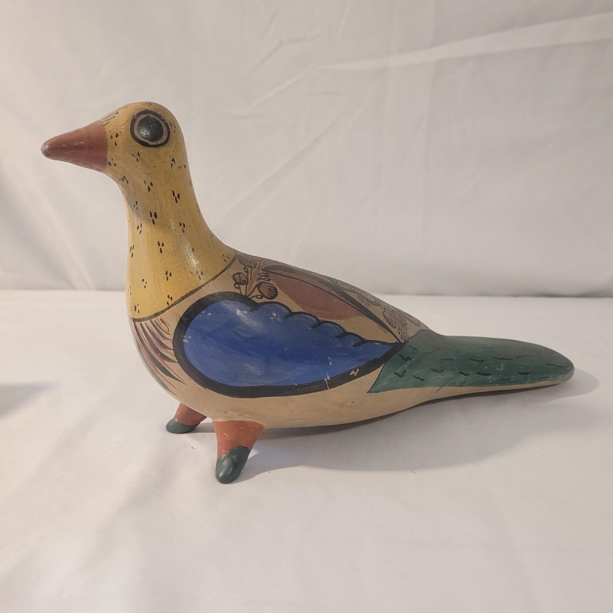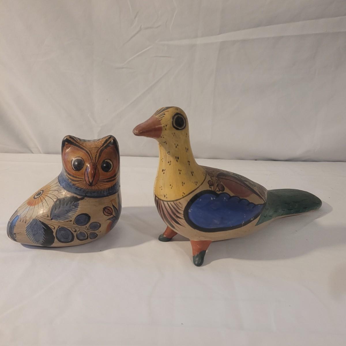 This cute lot of Mexican clay hand painted owl and dove statuettes have a fun folk art motif. Dove measures approximately 12” from beak to tail. Shipping available.