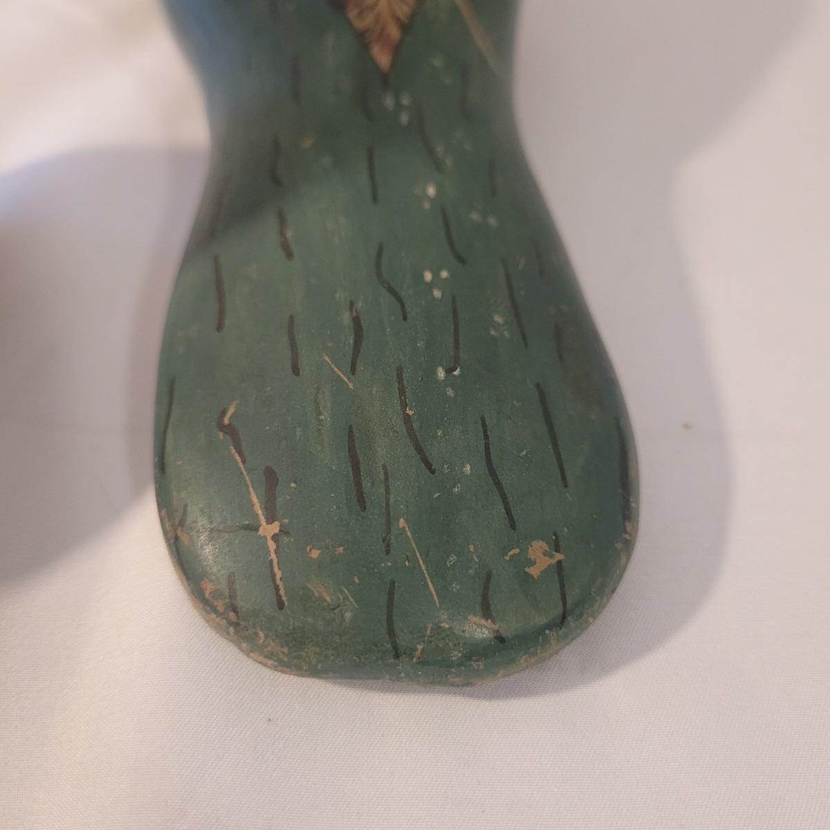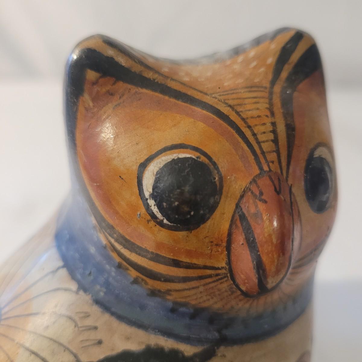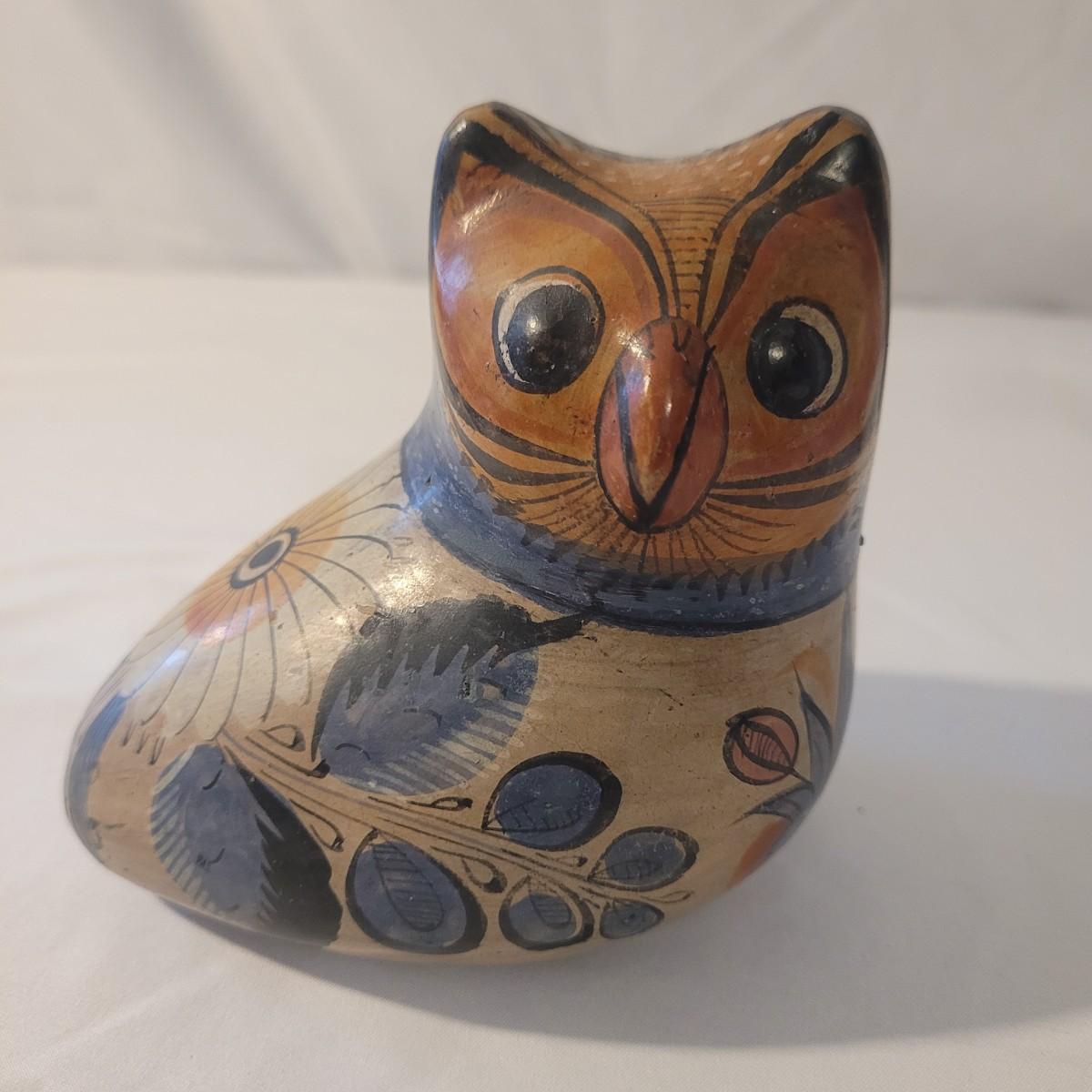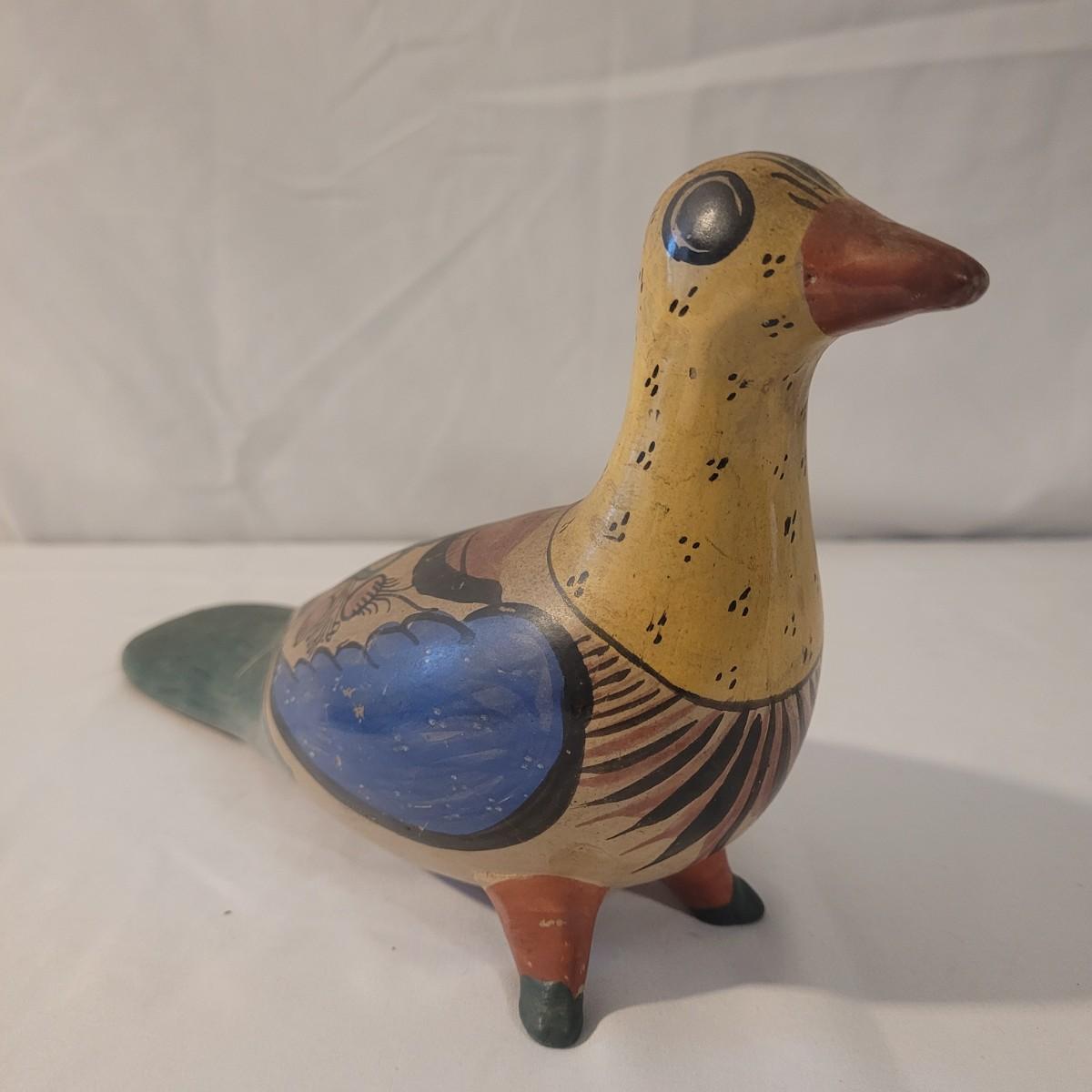 This cute lot of Mexican clay hand painted owl and dove statuettes have a fun folk art motif. Dove measures approximately 12” from beak to tail. Shipping available.