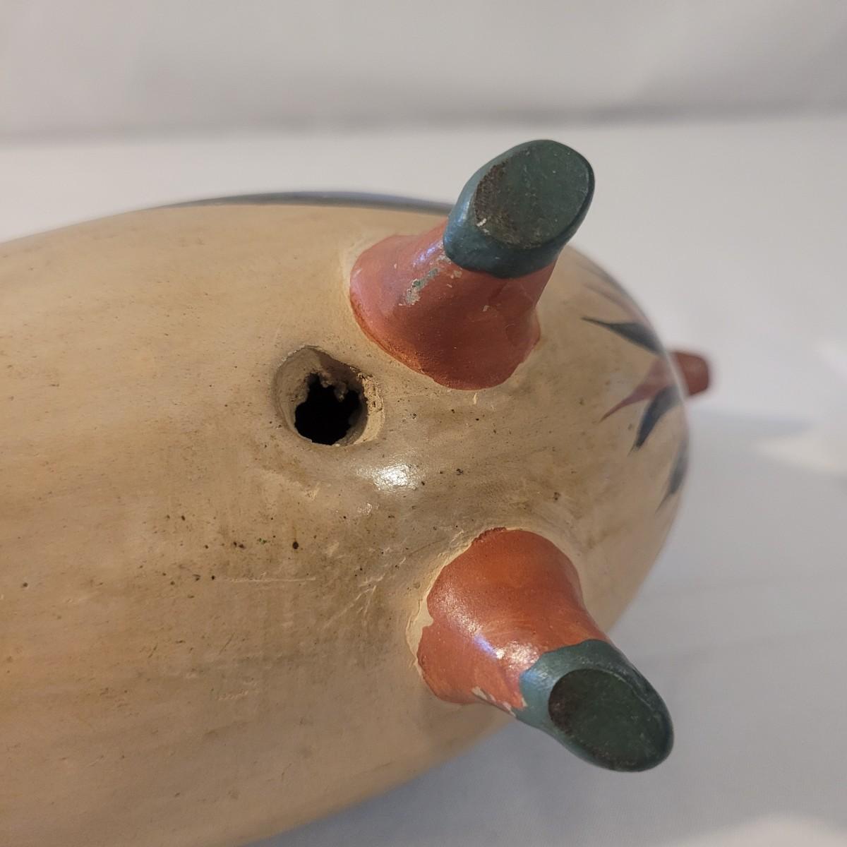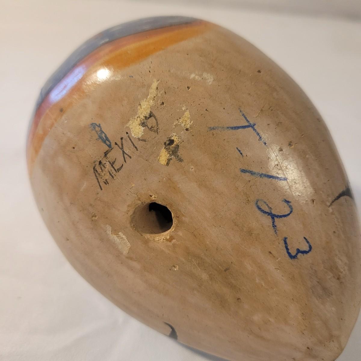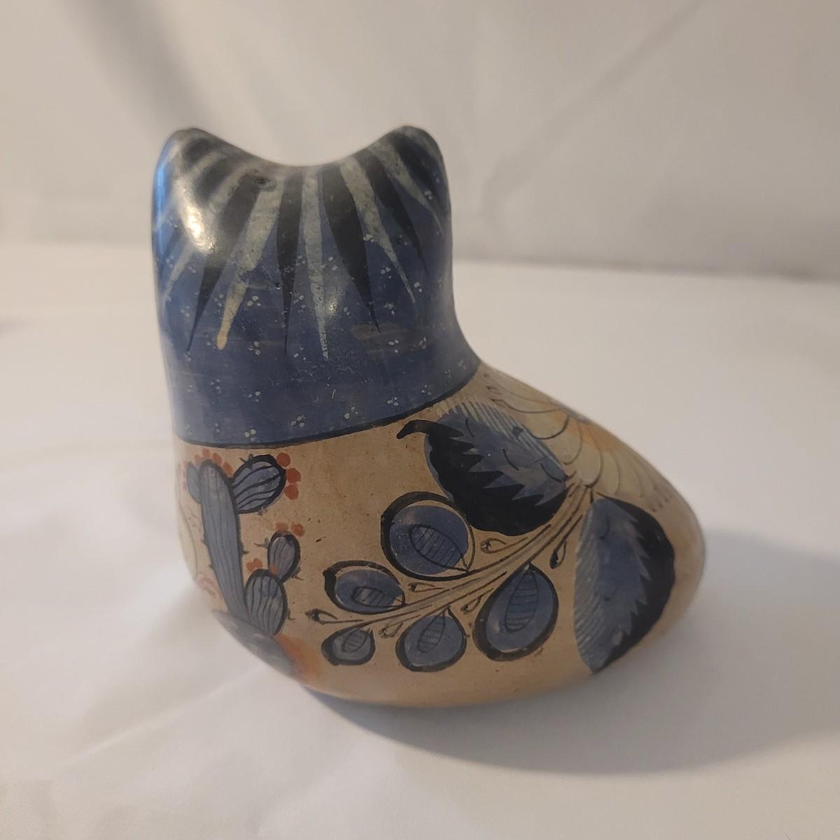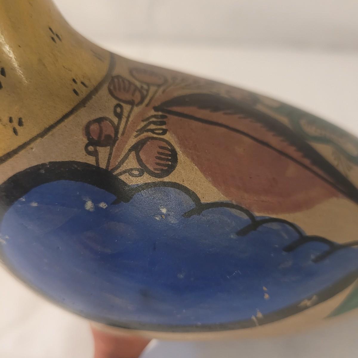 This cute lot of Mexican clay hand painted owl and dove statuettes have a fun folk art motif. Dove measures approximately 12” from beak to tail. Shipping available.