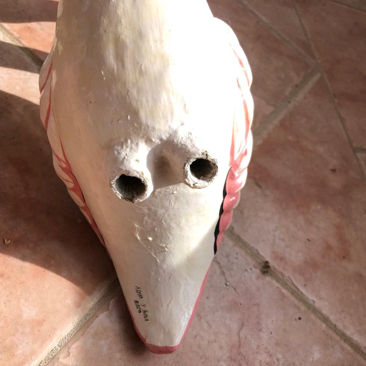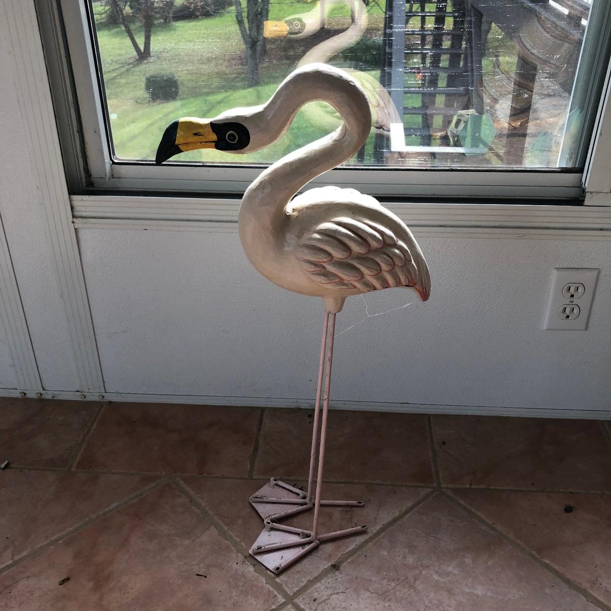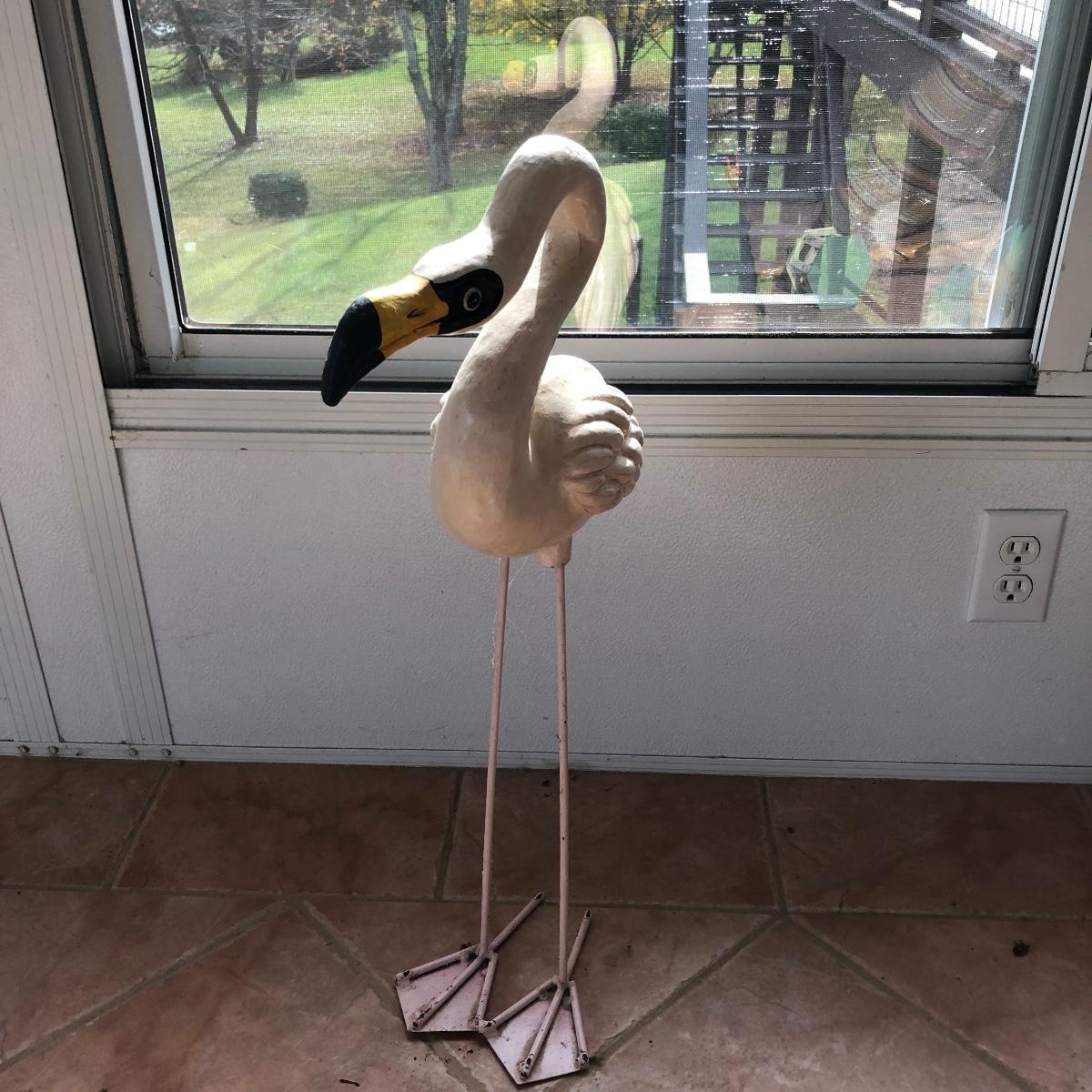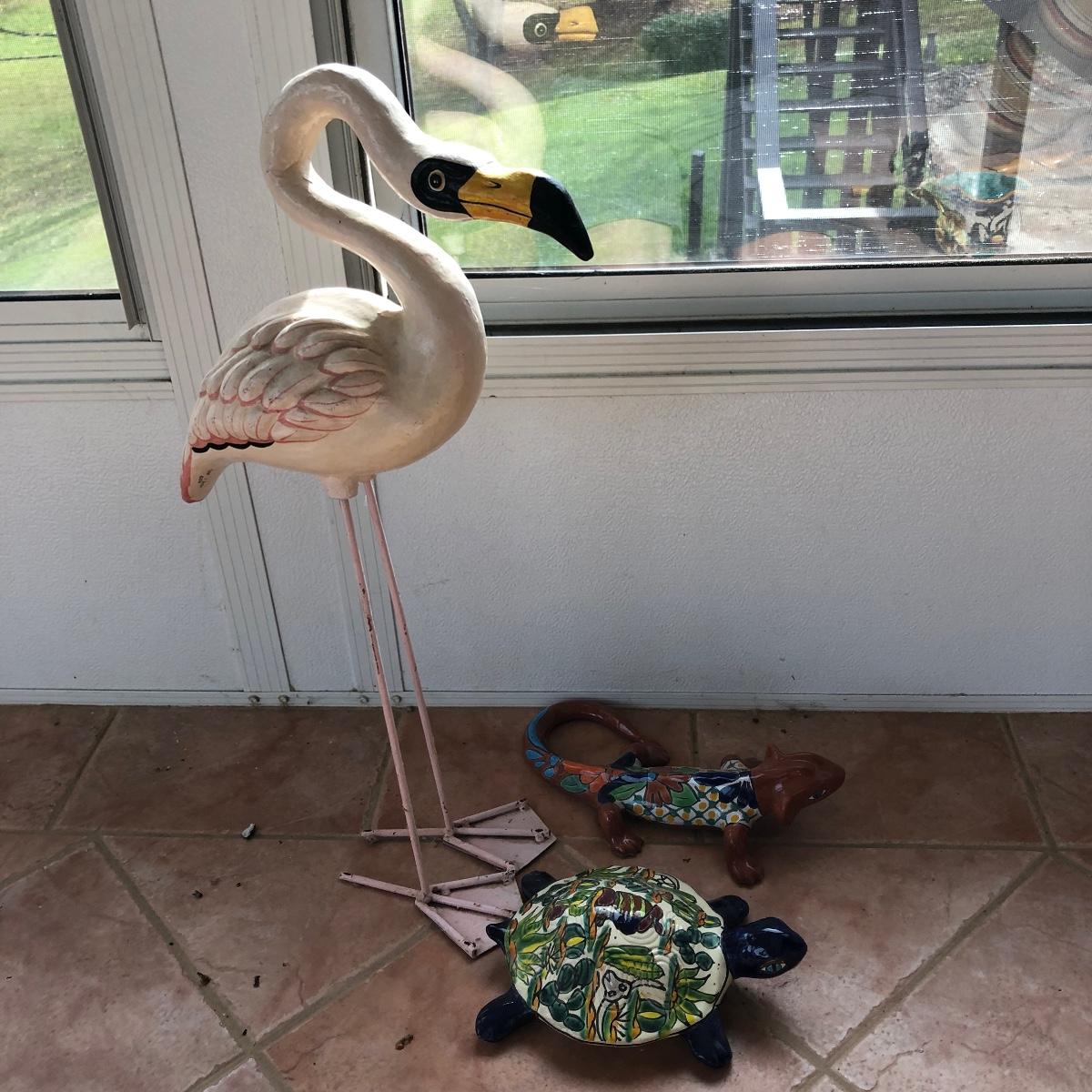 Lot includes a flamingo with metal legs and a paper mâché body and a terra cotta lizard and turtle. All three items marked Mexico. Flamingo measures 7” x 16” x 26”.
