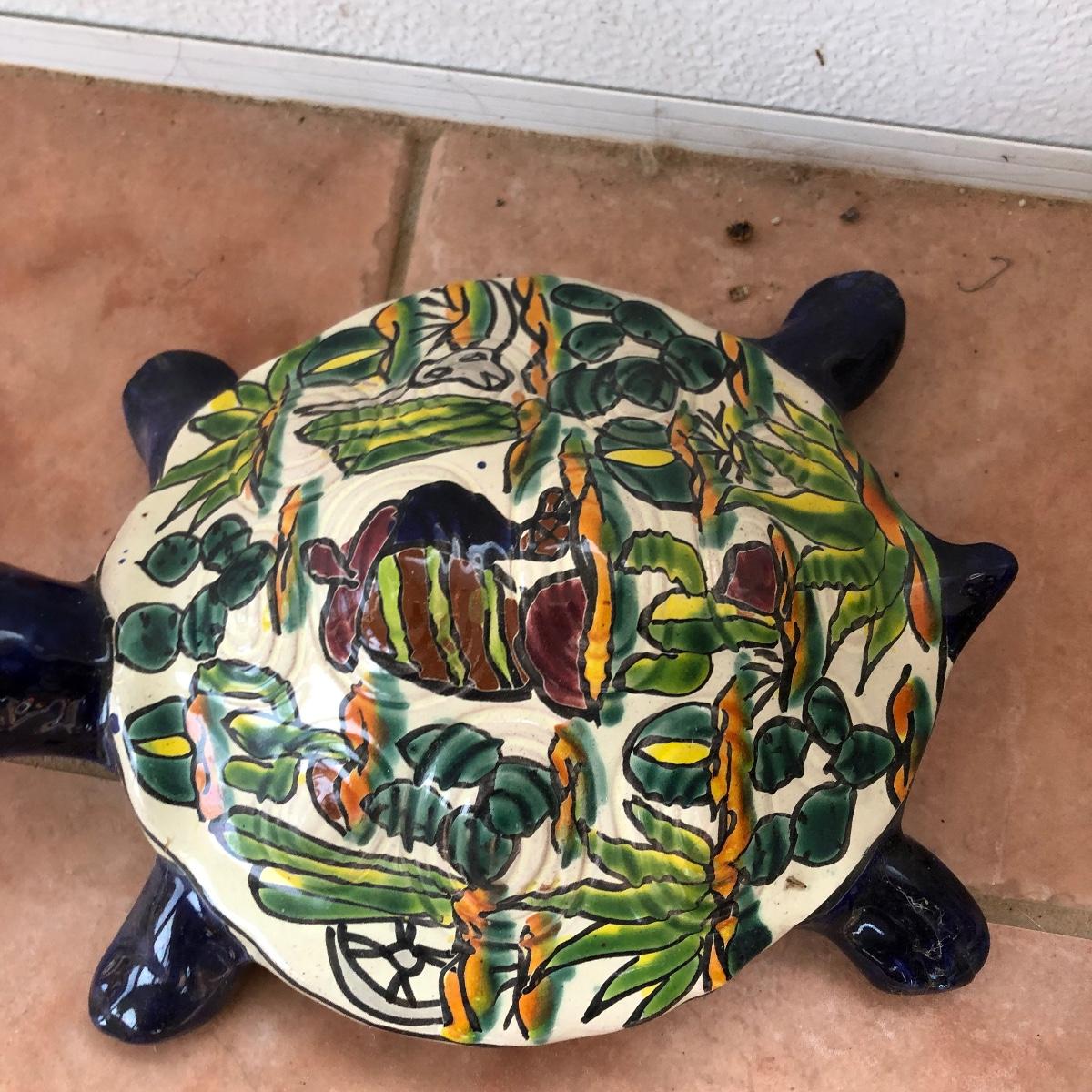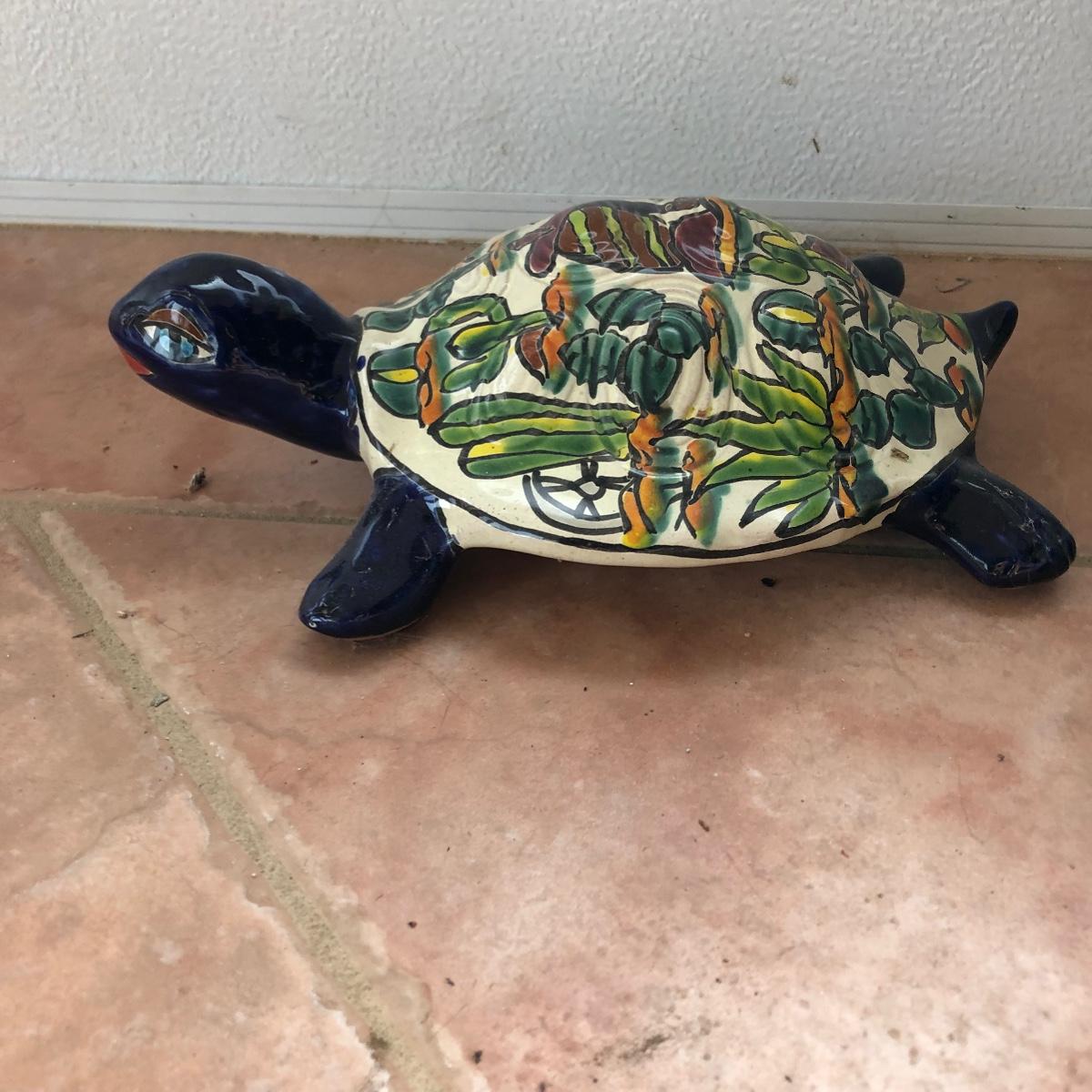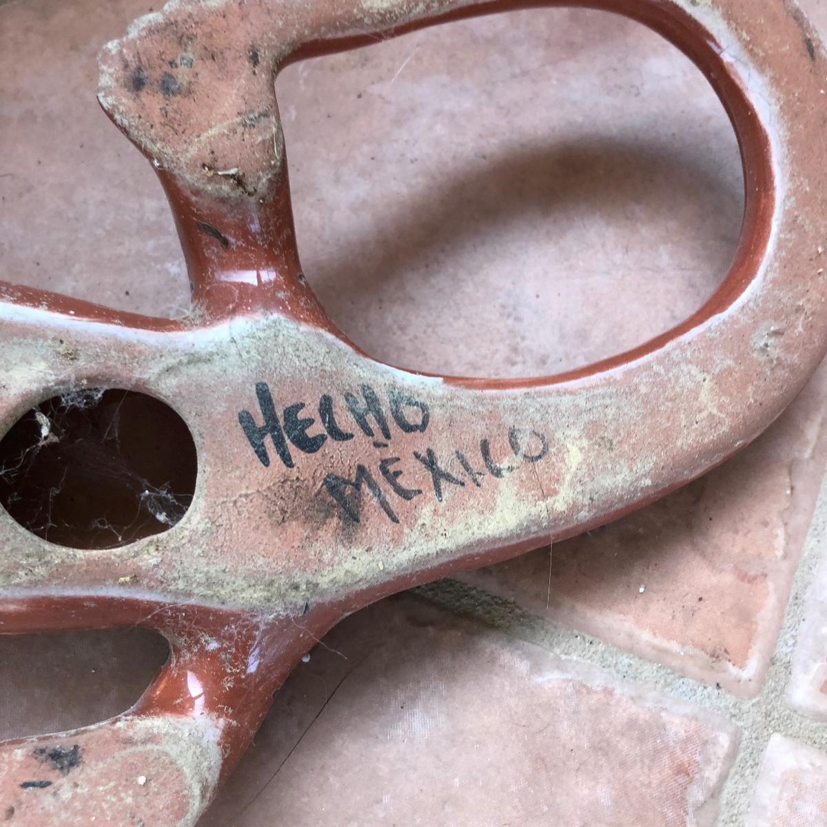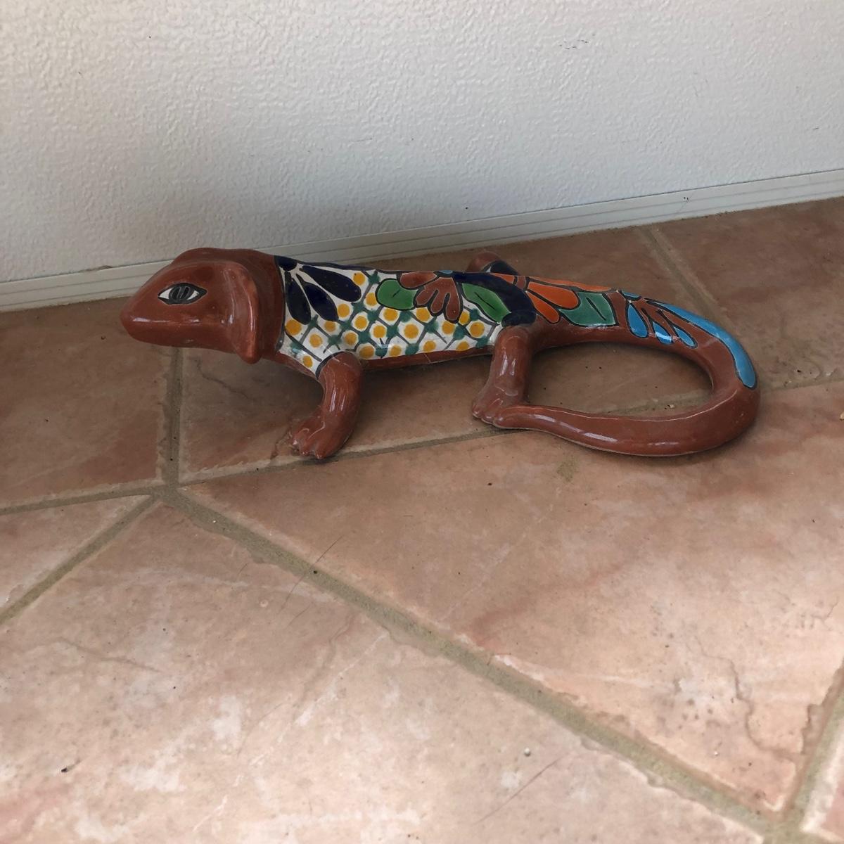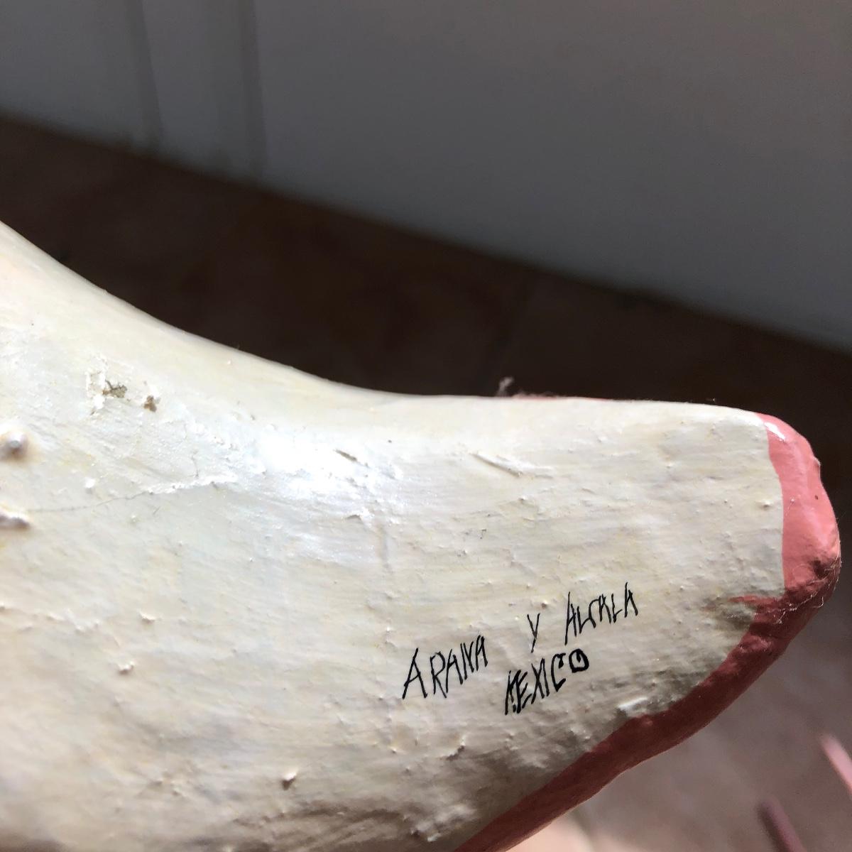 Lot includes a flamingo with metal legs and a paper mâché body and a terra cotta lizard and turtle. All three items marked Mexico. Flamingo measures 7” x 16” x 26”.
