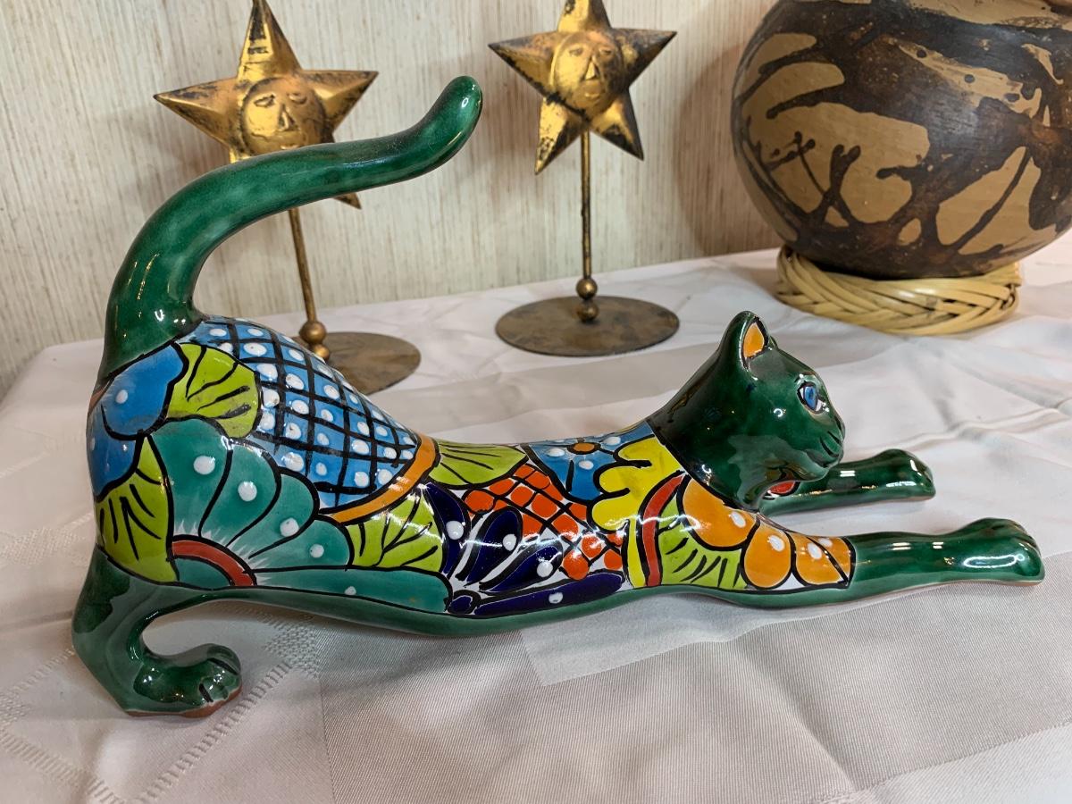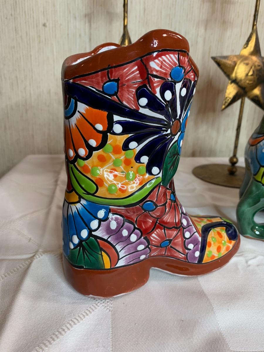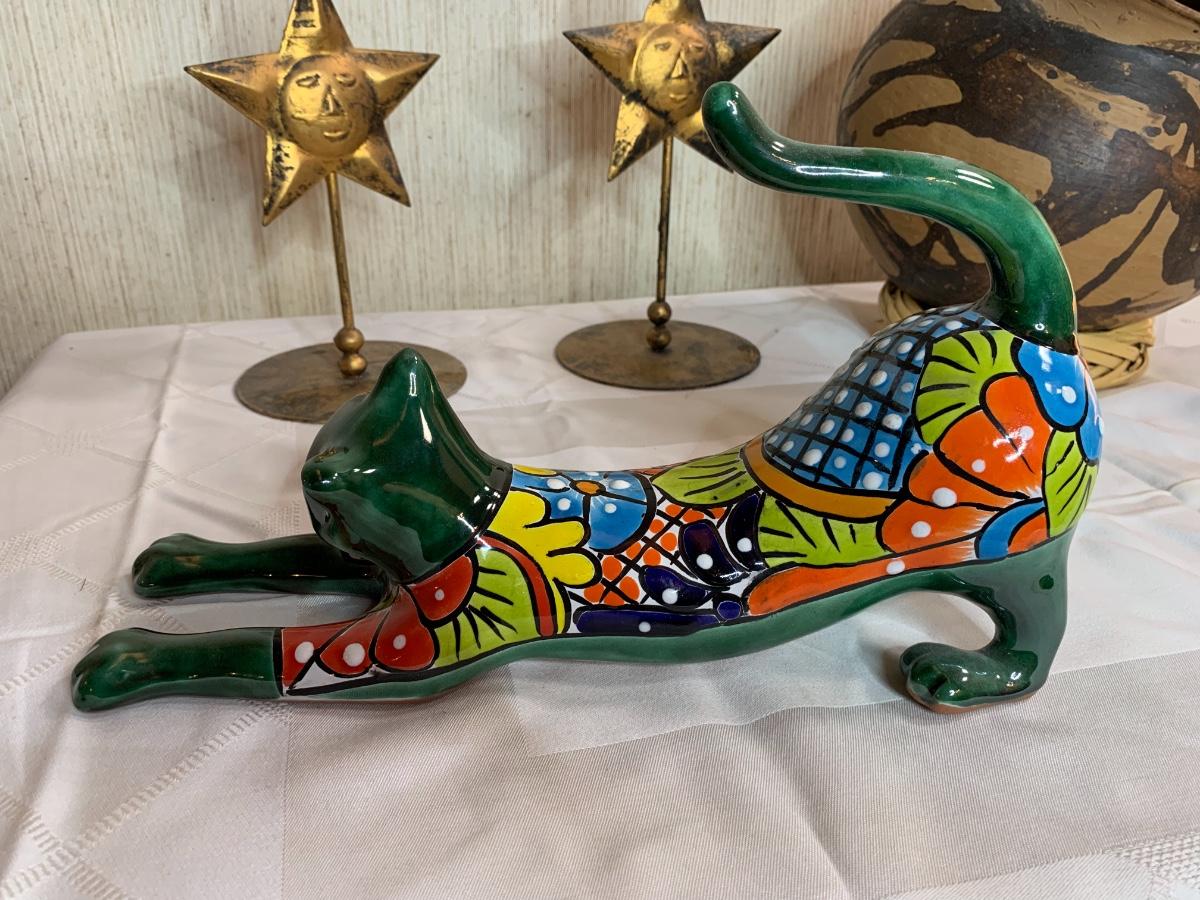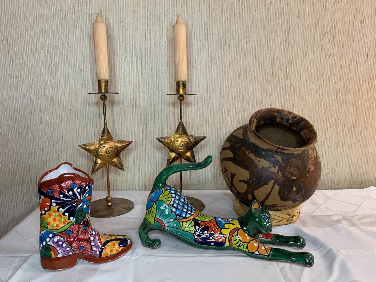 Hecho en Mexico pot, Two star with faces candlesticks, Boot and Cat Talavera figurines.