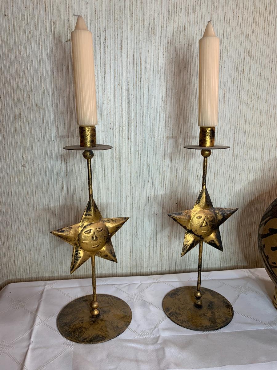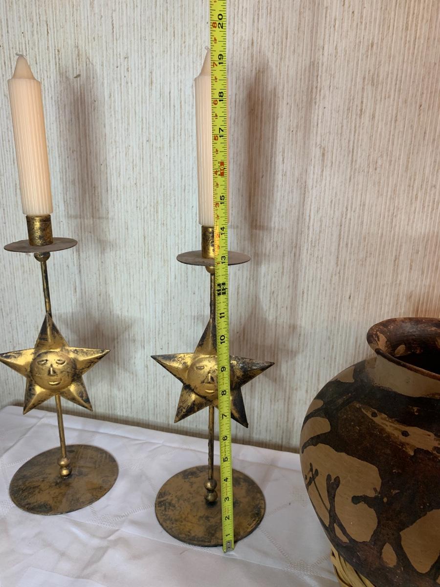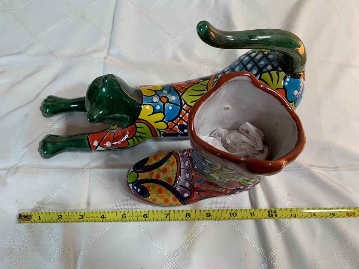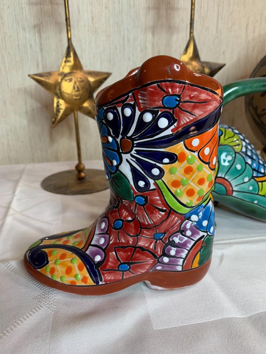 Hecho en Mexico pot, Two star with faces candlesticks, Boot and Cat Talavera figurines.