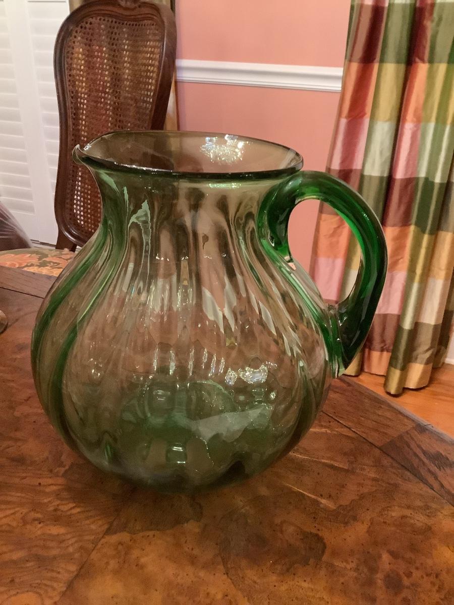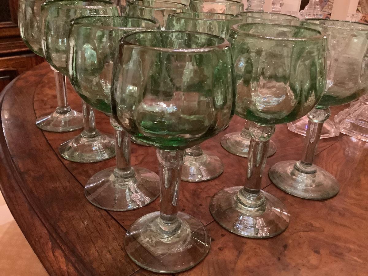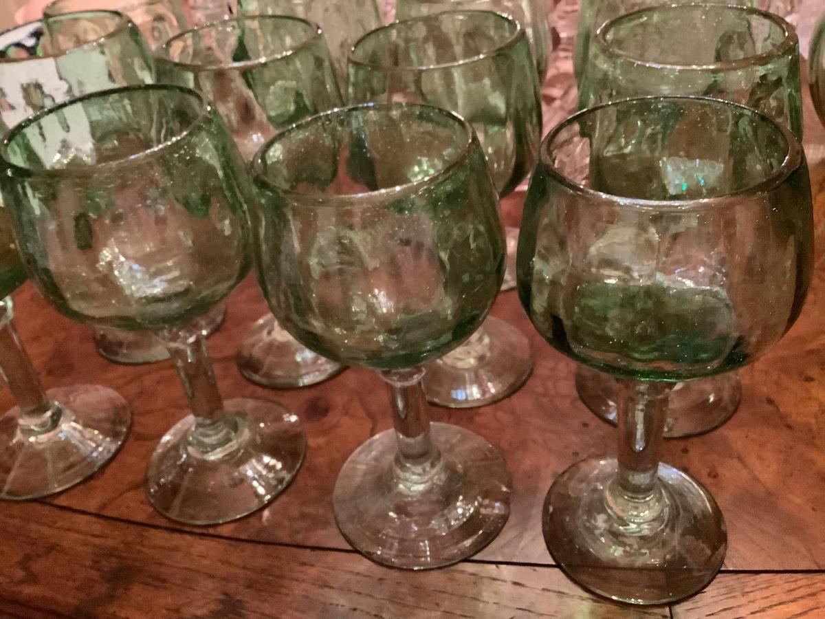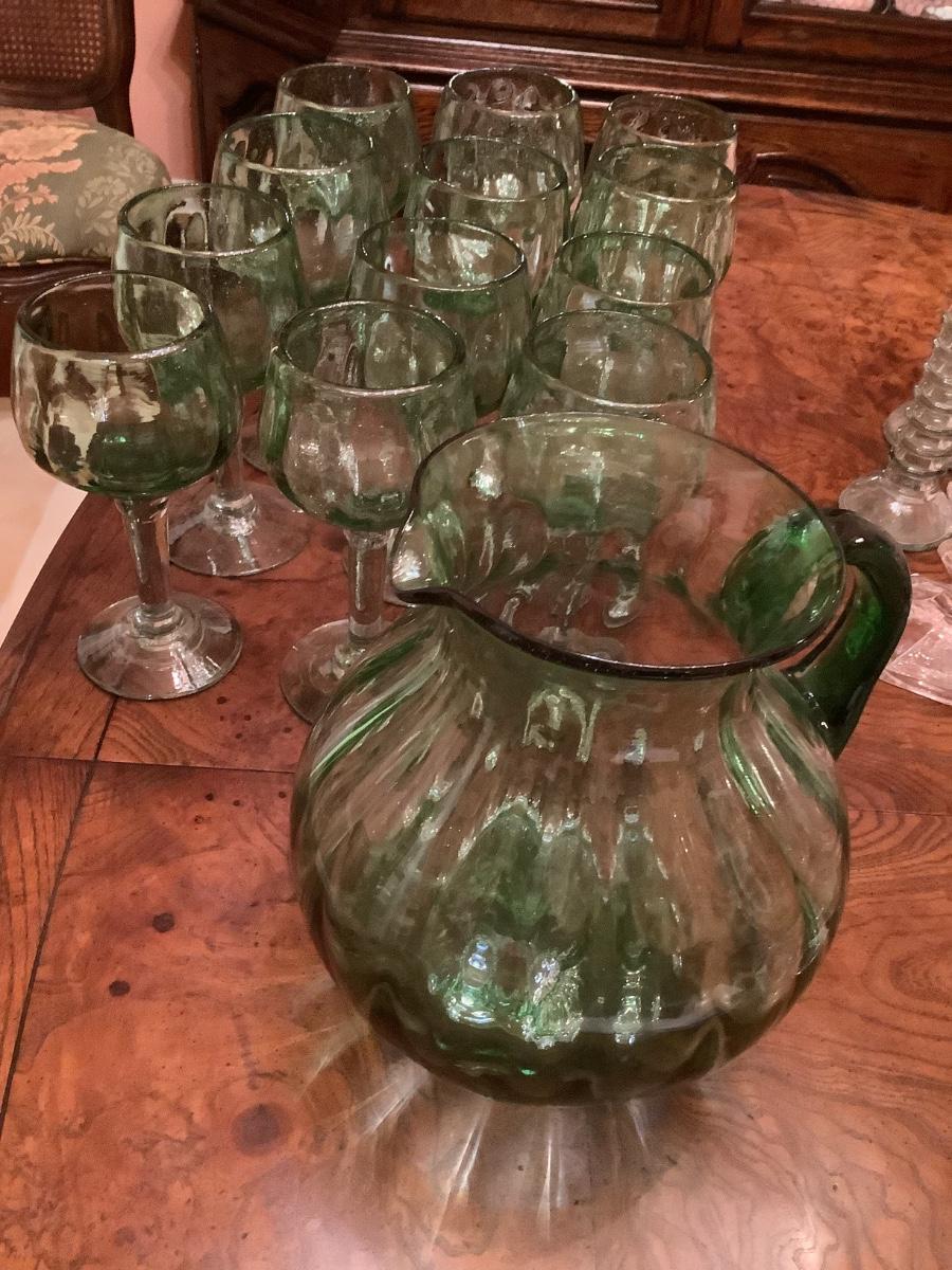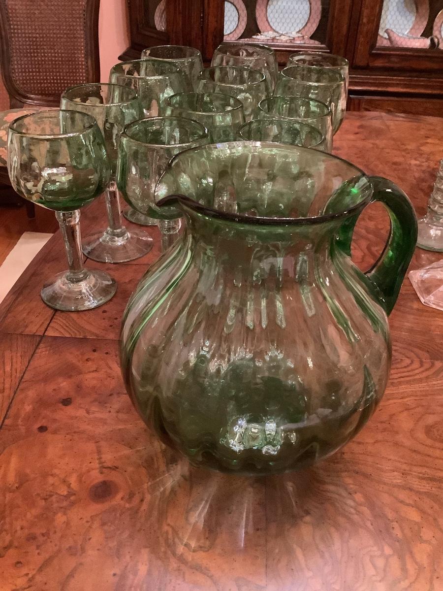 Mexican glass stemware -12 pieces and a green glass pitcher