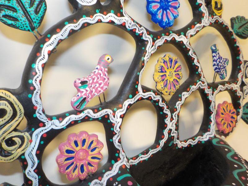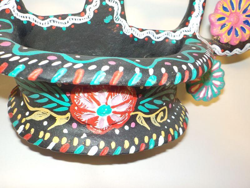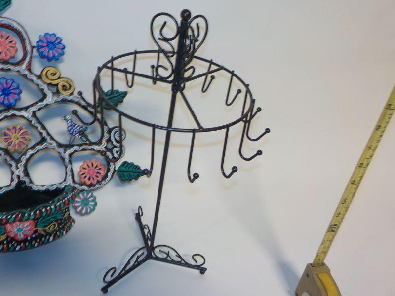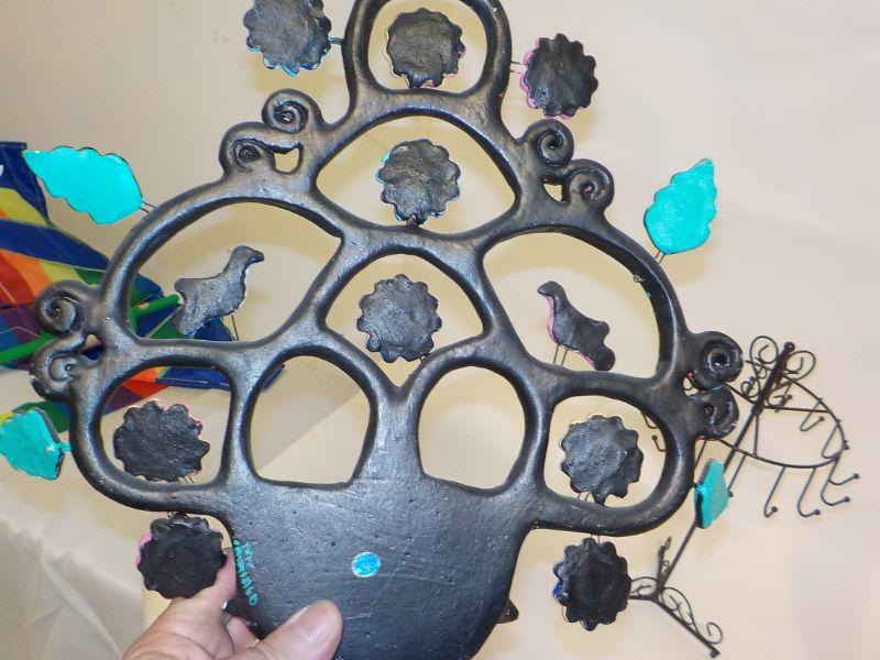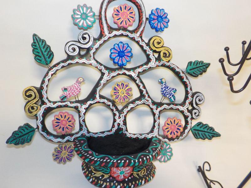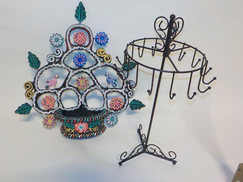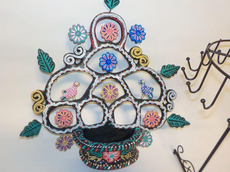 Mexican wall art with small basket; basket has drainage hold, so could be used as planter. Metal jewelry holder.