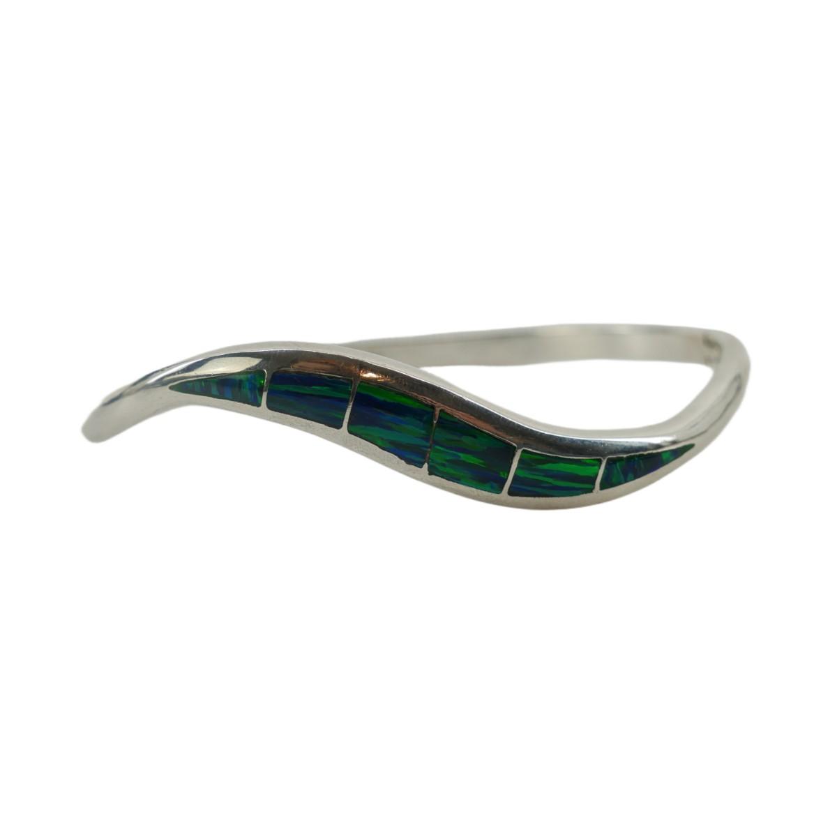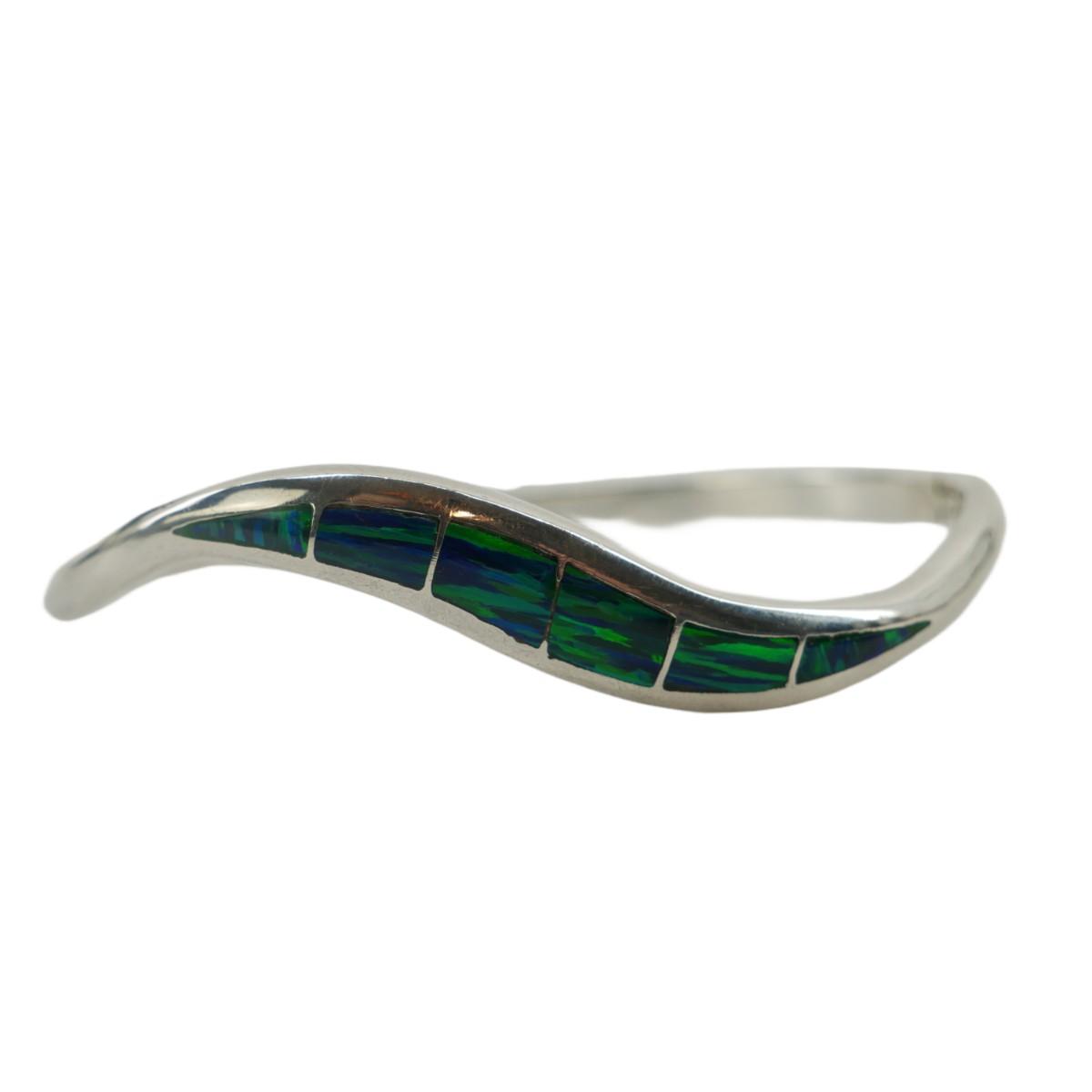 Hinged blue and green opal and silver bracelet bangle, stamped Mexico. Measures approximately 2.5" inside. Gorgeous piece!