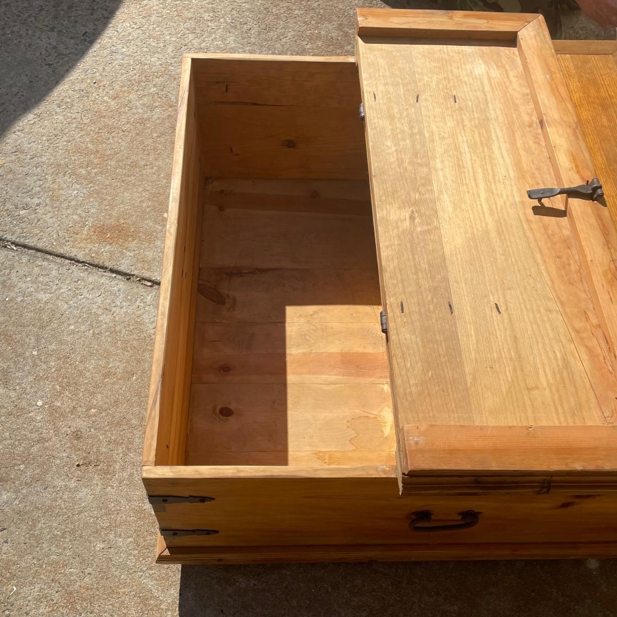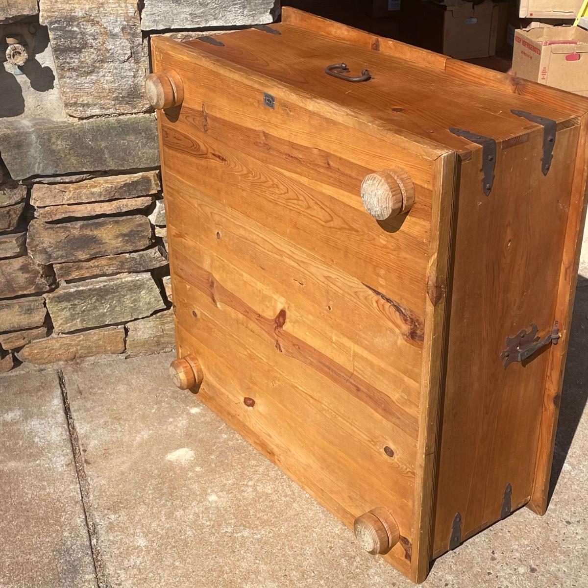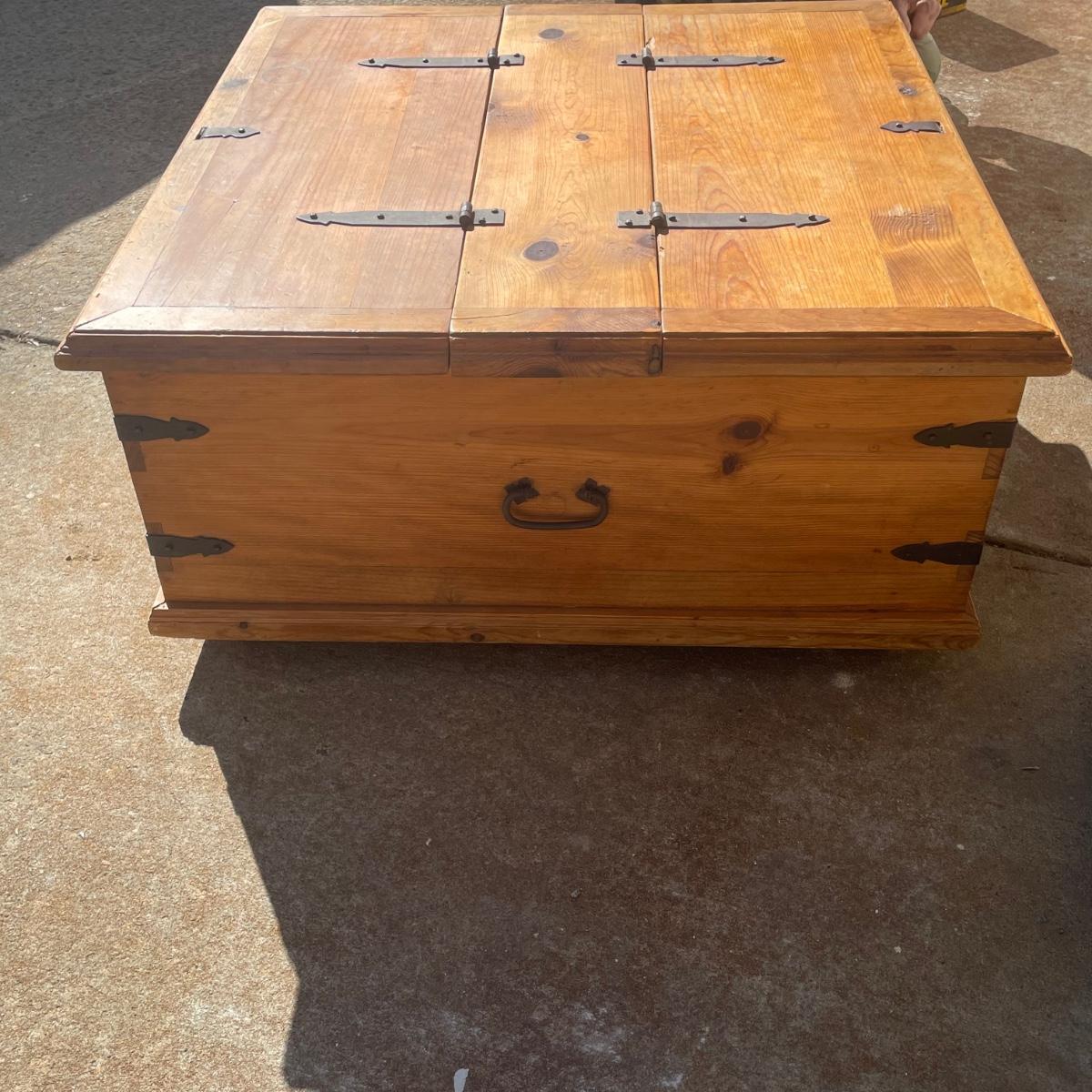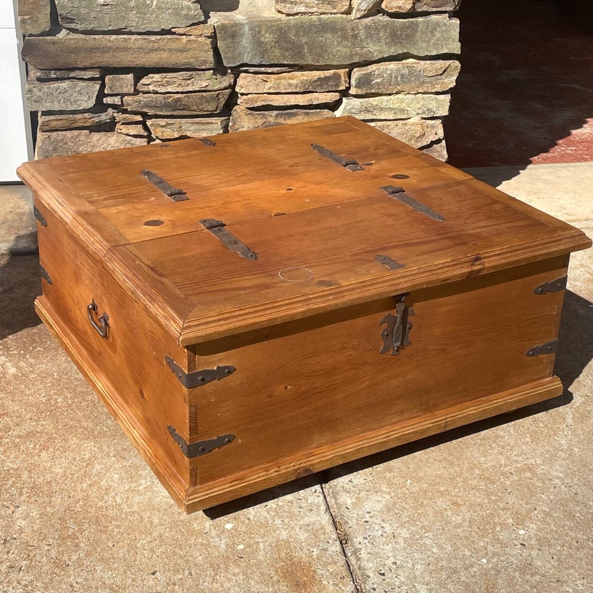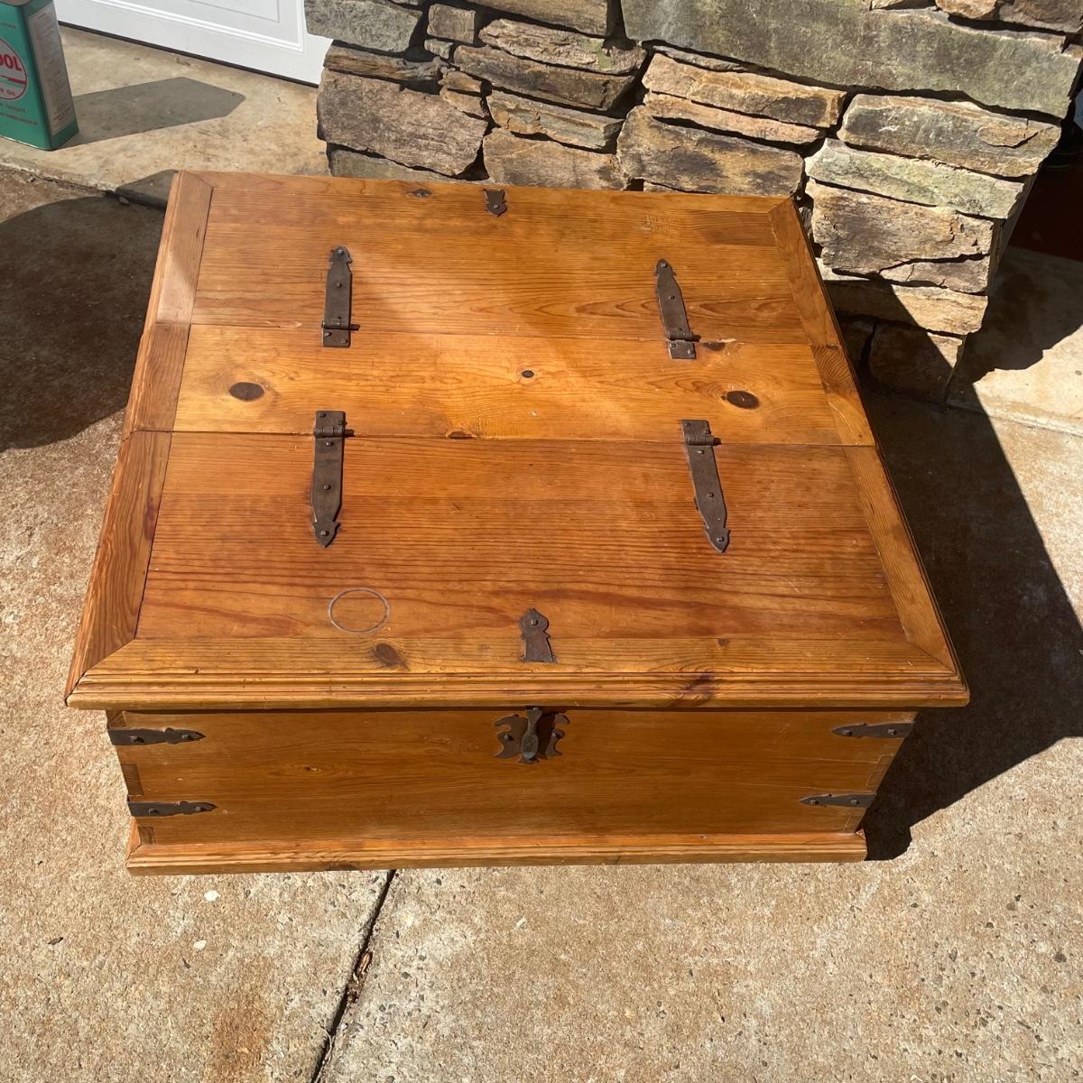 Plenty of storage within this solid pine wood coffee table that has metal accents, hinges and handles. It’s in overall good condition but does have a few dings and an inset ring mark that will need sanding. Measures 35” square x 18” tall.