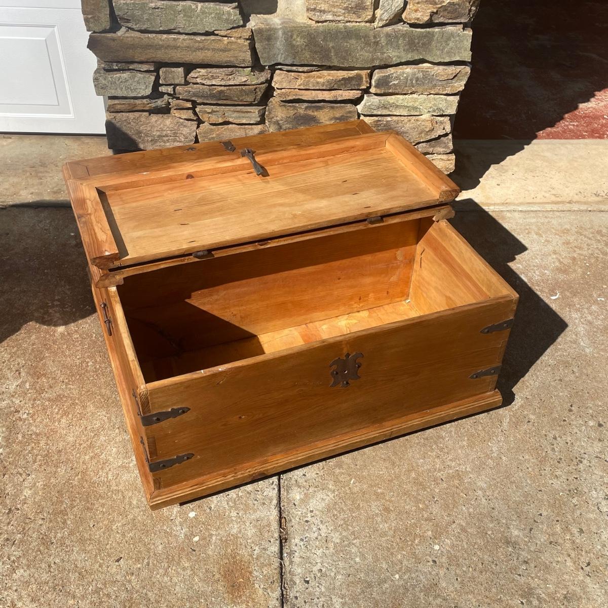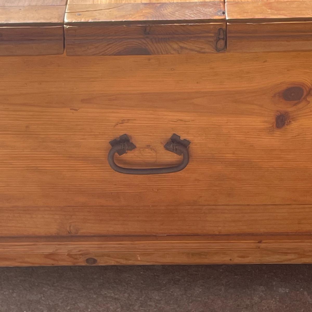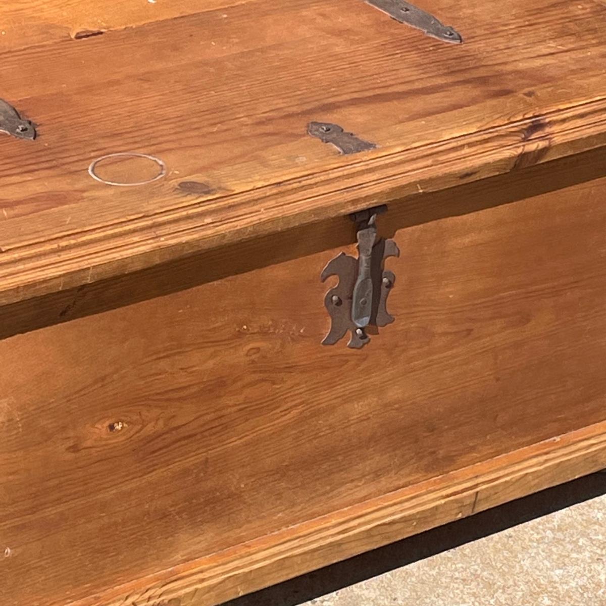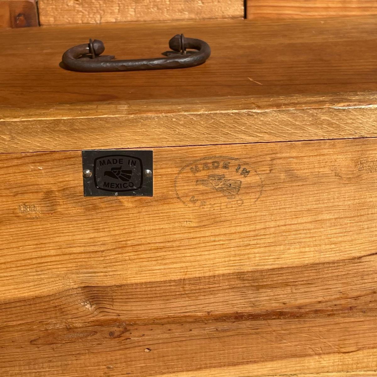 Plenty of storage within this solid pine wood coffee table that has metal accents, hinges and handles. It’s in overall good condition but does have a few dings and an inset ring mark that will need sanding. Measures 35” square x 18” tall.