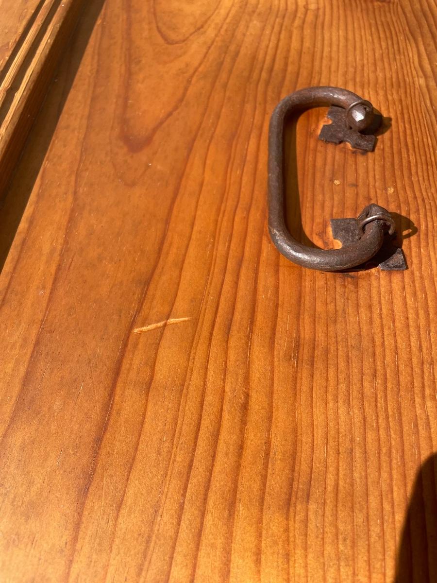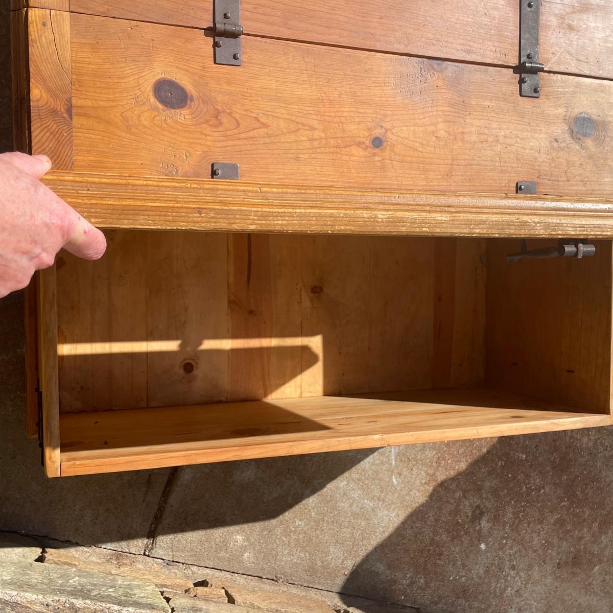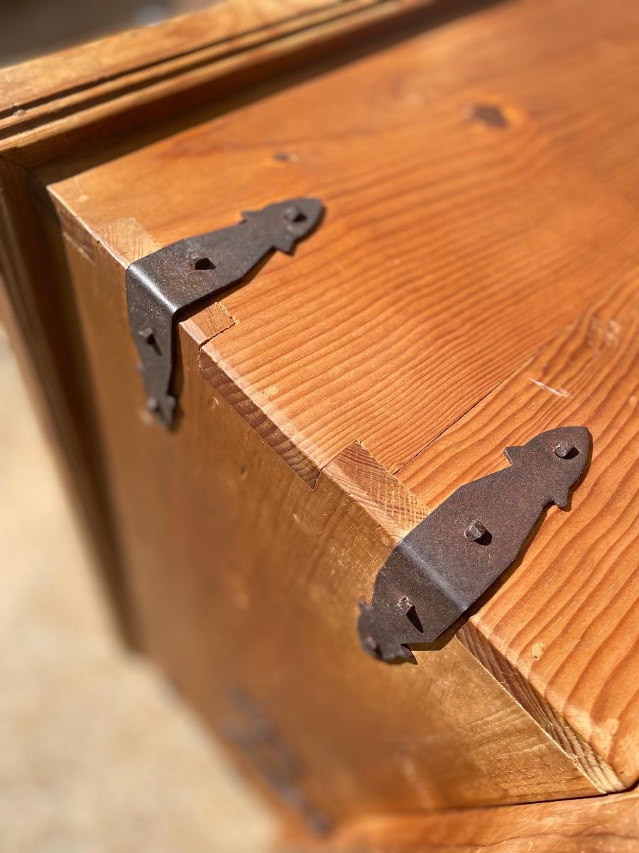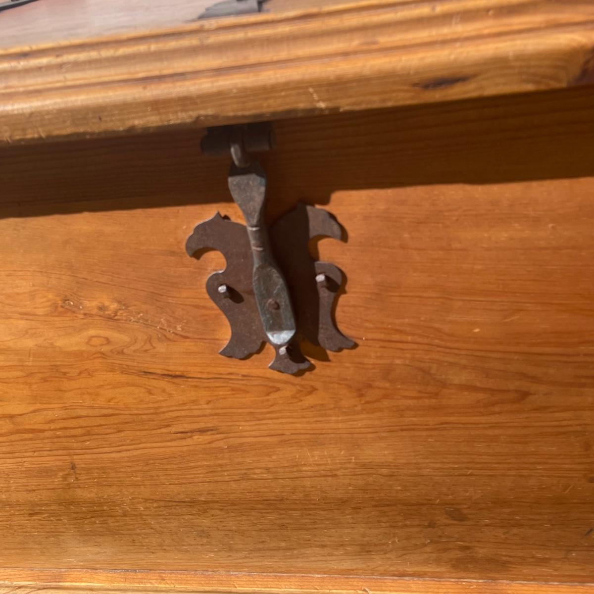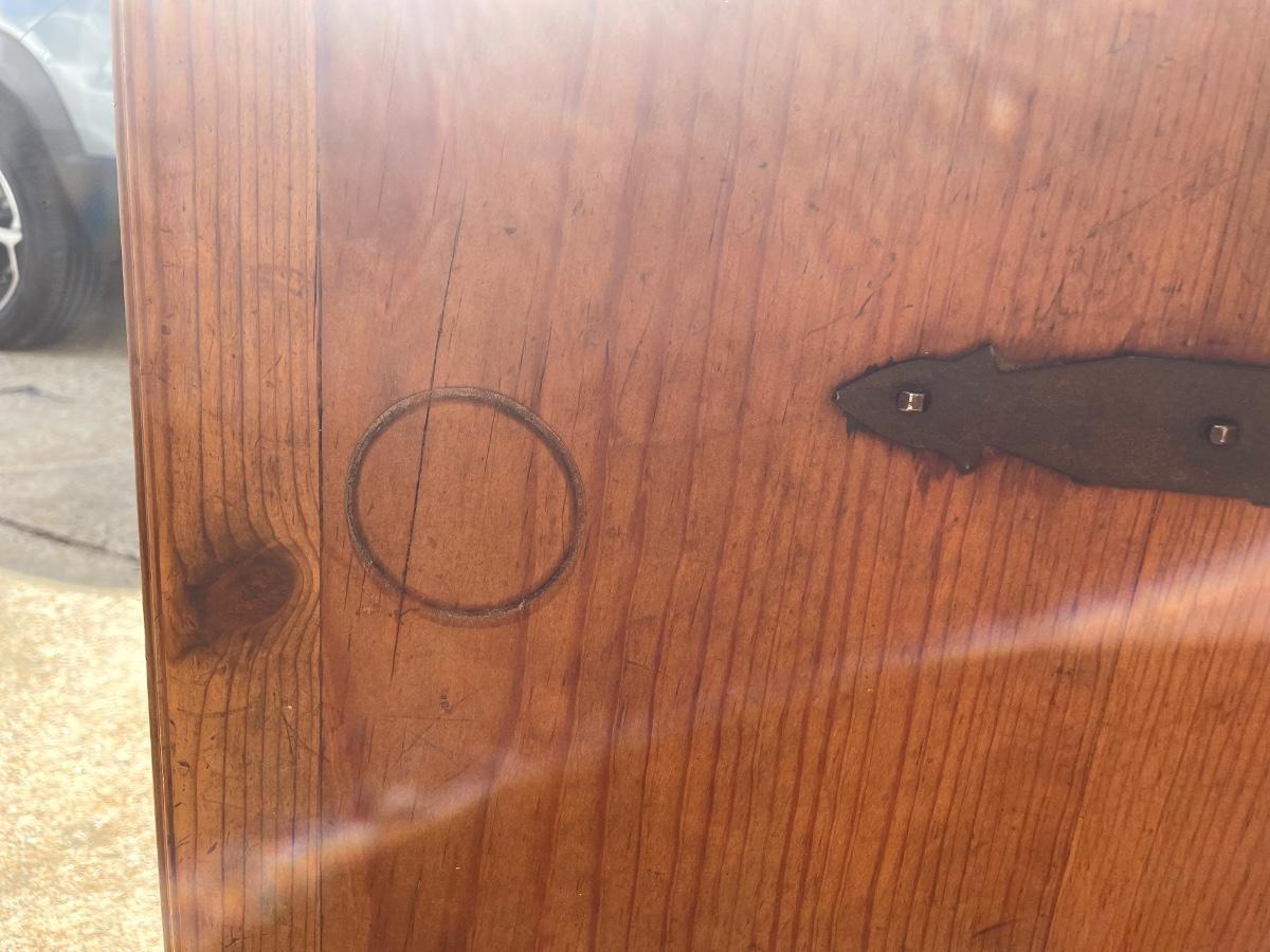 Plenty of storage within this solid pine wood coffee table that has metal accents, hinges and handles. It’s in overall good condition but does have a few dings and an inset ring mark that will need sanding. Measures 35” square x 18” tall.