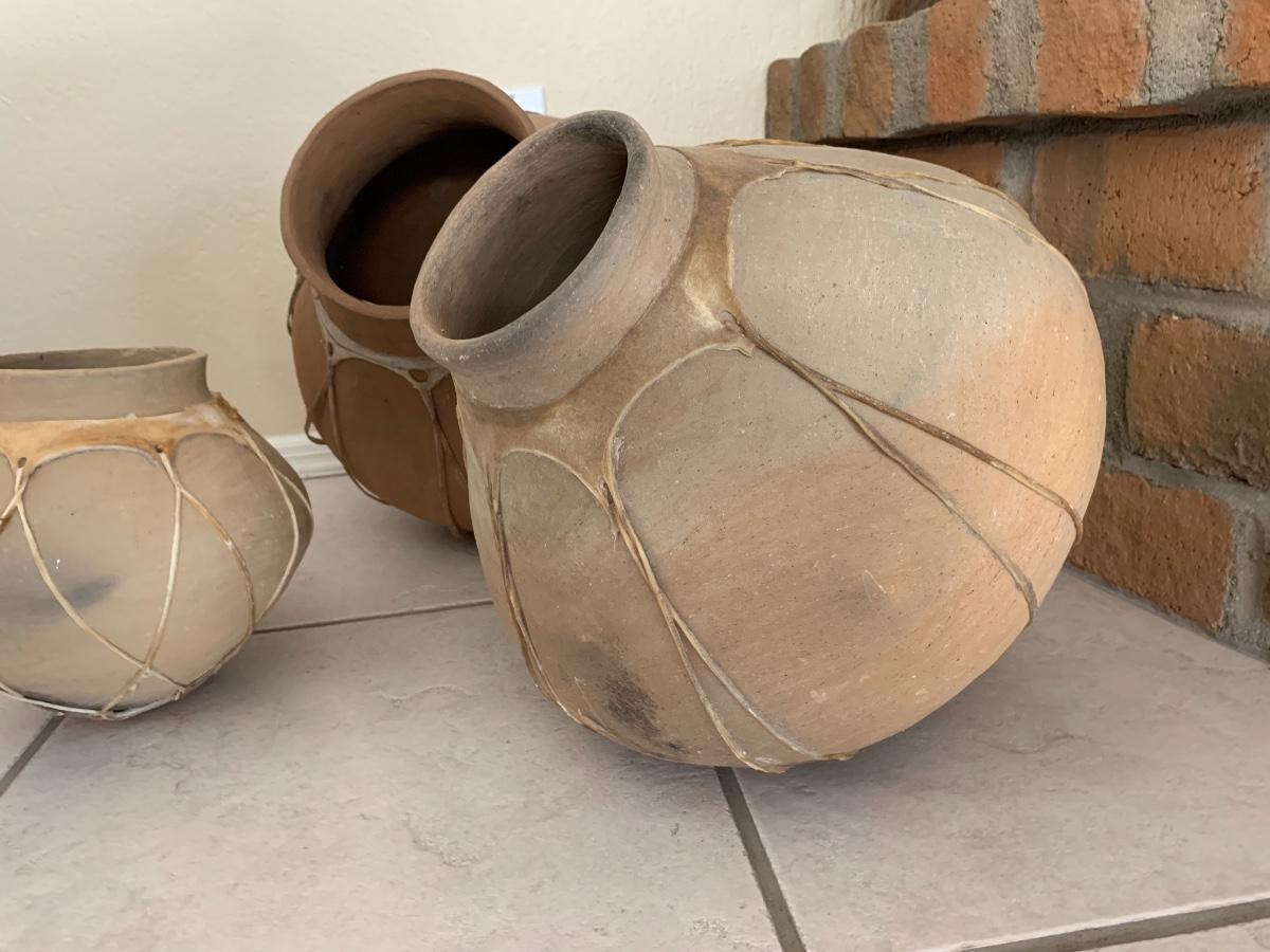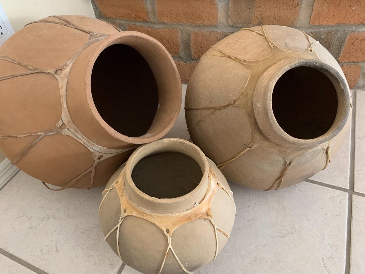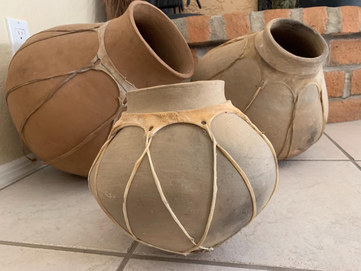 3 piece Mexican pottery with raw hide straps all in great condition