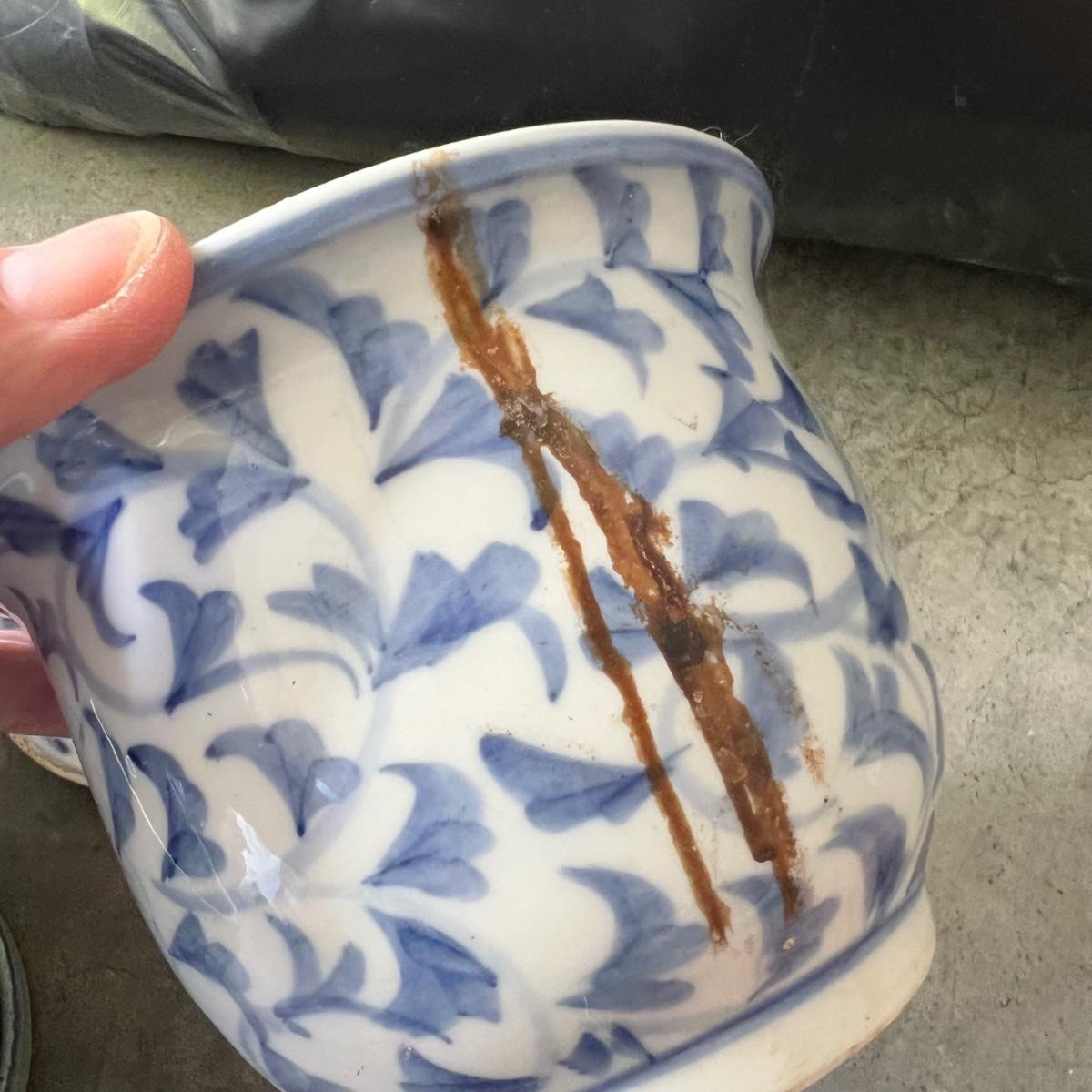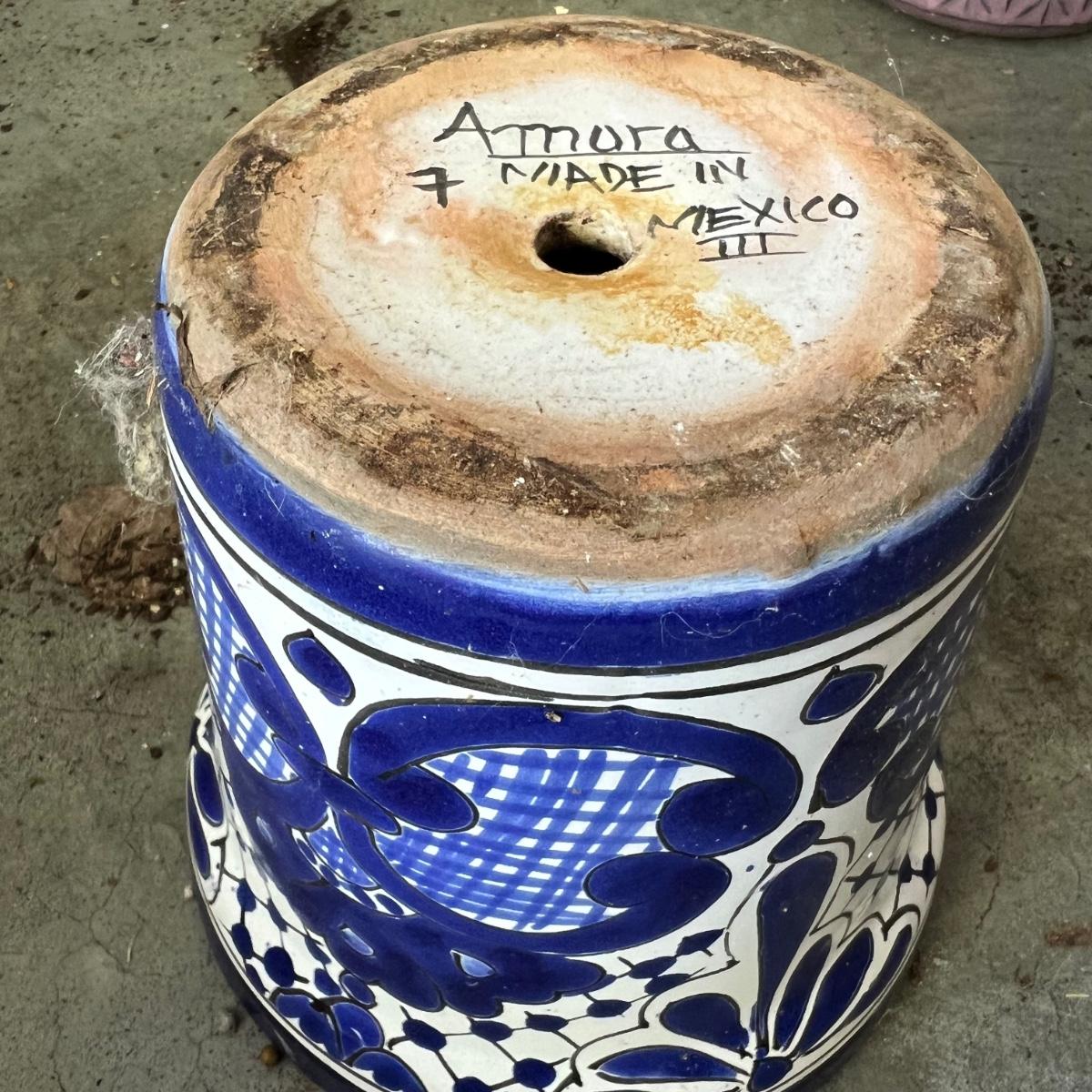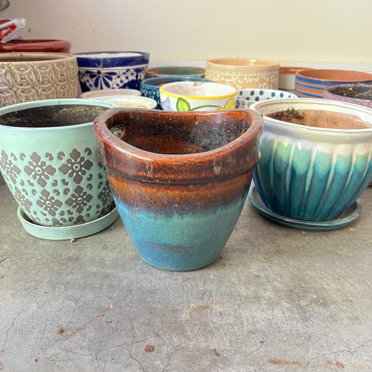 A great assortment of mostly glazed 15 plus ceramic plant pots in this lot. Some have attached drip trays. The Mexican planter is signed Amura and measures 7”D x 7”H. One white planter with blue leaves has a blemish, see image.