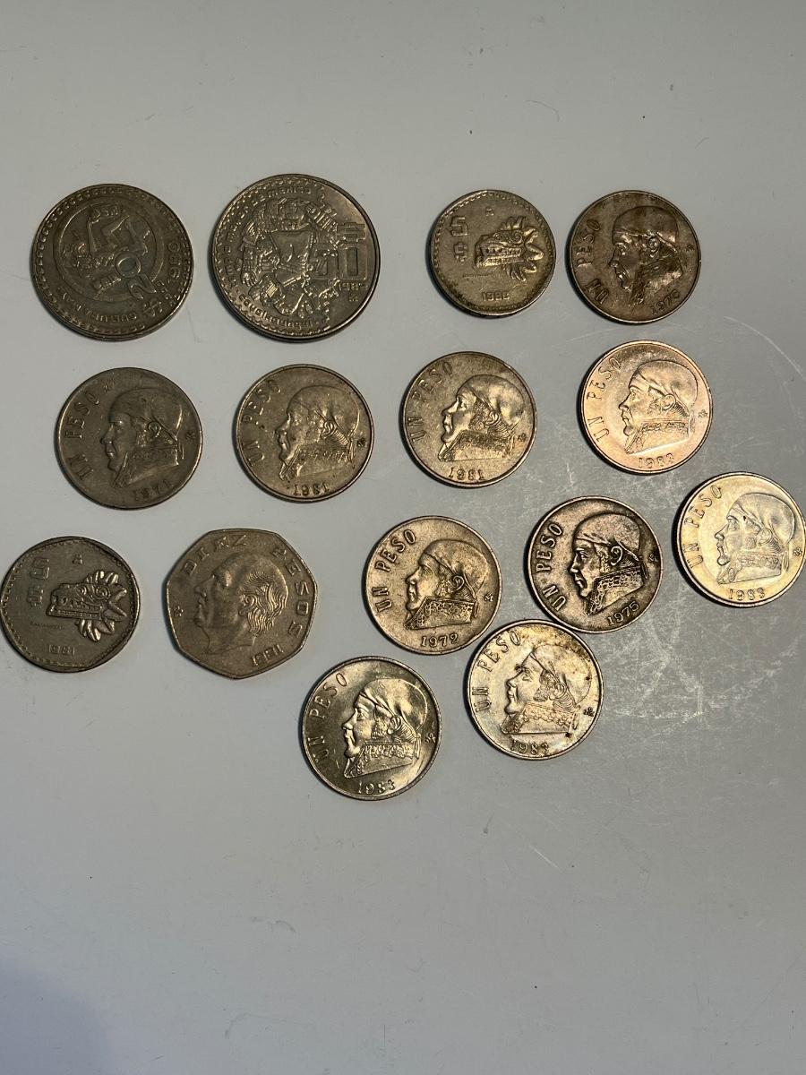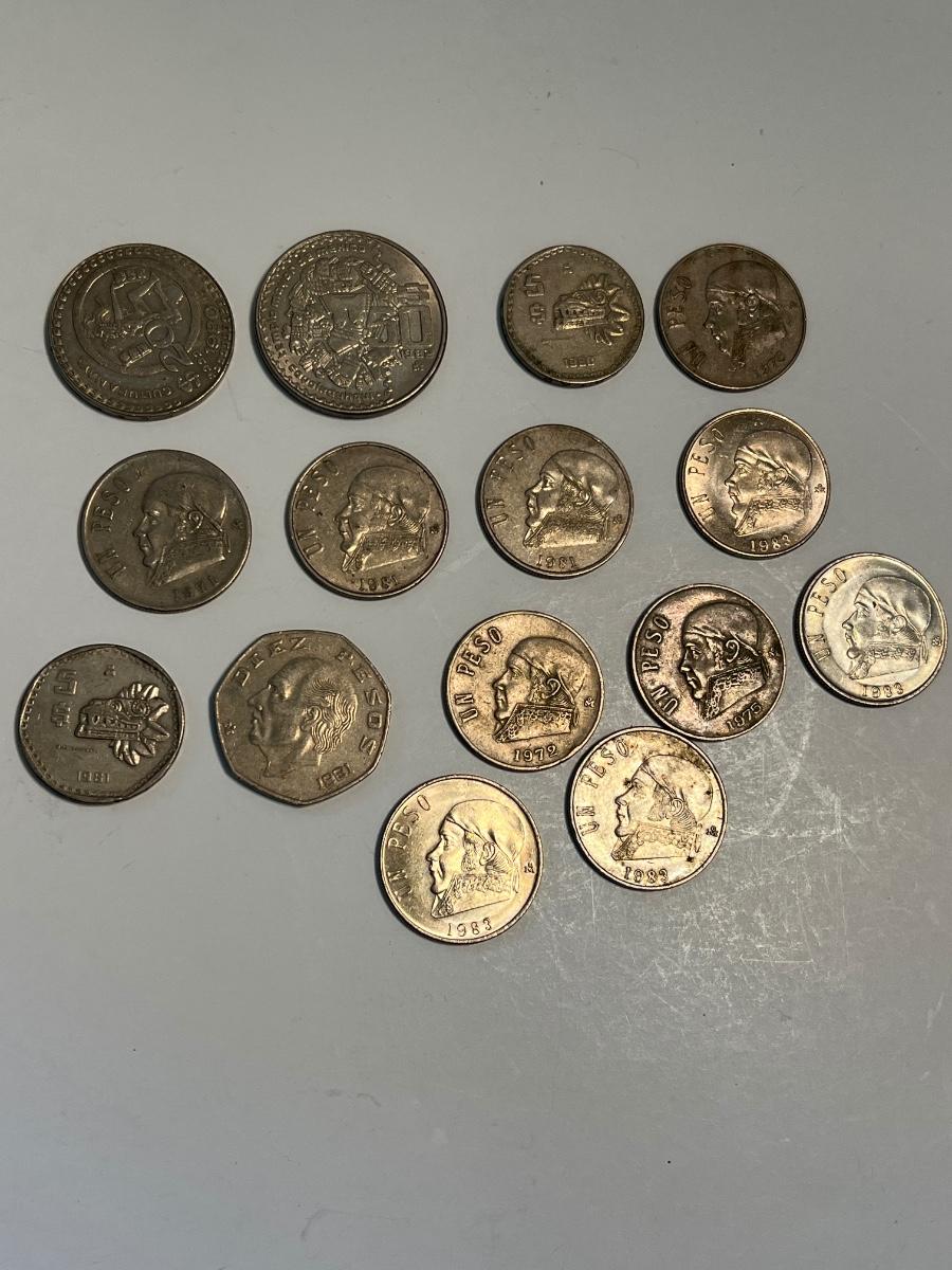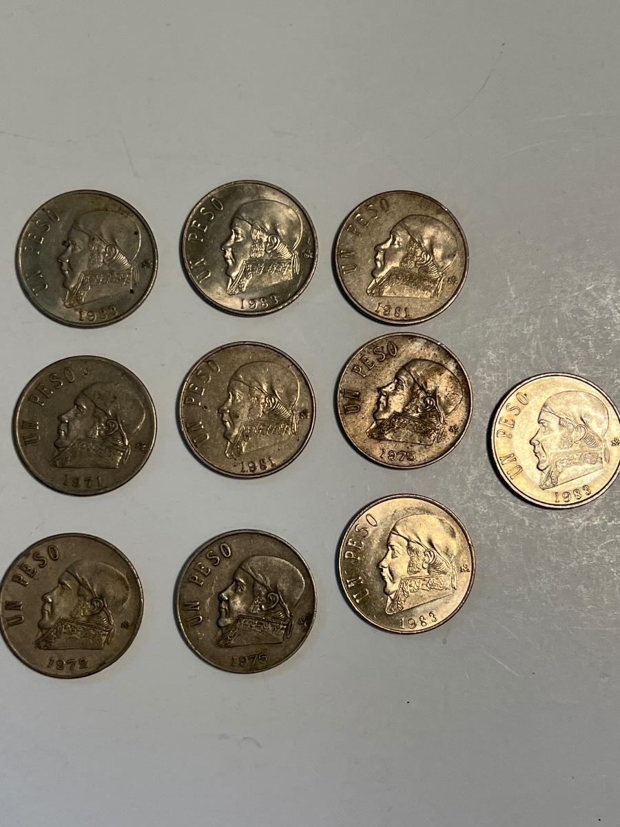 10 peso coins, a 50 peso and 20 peso, two 5 pesos, and a 10 peso. 1980’s.