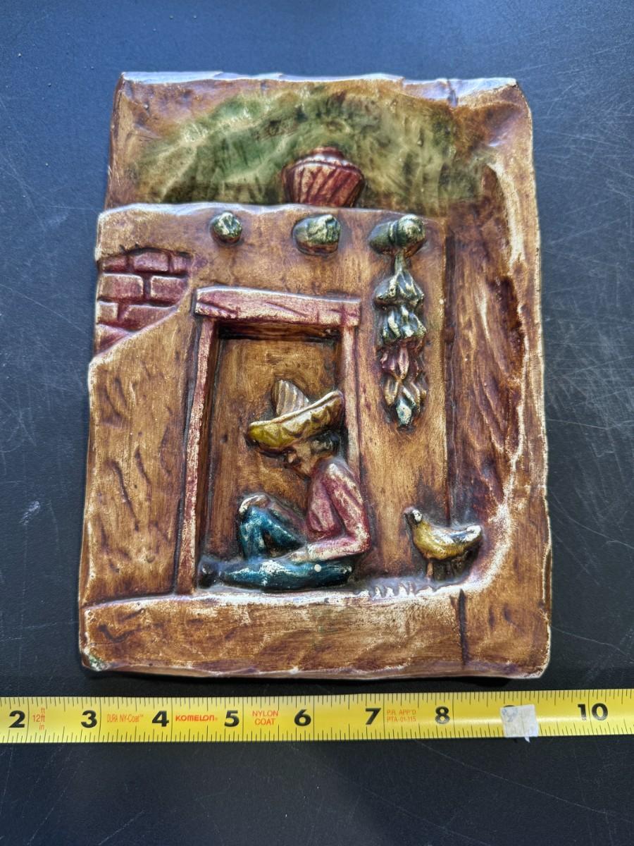 Depiction: The plaque depicts a "siesta man," a common motif in Mexican folk art, often shown resting or sleeping under a sombrero, frequently accompanied by animals like the chicken seen in your image.