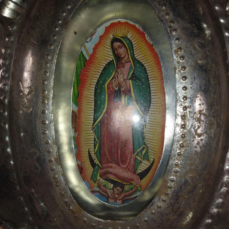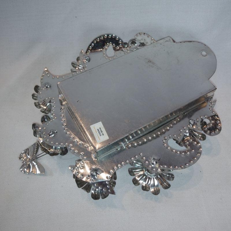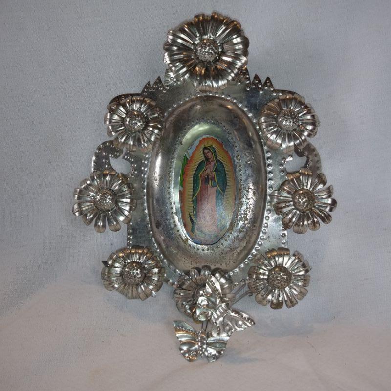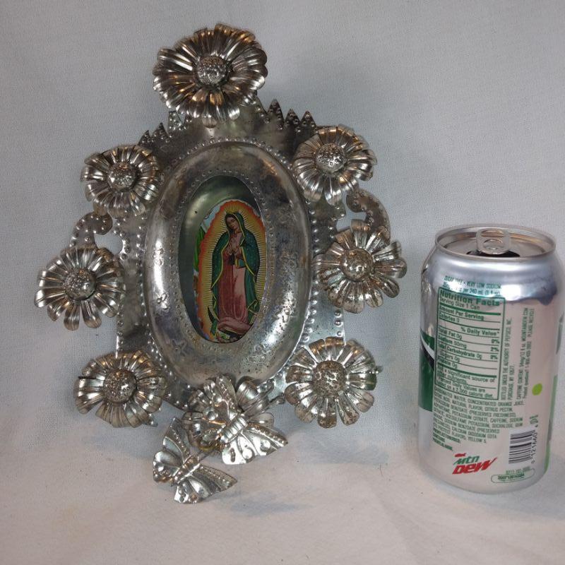Very pretty and ornate tinwork framed Madonna. Tinwork shows some age and rust but still looks very good. A very unusual piece. Hook on back for hanging. It is 11-inches tall X 8-1/2-inches wide X 3-inches thick.