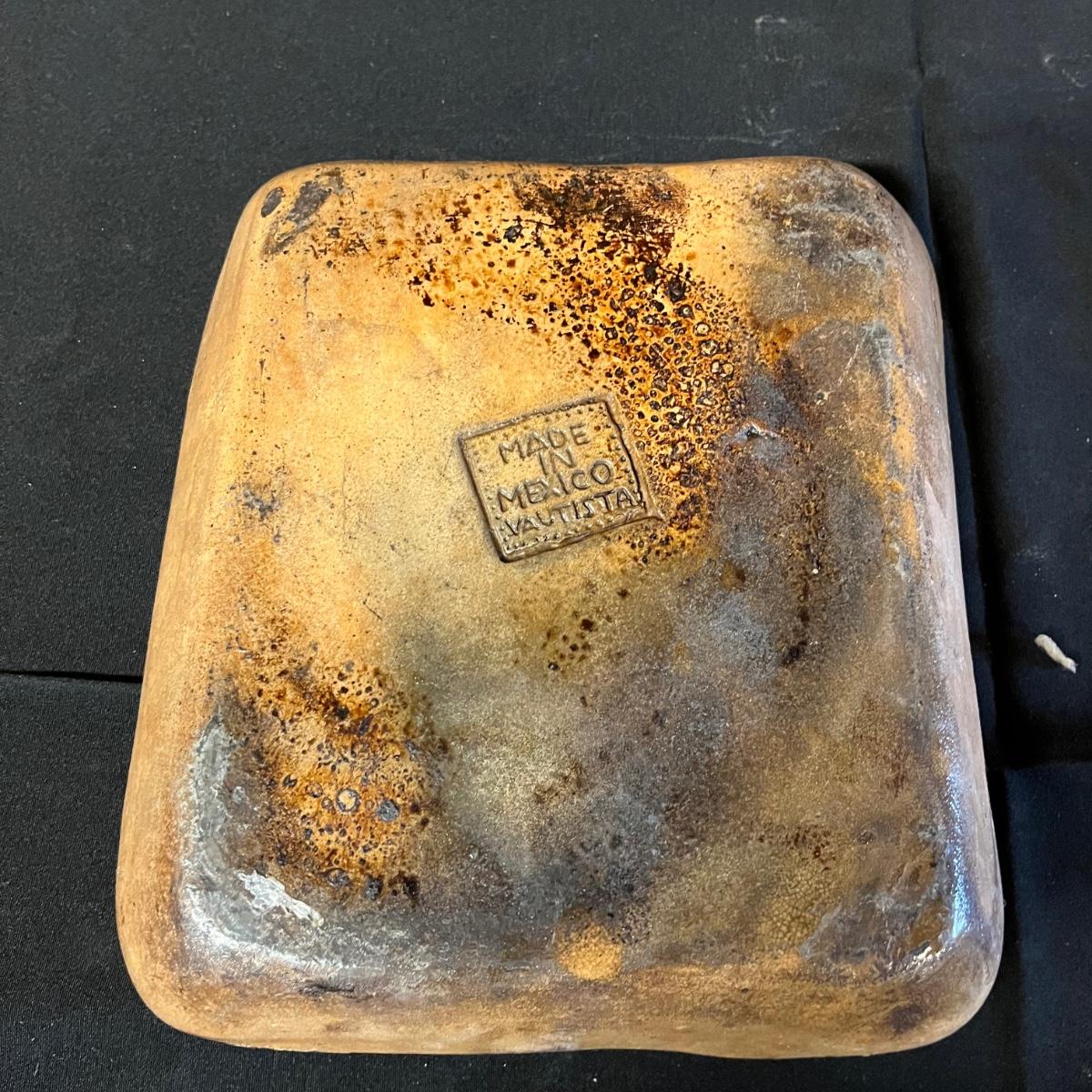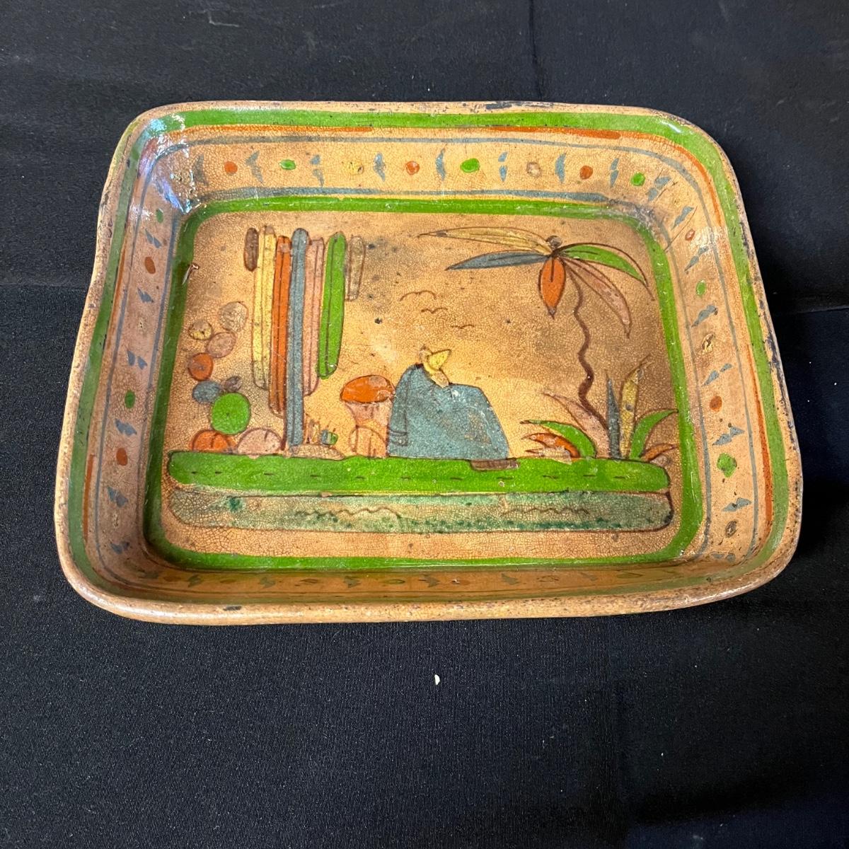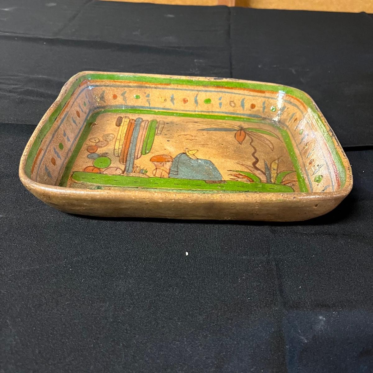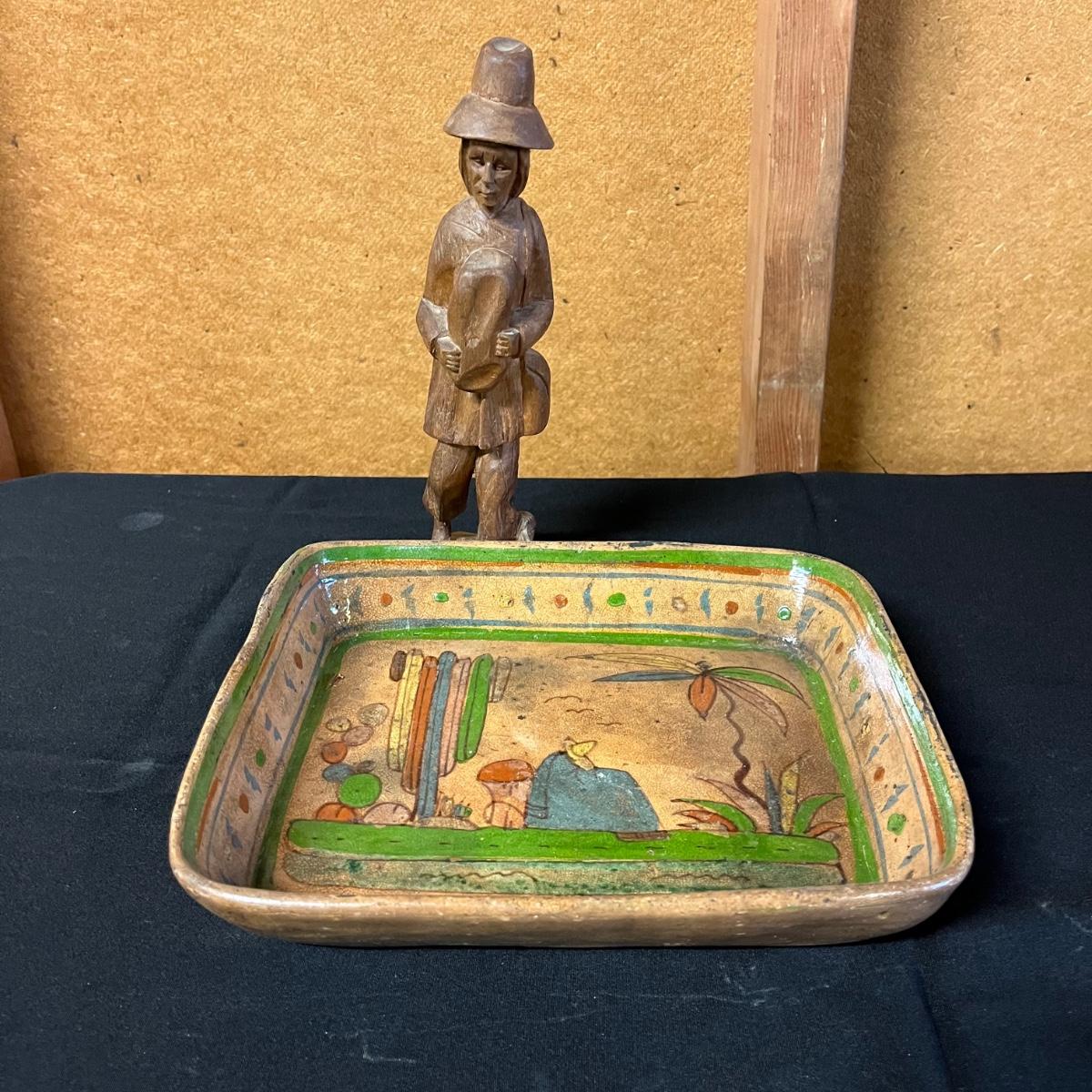 Lot includes a Mexican pottery tray and a wooden figurine. Figurine has small split in base, see pictures. Tray measures 8” x 9” x 1.75”.