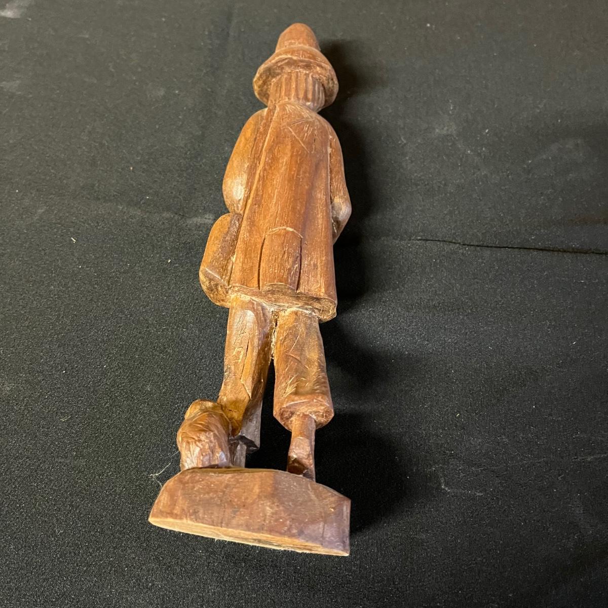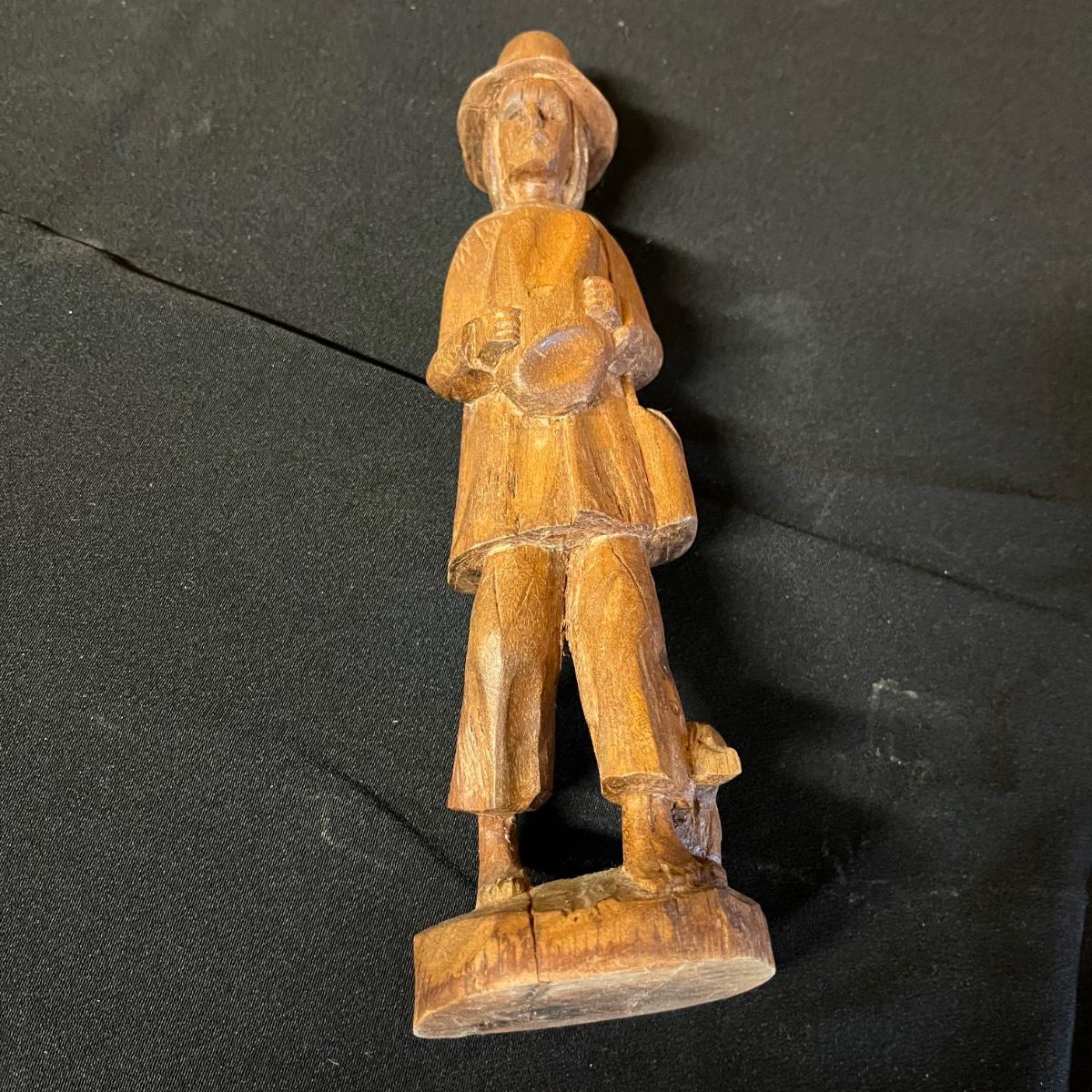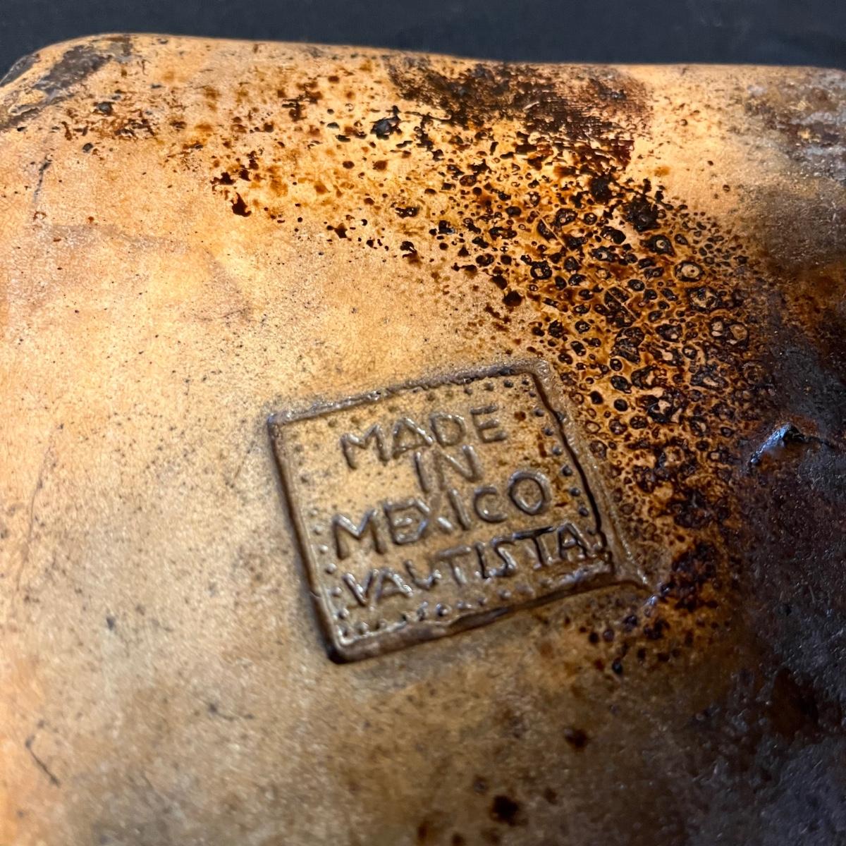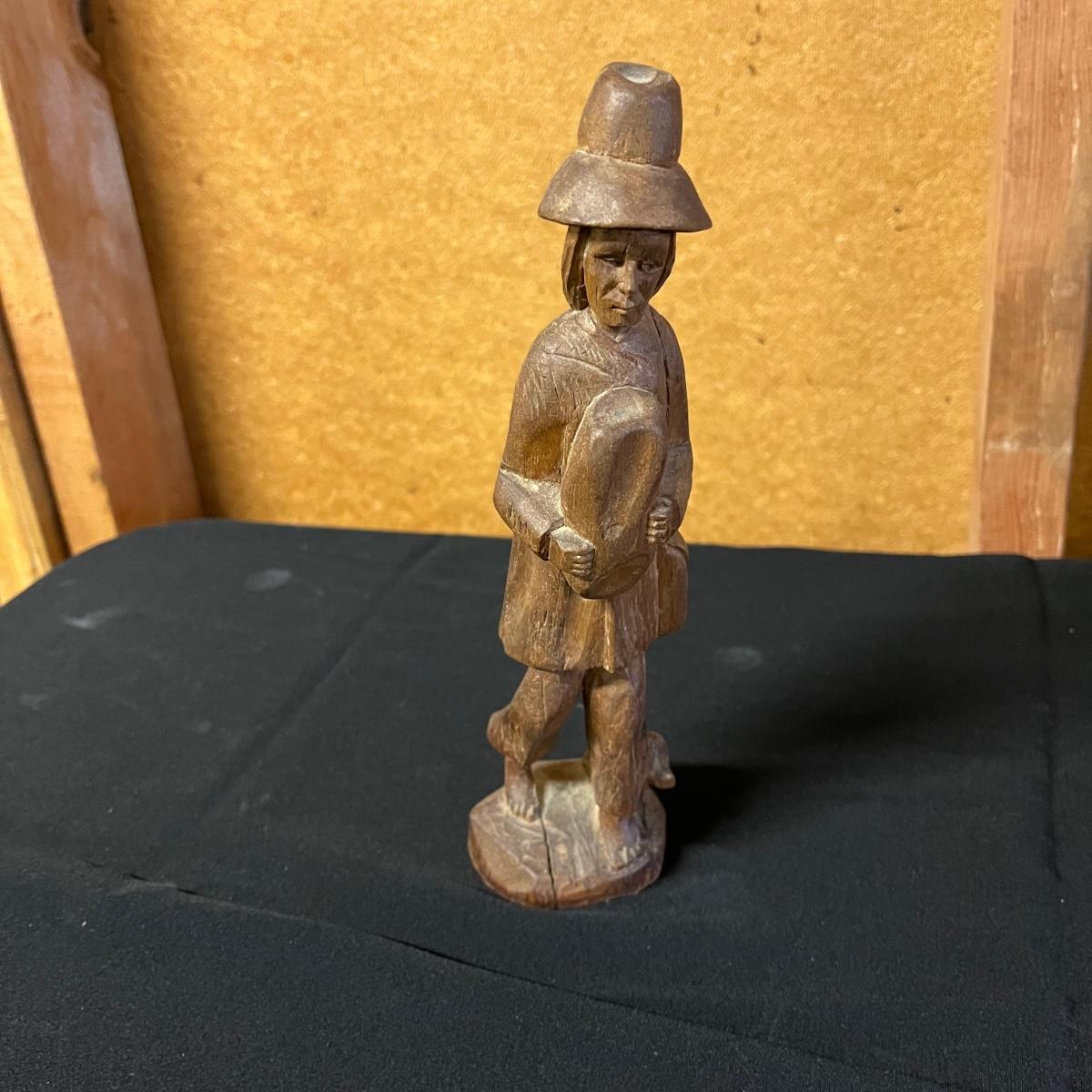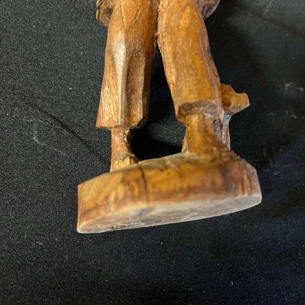 Lot includes a Mexican pottery tray and a wooden figurine. Figurine has small split in base, see pictures. Tray measures 8” x 9” x 1.75”.