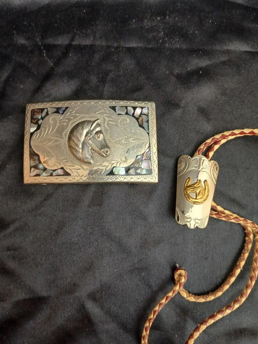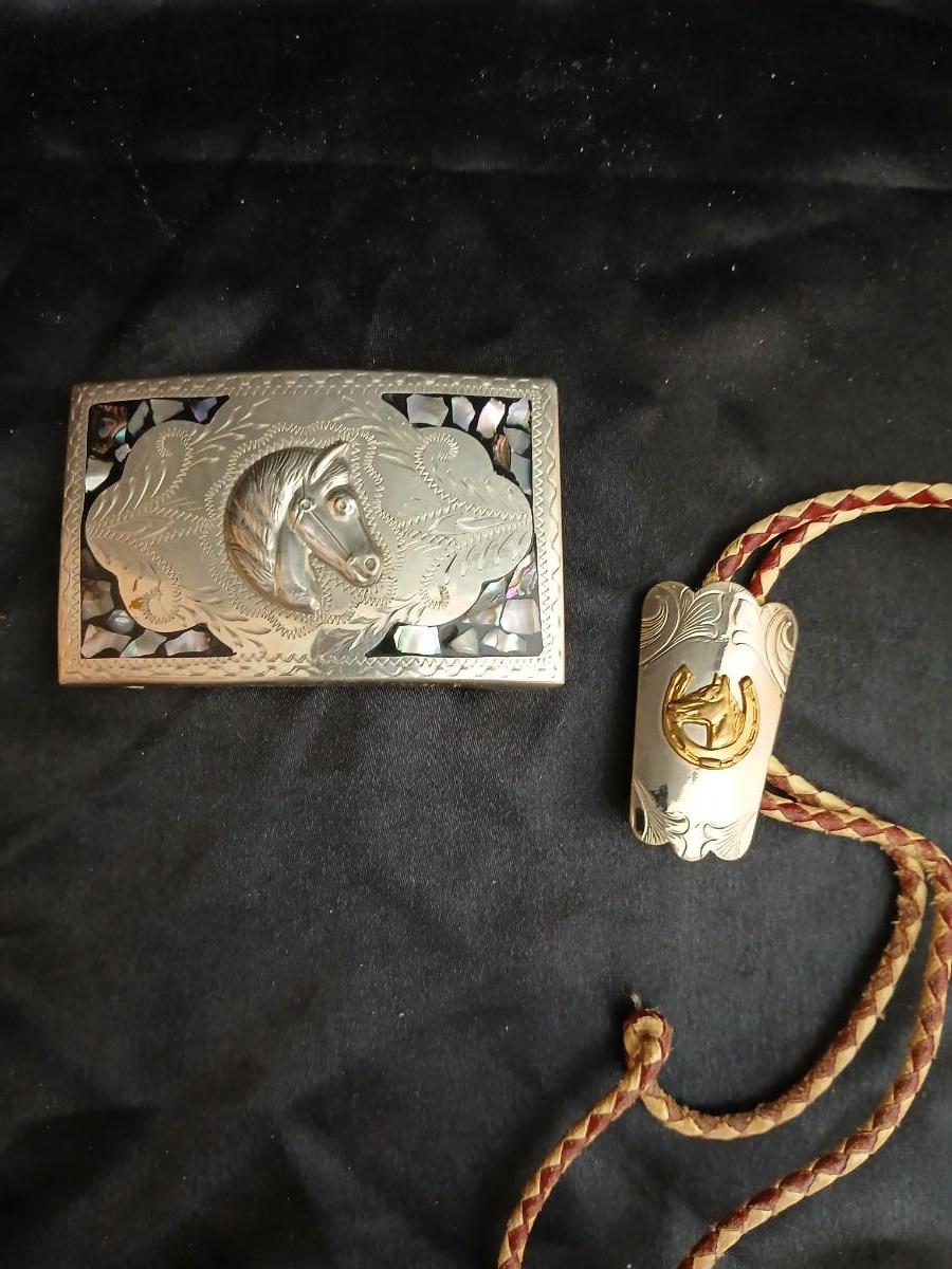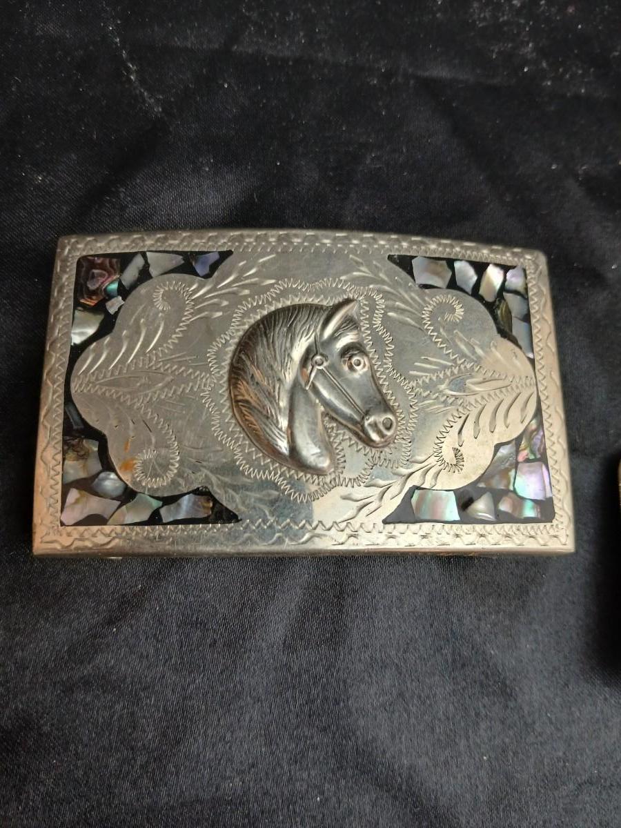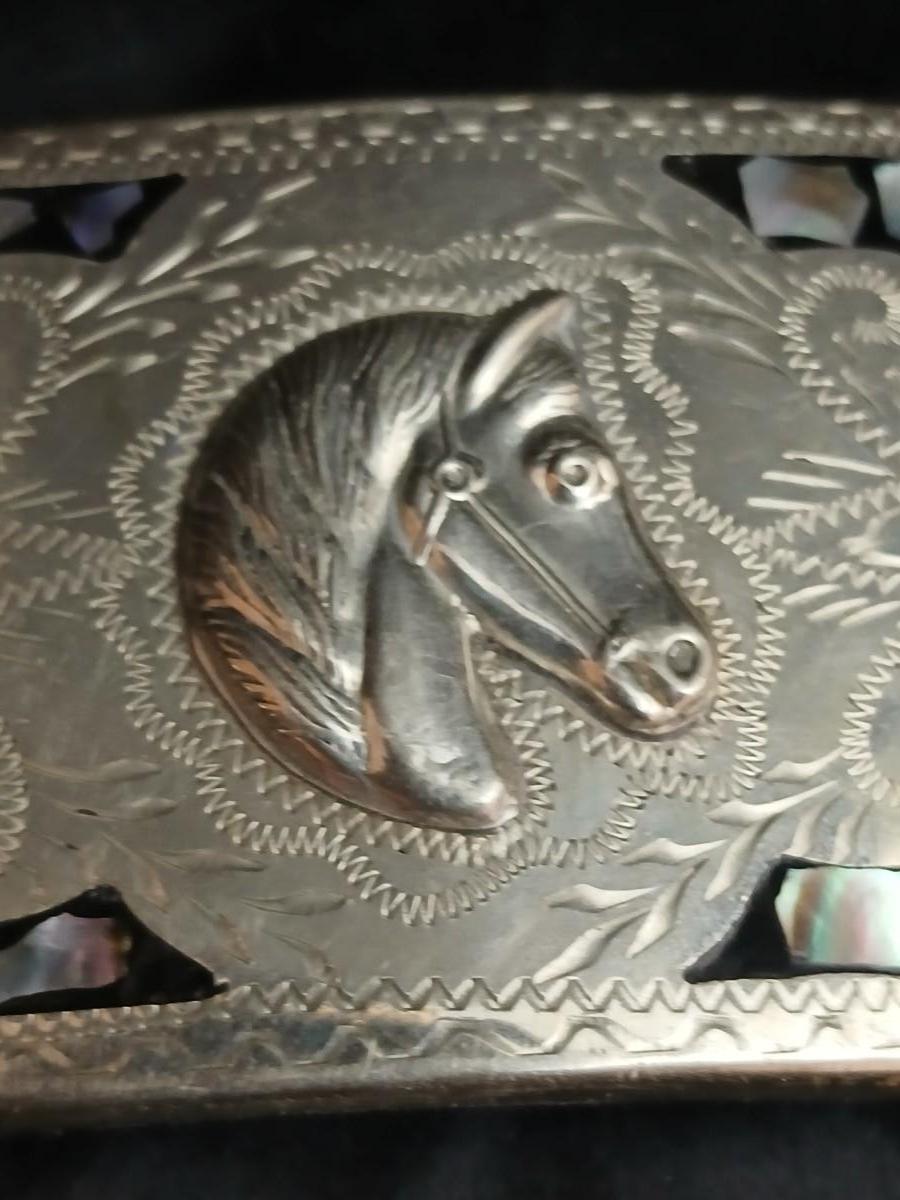 Mexico Alpaca silver toned and abalone inlaid belt buckle featuring a horse head design with a bolo tie clip featuring a horse