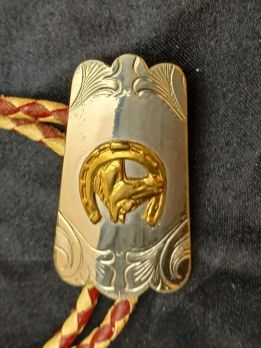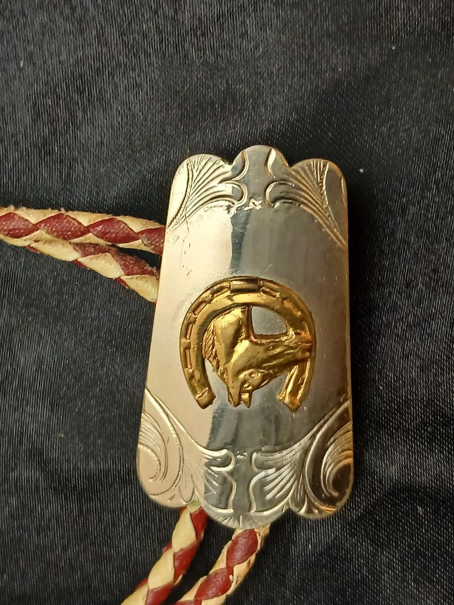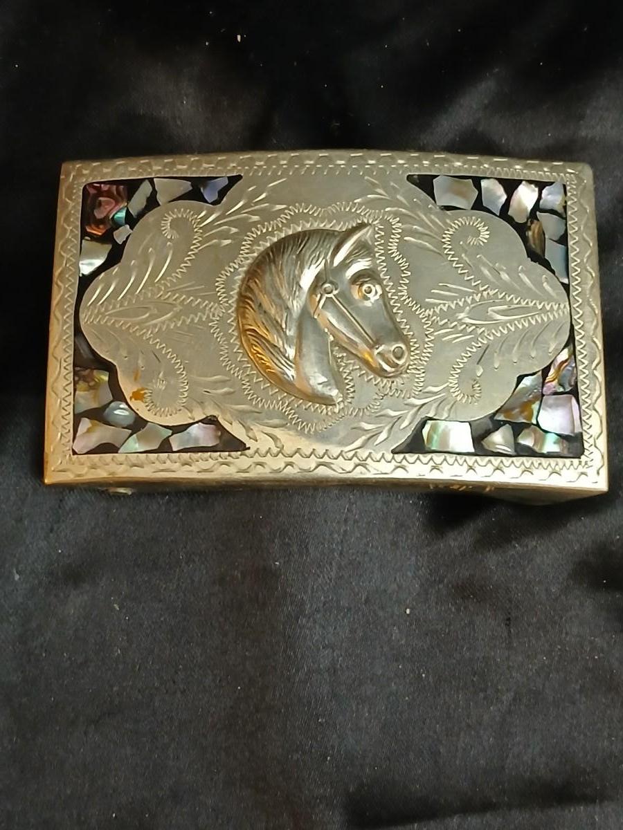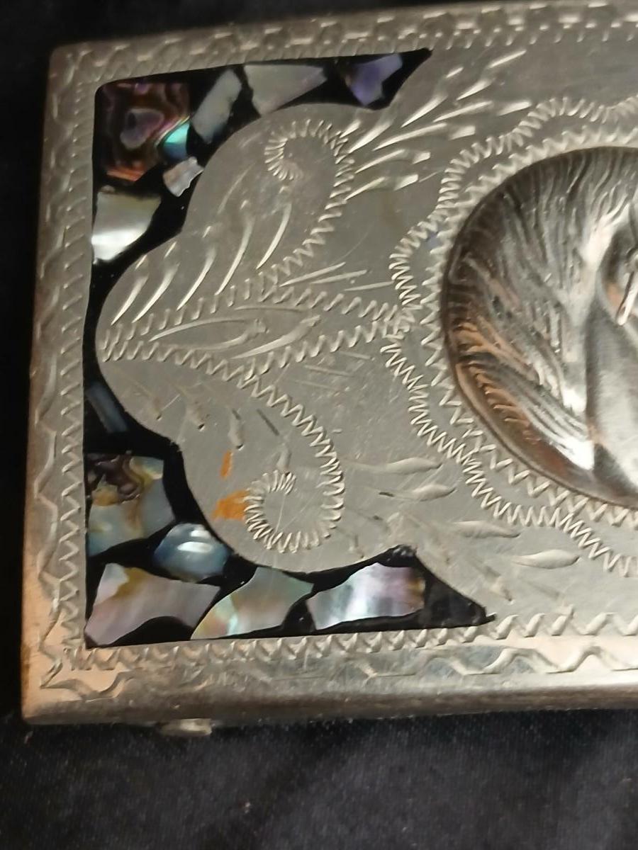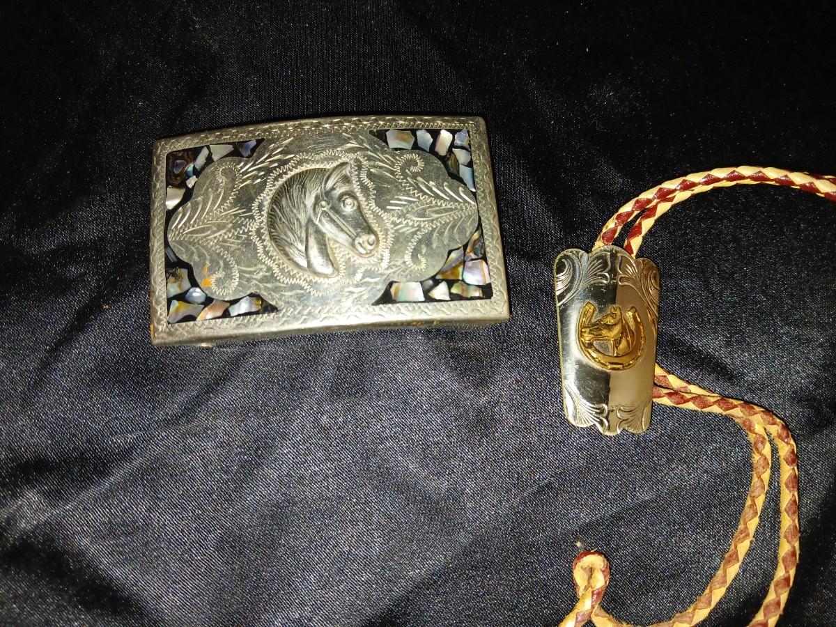 Mexico Alpaca silver toned and abalone inlaid belt buckle featuring a horse head design with a bolo tie clip featuring a horse